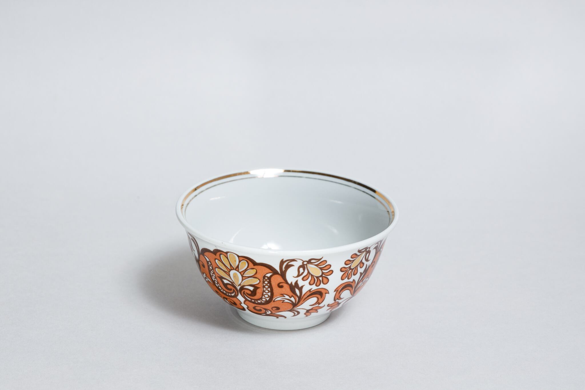 旧ソ連時代に生産された中央アジアではよく見る取っ手のないカップです。中央アジアでは緑茶の飲む時に使います。このカップは、ラトビアのリガ陶器工場で1970年代から80年代に作られたものです。ウズベキスタンの綿花柄をモチーフにしているようですが、ヨーロッパ的な色使いを感じます。他では見られない素敵なカップです。旧ソ連の市場で購入しました。