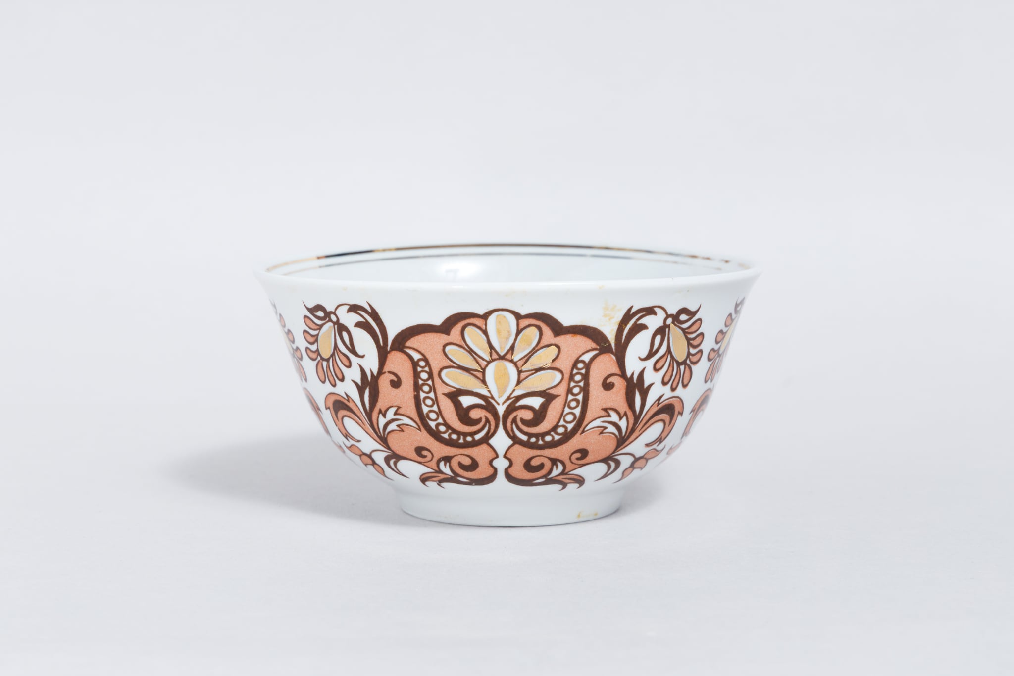 旧ソ連時代に生産された大きめのお茶碗です。お茶用のカップとしては少し大きくどんぶりには小さいサイズのものです。ラトビアのリガ陶器工場で1970年代から80年代に作られたものです。ウズベキスタンの綿花柄をモチーフにしているようですが、ヨーロッパ的な色使いを感じます。他では見られない素敵な大きめのお茶碗です。旧ソ連の市場で購入しました。
