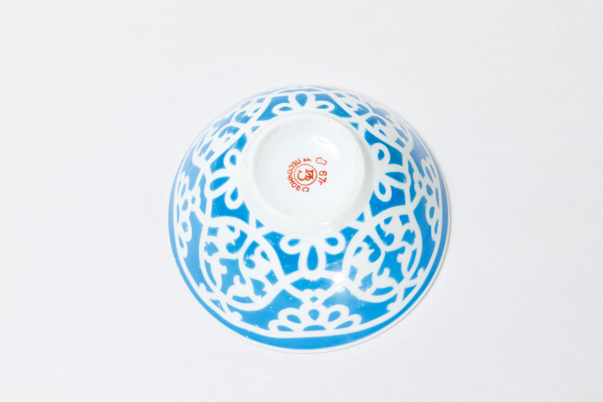また、ソ連製は日本製などと違い、等級によって作りの丁寧さが違い、低い等級の物は、絵付けのムラがあったり、飲み口や底の多少の凹凸などがあったりします。