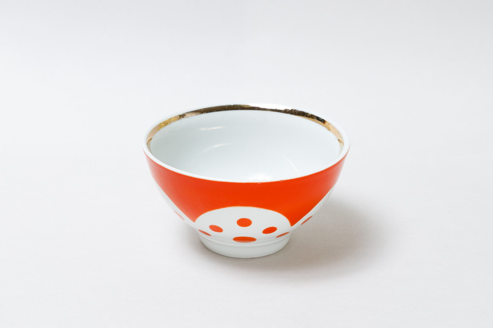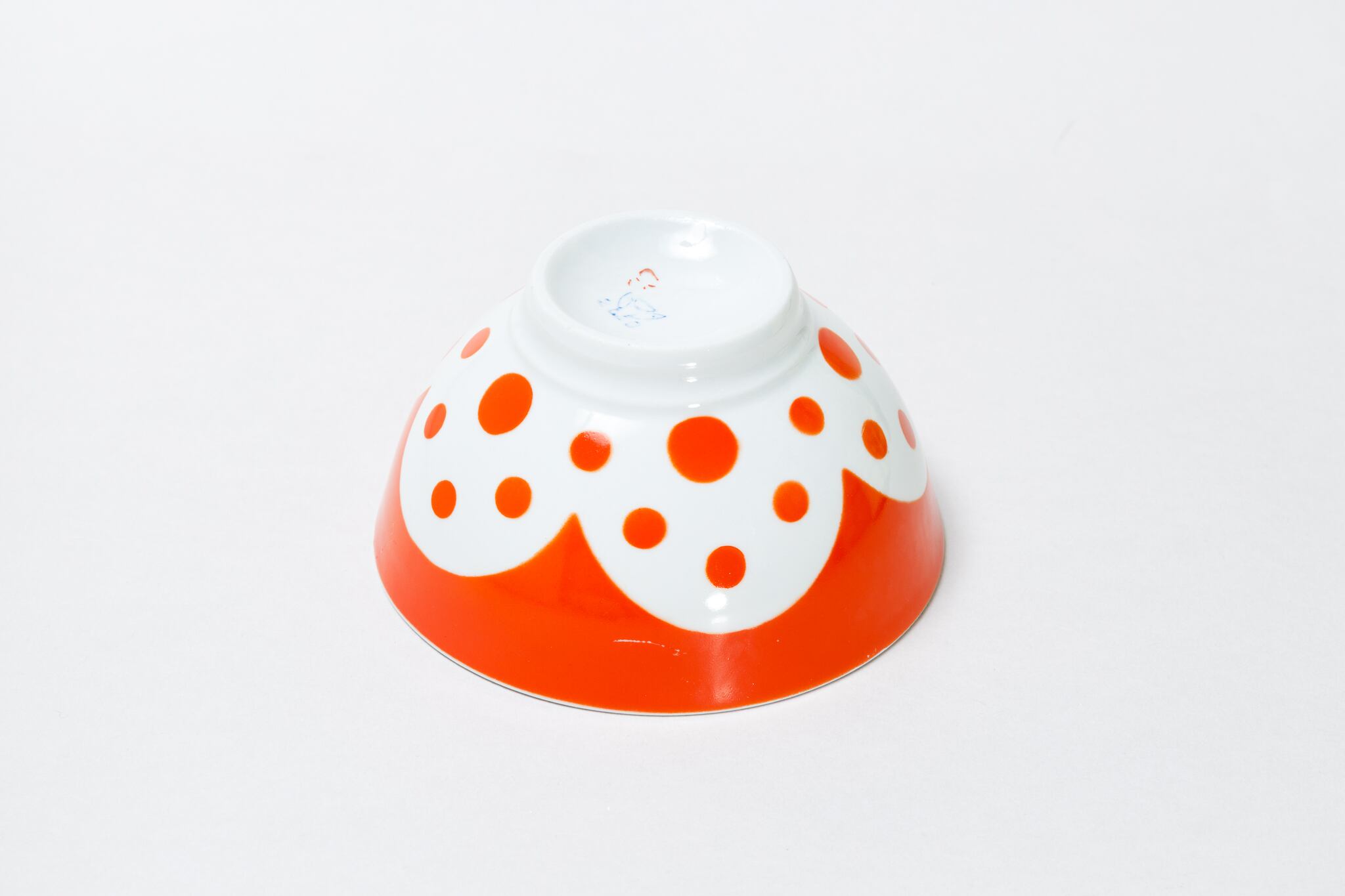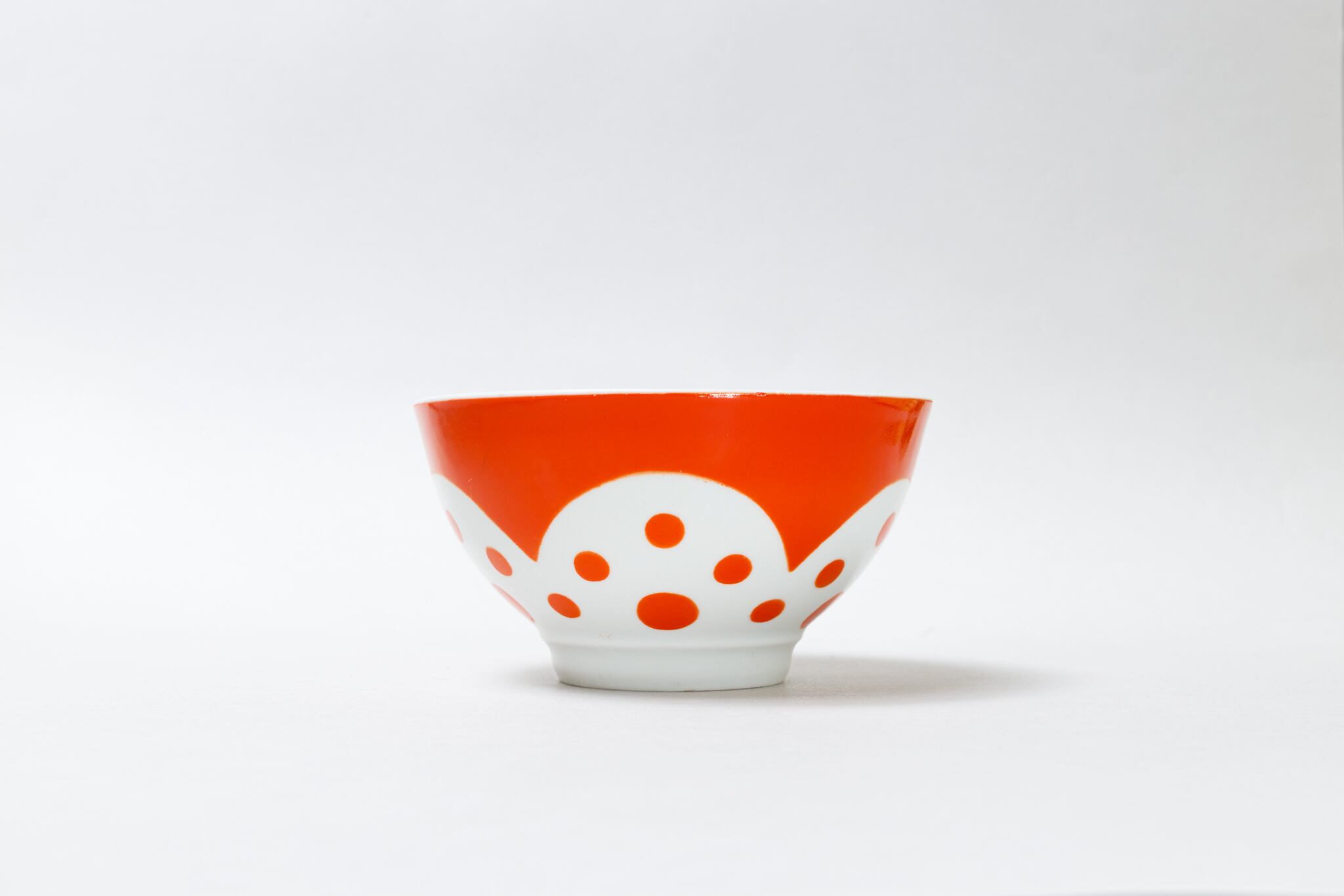 旧ソ連時代に生産されたお茶碗です。お茶用のカップとしては少し大きくどんぶりには小さいサイズのものです。ロシアのヤロスラヴリのピエルヴァマイスキー磁器工場で1976-1991年に作られました。この工場では東洋的な食器をたくさん生産しており、中央アジアの食器の形や柄と似通ったものが多く見られます。このお茶碗の柄は花びらにドットが描かれたタイプのもので中央アジアのものとは一線を画しています。