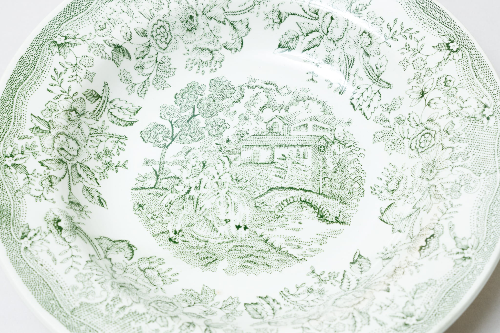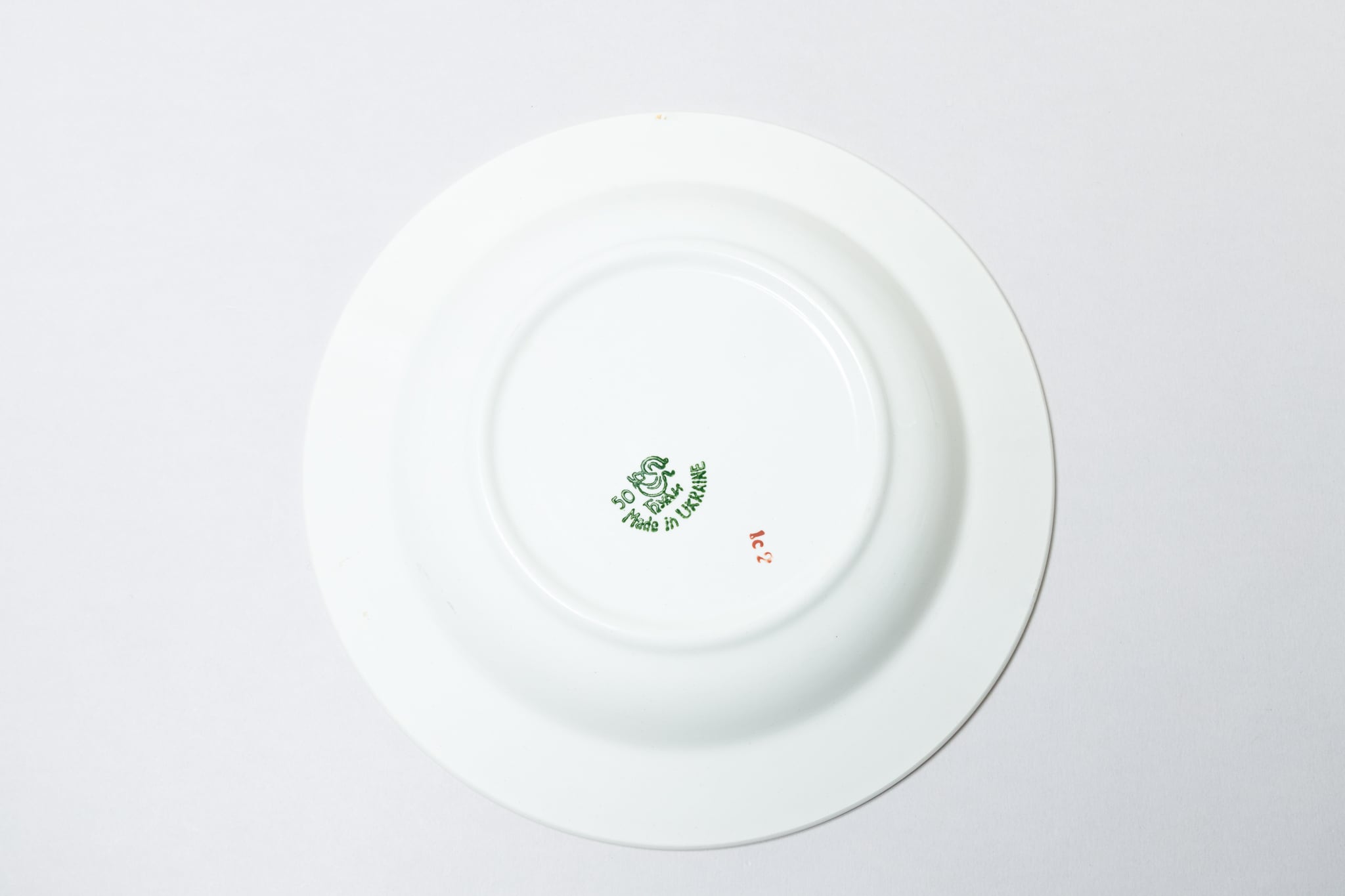 緑と白で宮廷風模様がスープ皿全体に描かれた一品です。とても上品でスープ皿として使うのはもったいない感じがします。宮廷で使っていたような雰囲気が漂っています。ウクライナのハルキウにあるブディ村のブディ陶器工場で1967年から1991年にかけて製造されていたものです。 刻印には英語でMade in Ukraine と書かれています。旧ソ連の市場で購入しました。