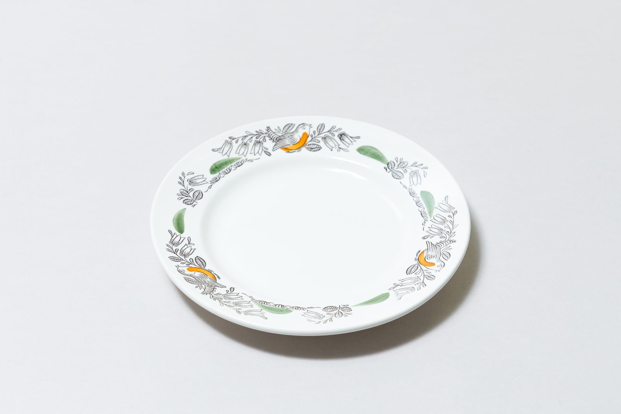 ヴィンテージの小鳥柄の小皿です。草花にとまっている小鳥が描かれています。塗り絵のような緑とオレンジが差し色となり全体を華やかな印象にしています。ロシアのトヴェリ州コナコヴォ陶器工場で1974-1991年に製造されました。コナコヴァらしい優しい色合いと素朴な風合いが素敵です。旧ソ連の市場で購入しました。