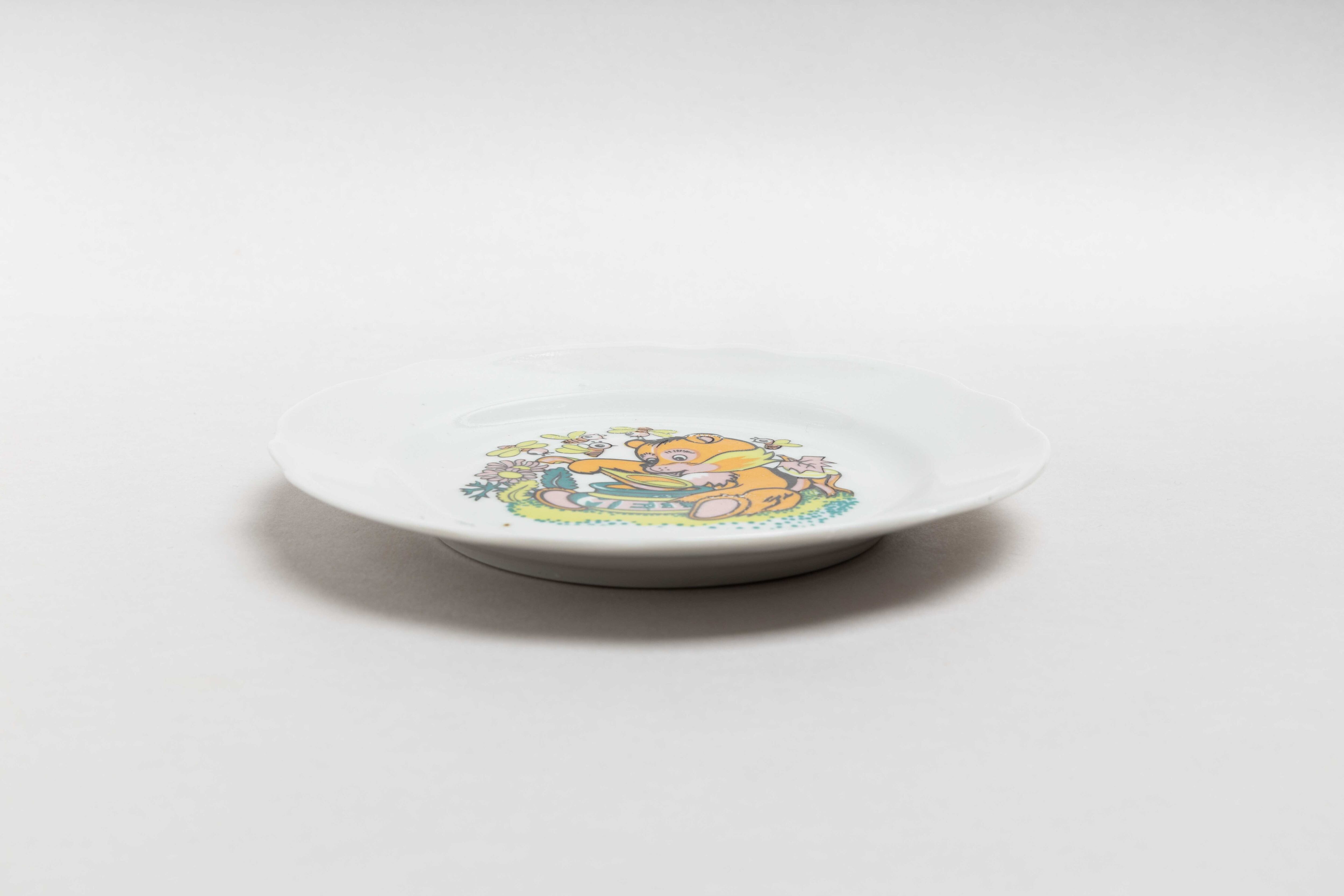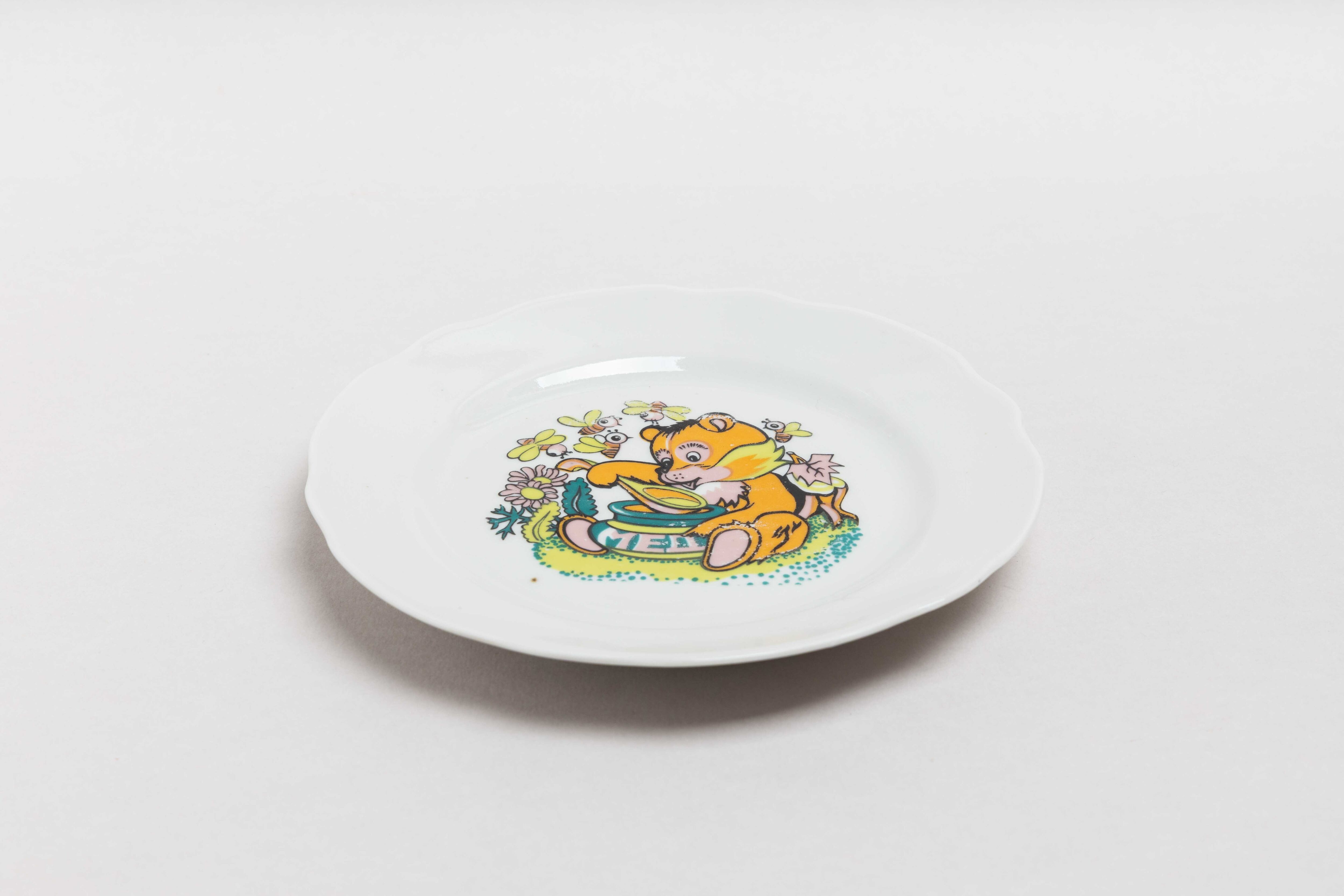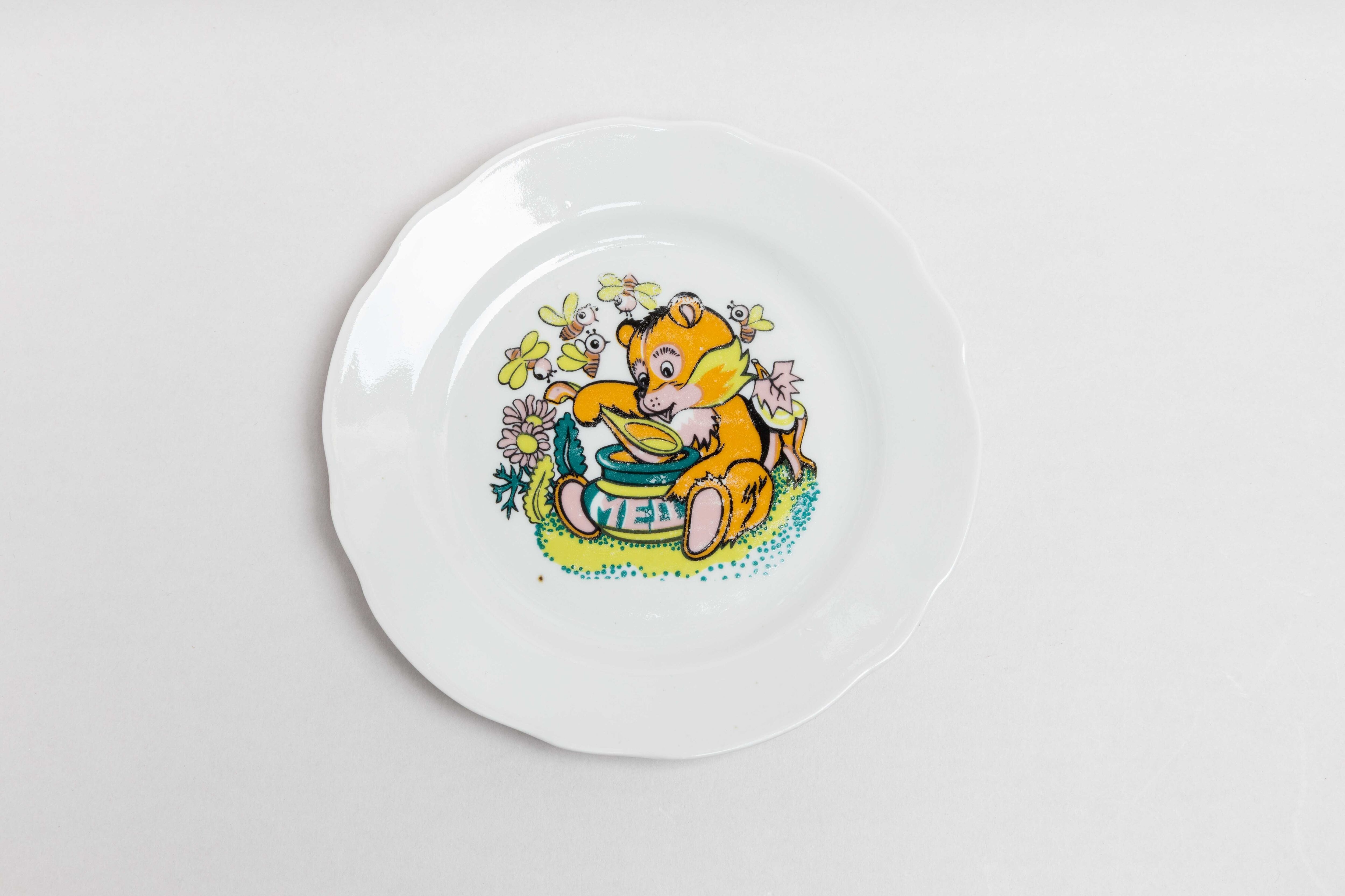 旧ソ連時代に生産されたヴィンテージのお皿です。ウクライナのゴロドニツキー磁器工場で作られました。ゴロドニツキー磁器工場では、子どもの絵本をモチーフにした陶器がたくさん作られていました。このお皿にも蜂蜜を食べる熊さんがカラフルに可愛らしく描かれています。インテリアにしても素敵です。旧ソ連の市場で購入しました。
