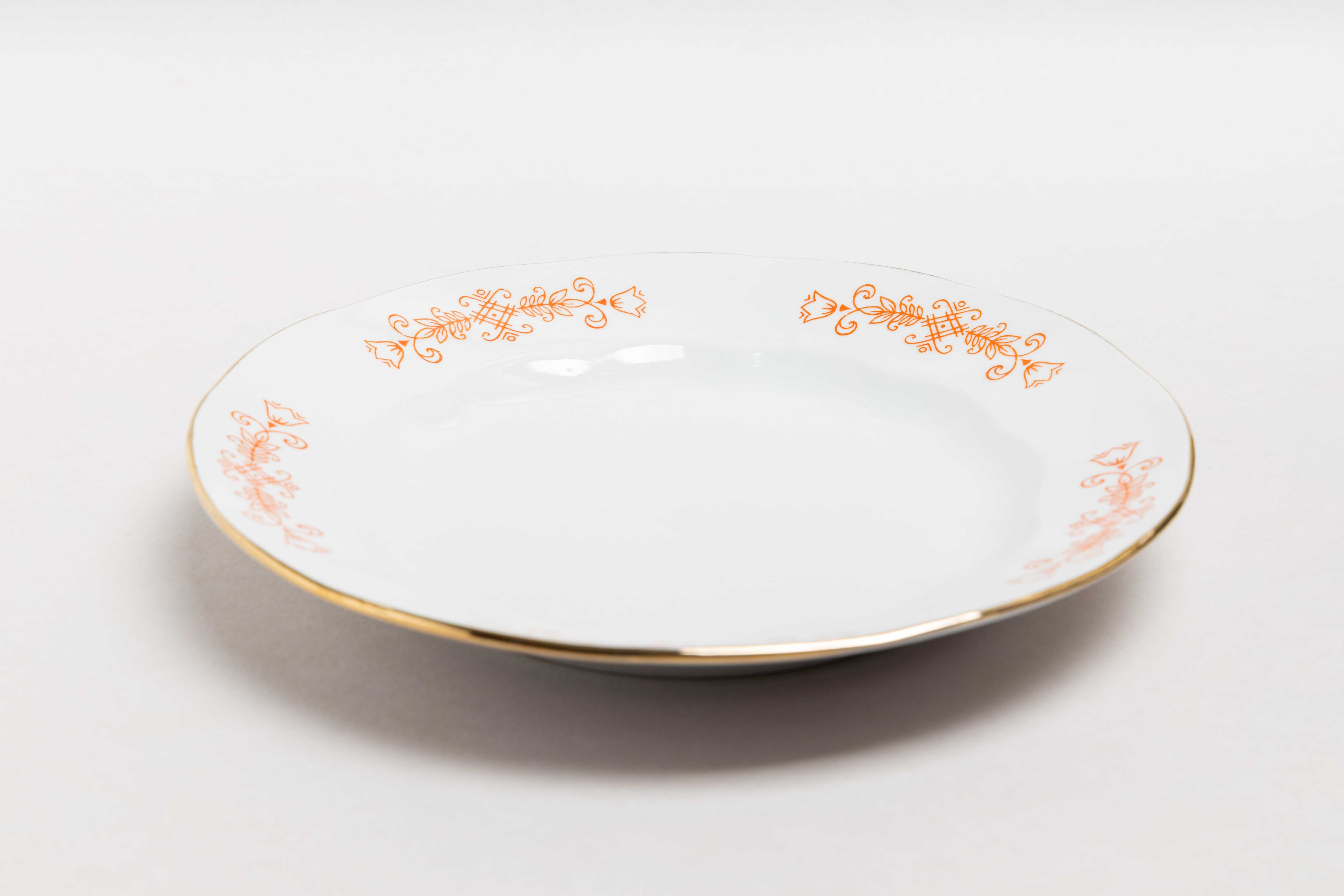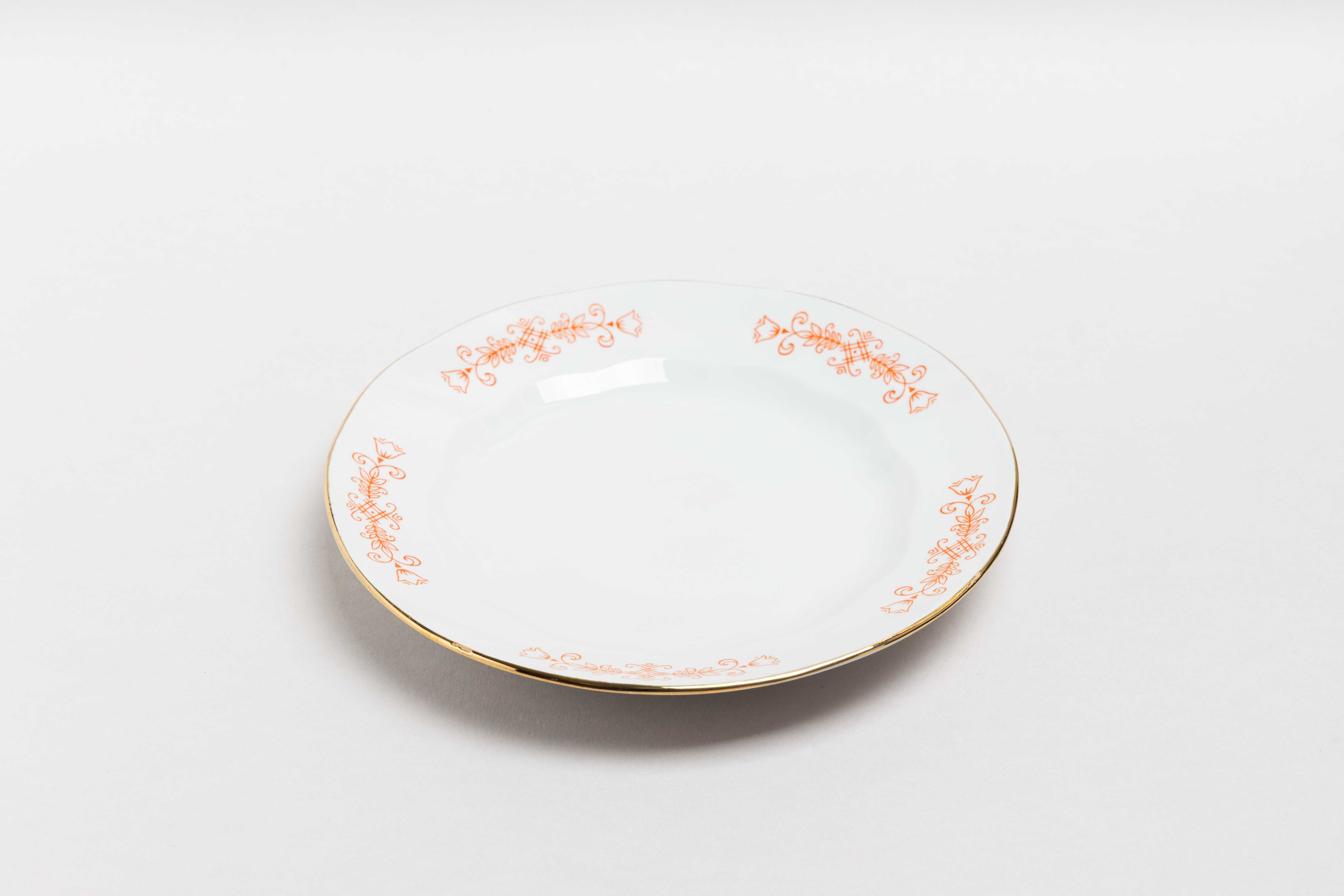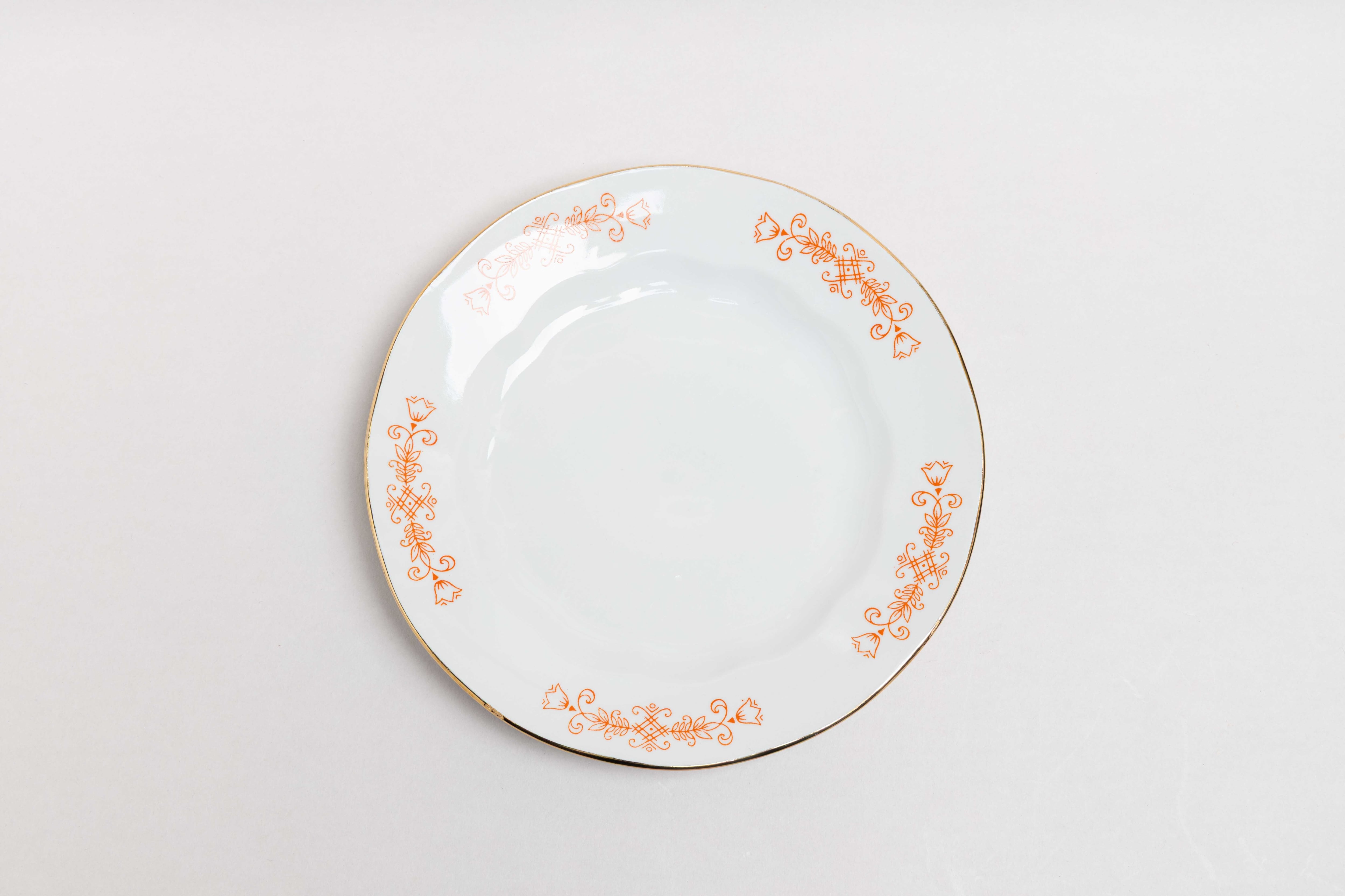 ヴィンテージのお皿です。お皿の縁がオレンジの可愛らしいお花で彩られた素敵な一皿です。このお皿はラトビアのリガ陶器工場で1970-1980年代に製造されました。旧ソ連の市場で購入しました。