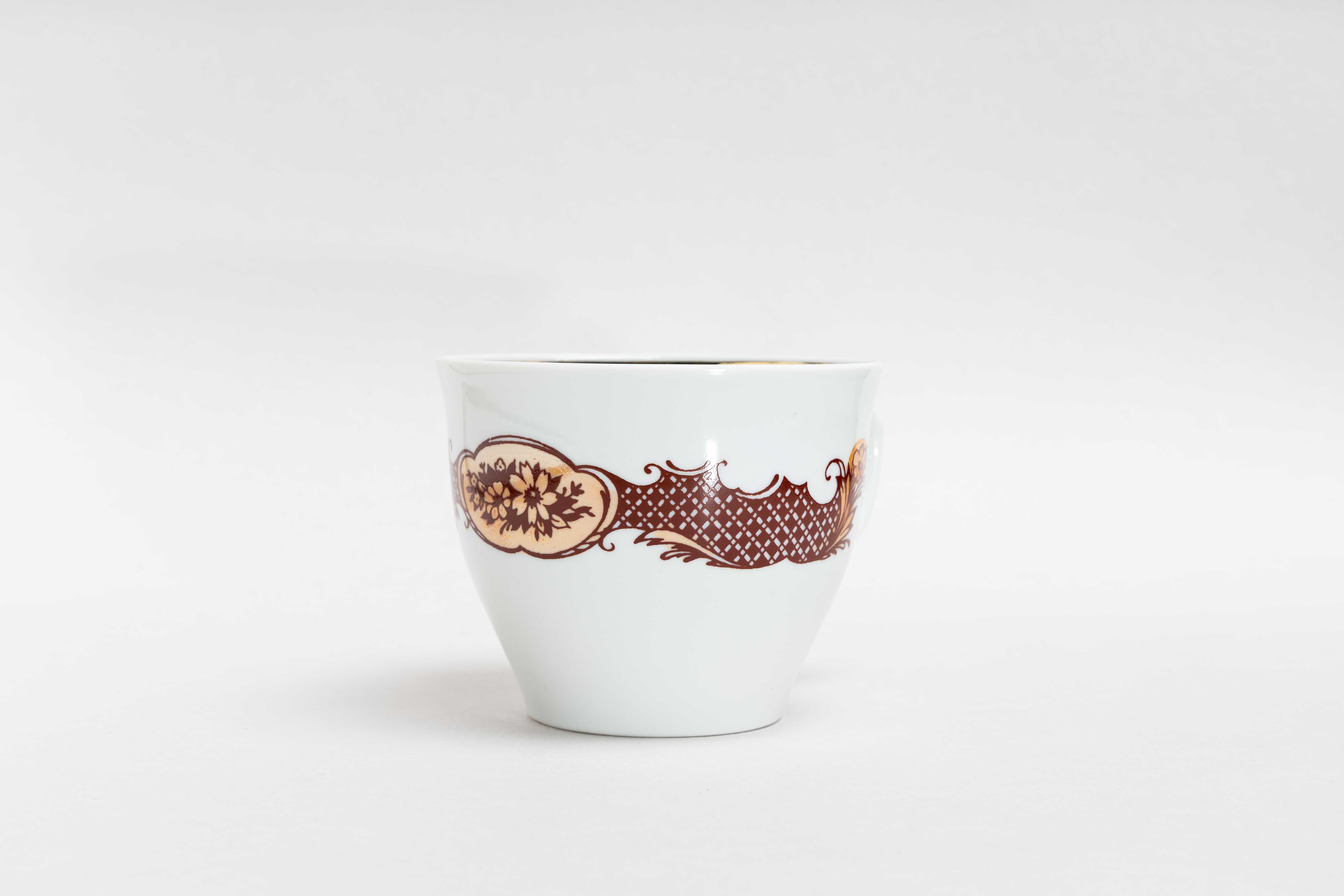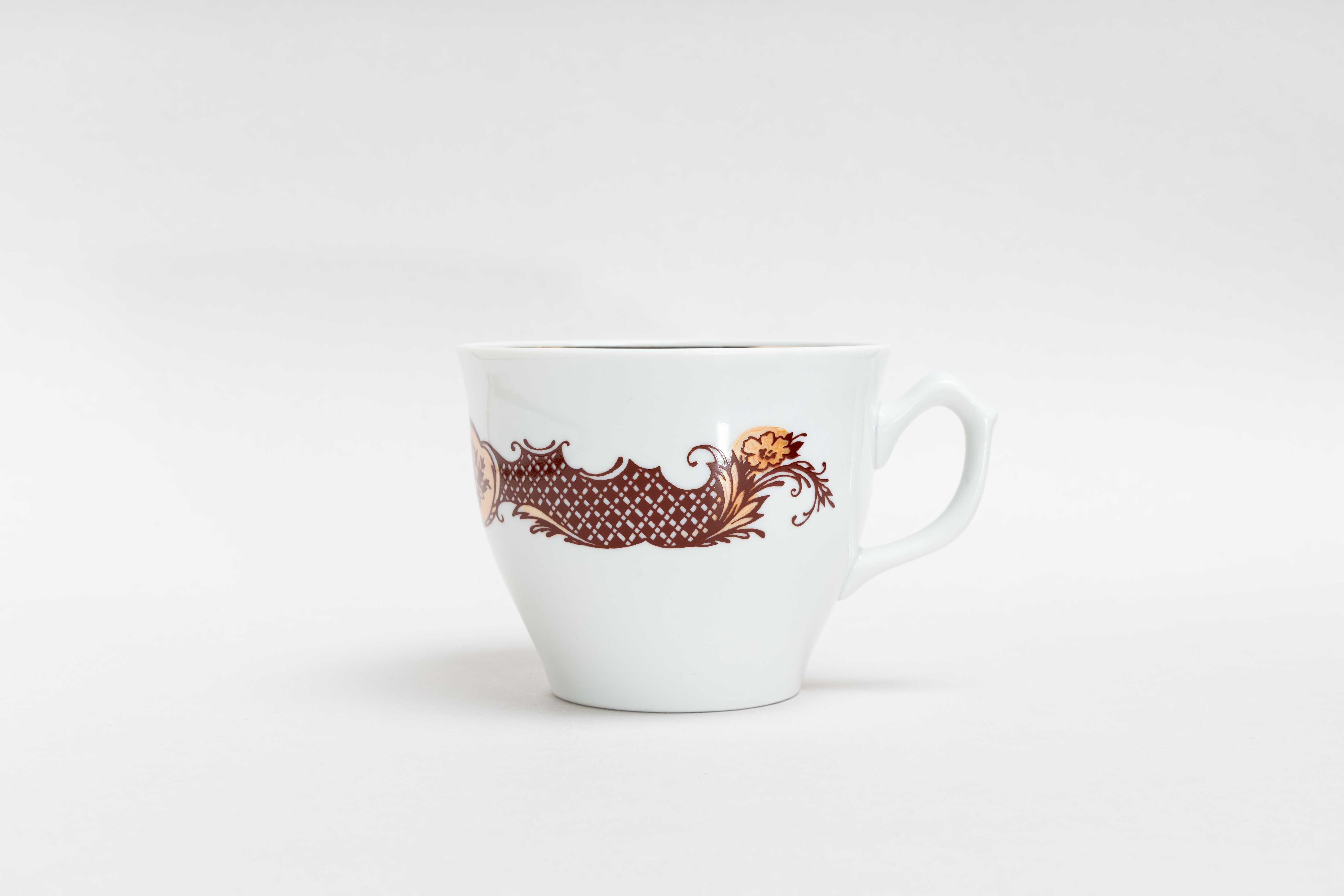 ヴィンテージの大きめのカップです。旧ソ連時代に生産されたものです。白地のカップ側面に茶色とオレンジのお花が描かれそれを左右のネットリボンが繋いでいます。また飲み口は2重金彩で彩られています。シンプルなのにエレガントな感じがします。この大きめのカップは薄いピンクベージュやピンクなどの食堂風のお皿を作っていたボグダノビッチ磁器工場のものです。少し雰囲気が違いますよね。ボグダノビッチ磁器工場はロシアのスヴェルドロフスクにありました。このカップは1973-1991年に製造されました。旧ソ連の市場で購入しました。