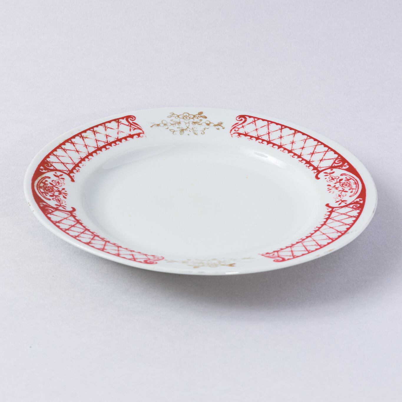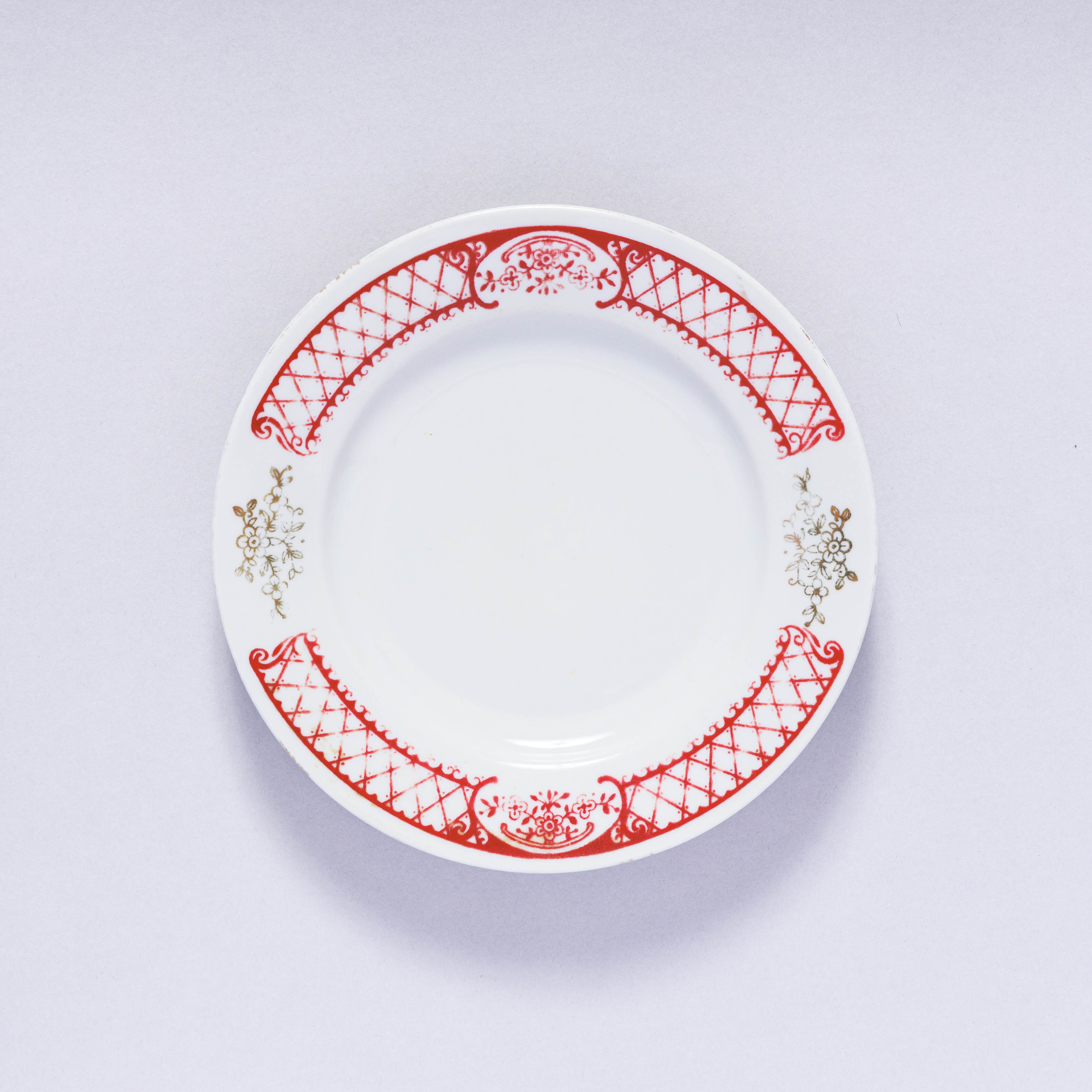 ヴィンテージのお皿です。旧ソ連時代に生産された植物等をモチーフとした幾何学模様柄のレトロなプレートです。 赤と金彩の組み合わせは目を引きつけます。ウクライナのジトミール州のバラ二フカ磁器工場で1970年代から1991年に製造されました。旧ソ連の市場で購入しました。