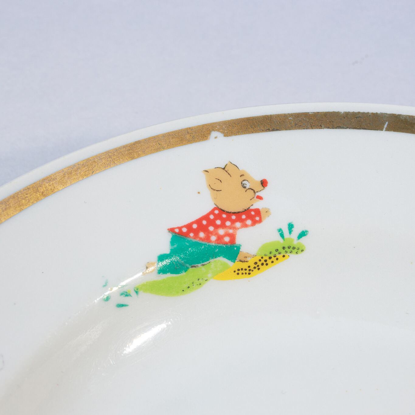 ヴィンテージのお皿です。旧ソ連時代に生産された三匹の子豚の挿絵が描かれています。子ども用のスープ皿だったようです。今でも人気のあるビンテージ商品です。ロシアのノブゴロドのプロレターリ磁器工場で1976-1991年に製造されました。 旧ソ連の市場で購入しました。