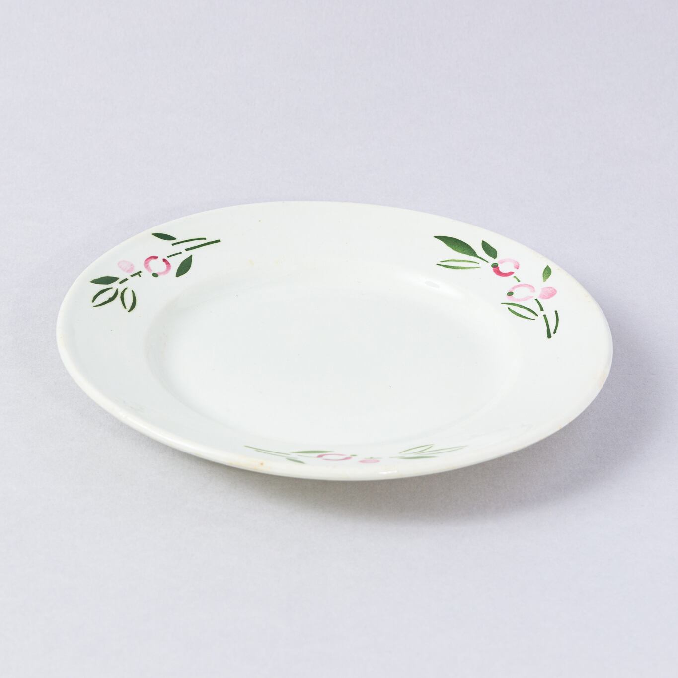 旧ソ連時代に生産された植物等をモチーフとした幾何学模様柄のレトロな皿です。年代が古く、希少価値の高い物です。かなり抽象化された花柄が他にない印象です。ロシアのトヴェリ州コナコヴォ陶器工場で1962-1974 年に製造されました。 旧ソ連の市場で購入しました。