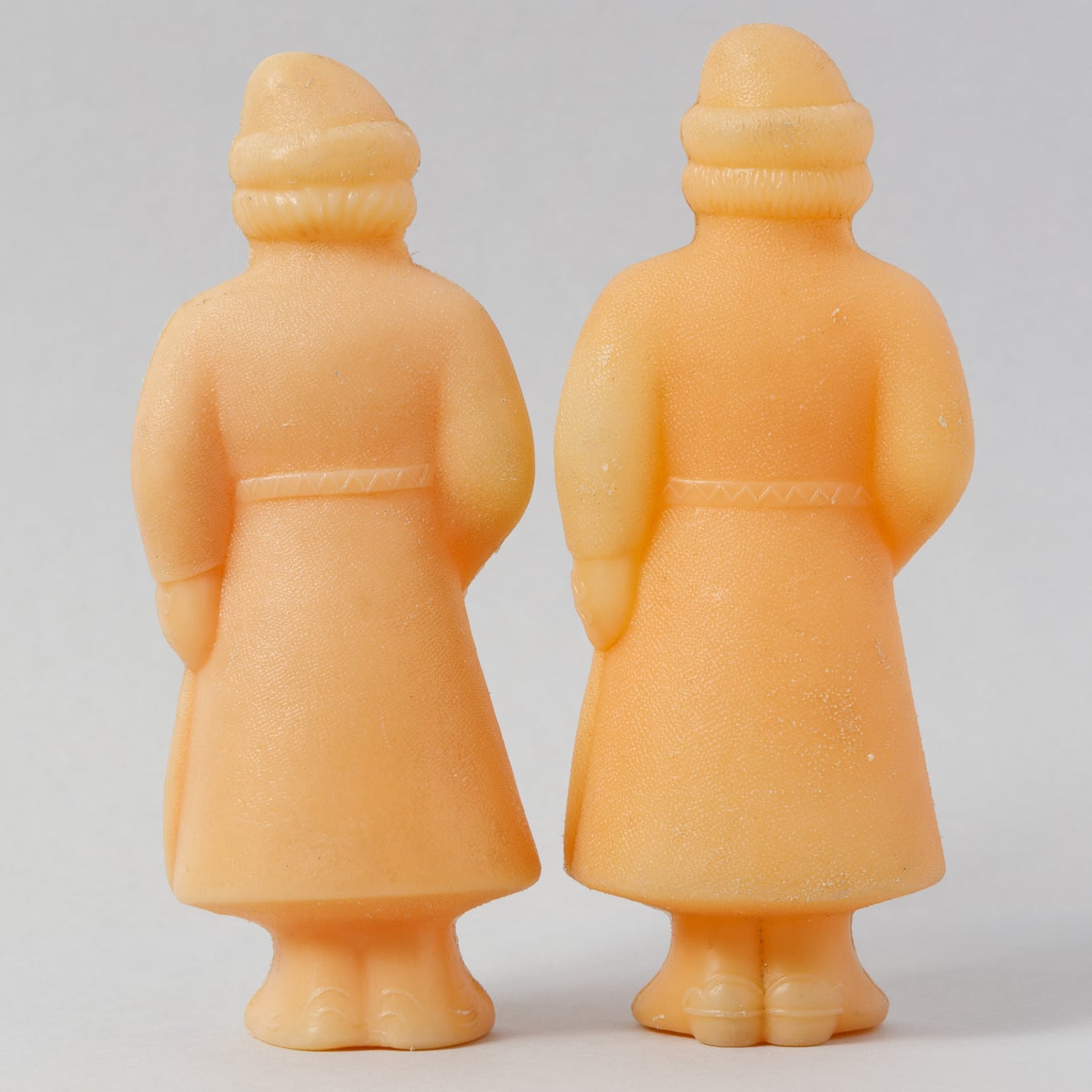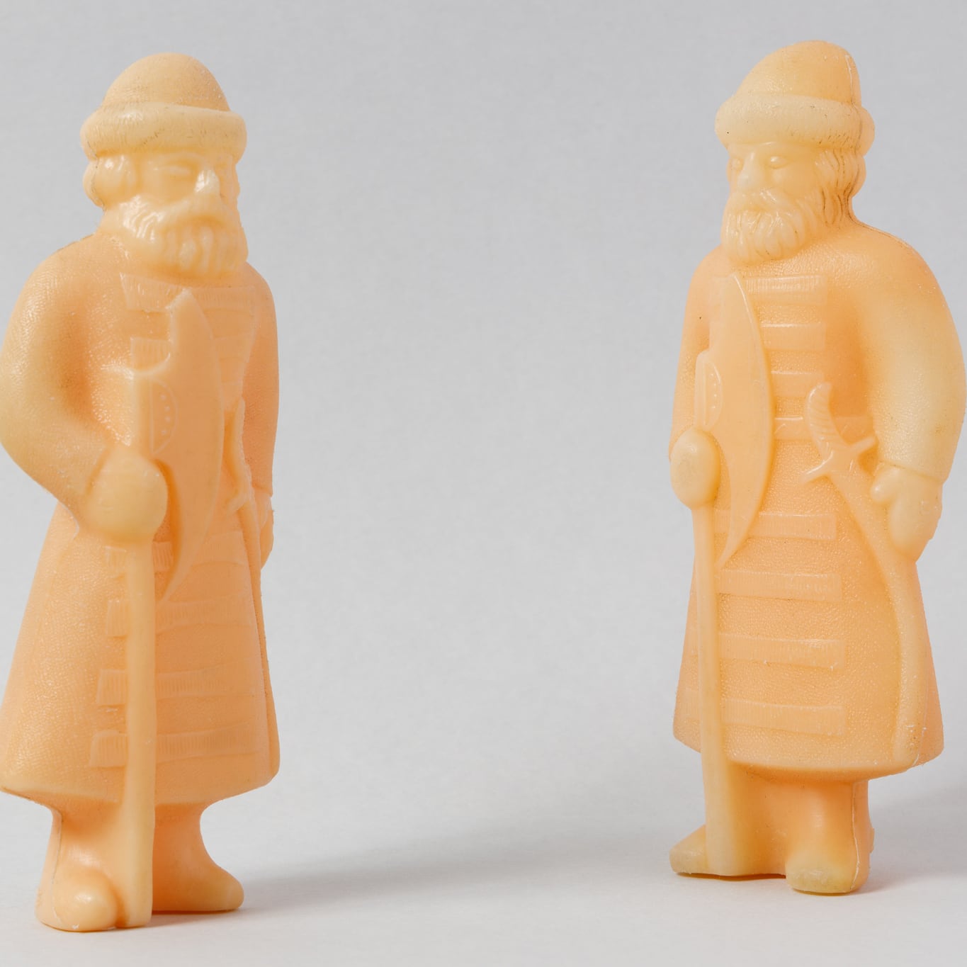 騎士モチーフの人形です。髭が生えており屈強な印象です。斧と剣を持っています。同じデザインですが少し背丈が違います。旧ソ連製のプラスチックの人形です。旧ソ連の市場で購入しました。