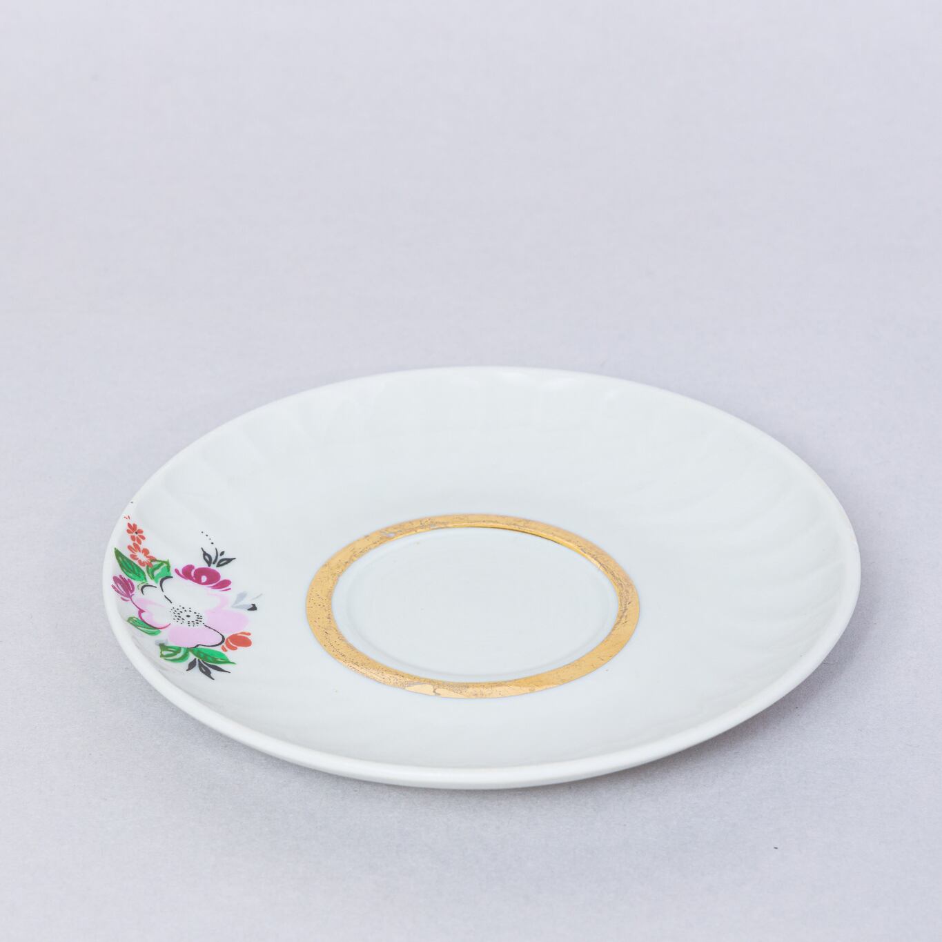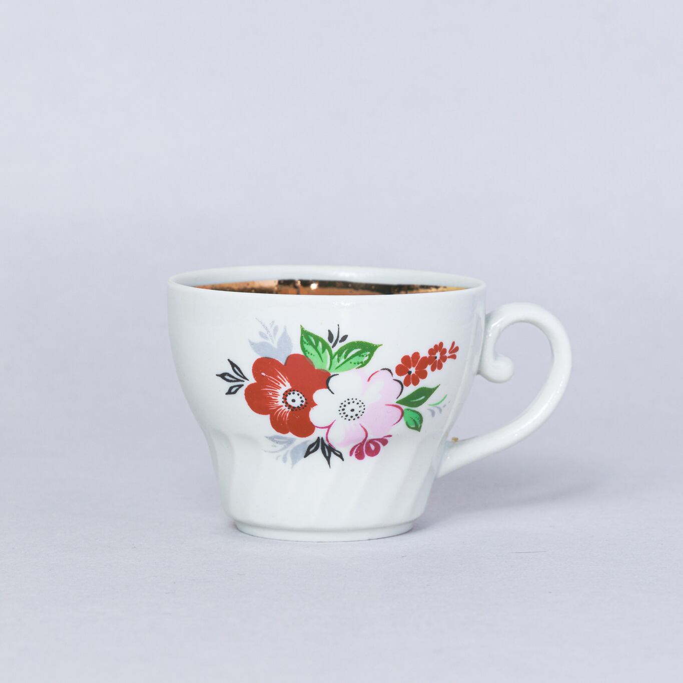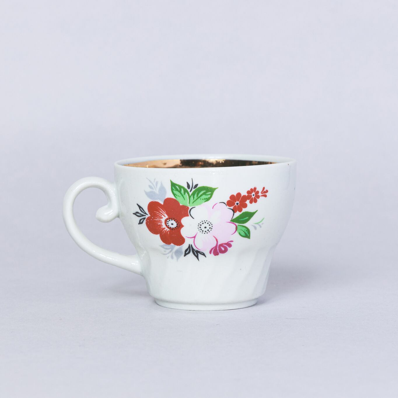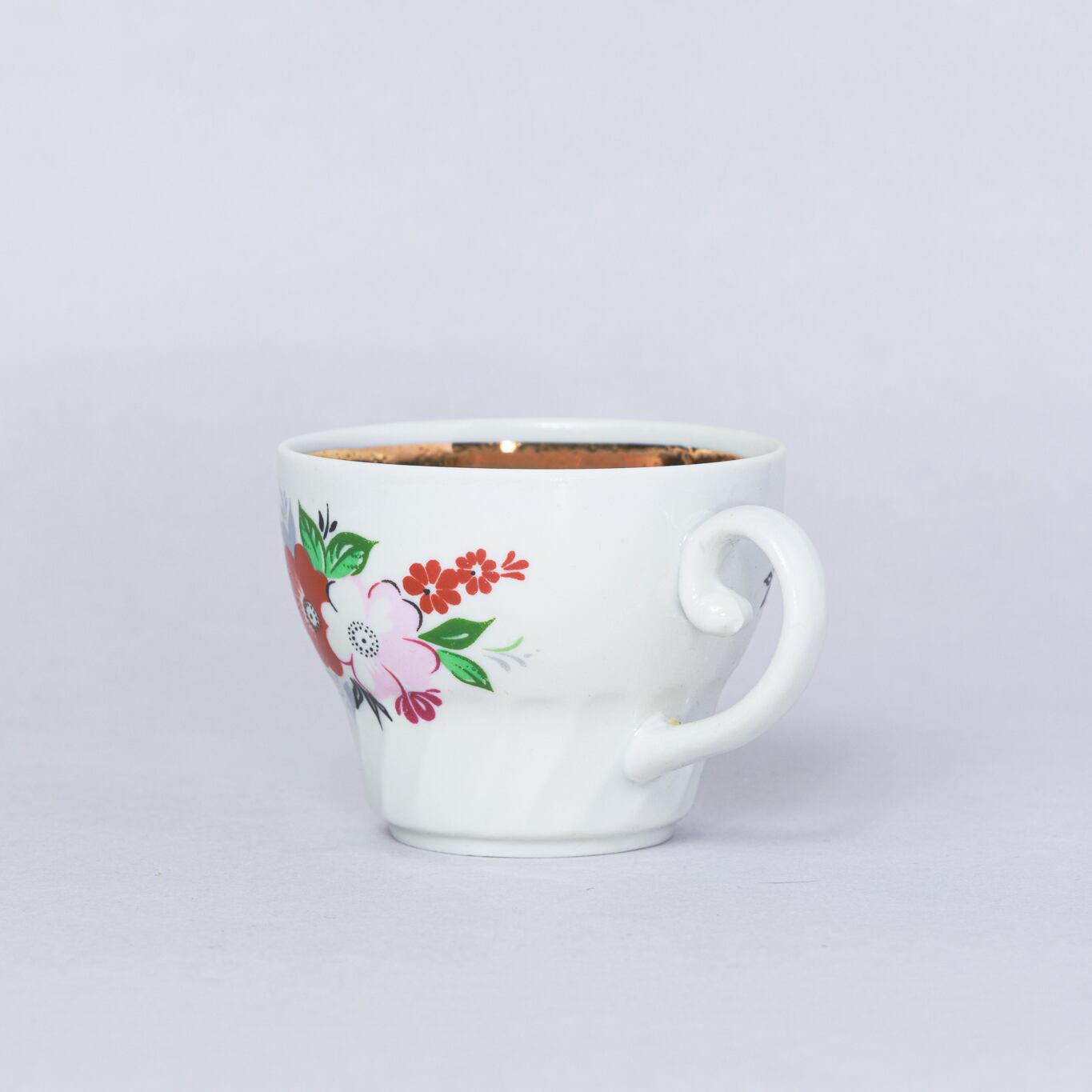 ヴィンテージデミカップ&ソーサーです。旧ソ連時代にベラルーシゴメリ州にあるドブルシュ磁器工場で生産されました。花と縁の金彩が上品です。旧ソ連の市場で購入しました。