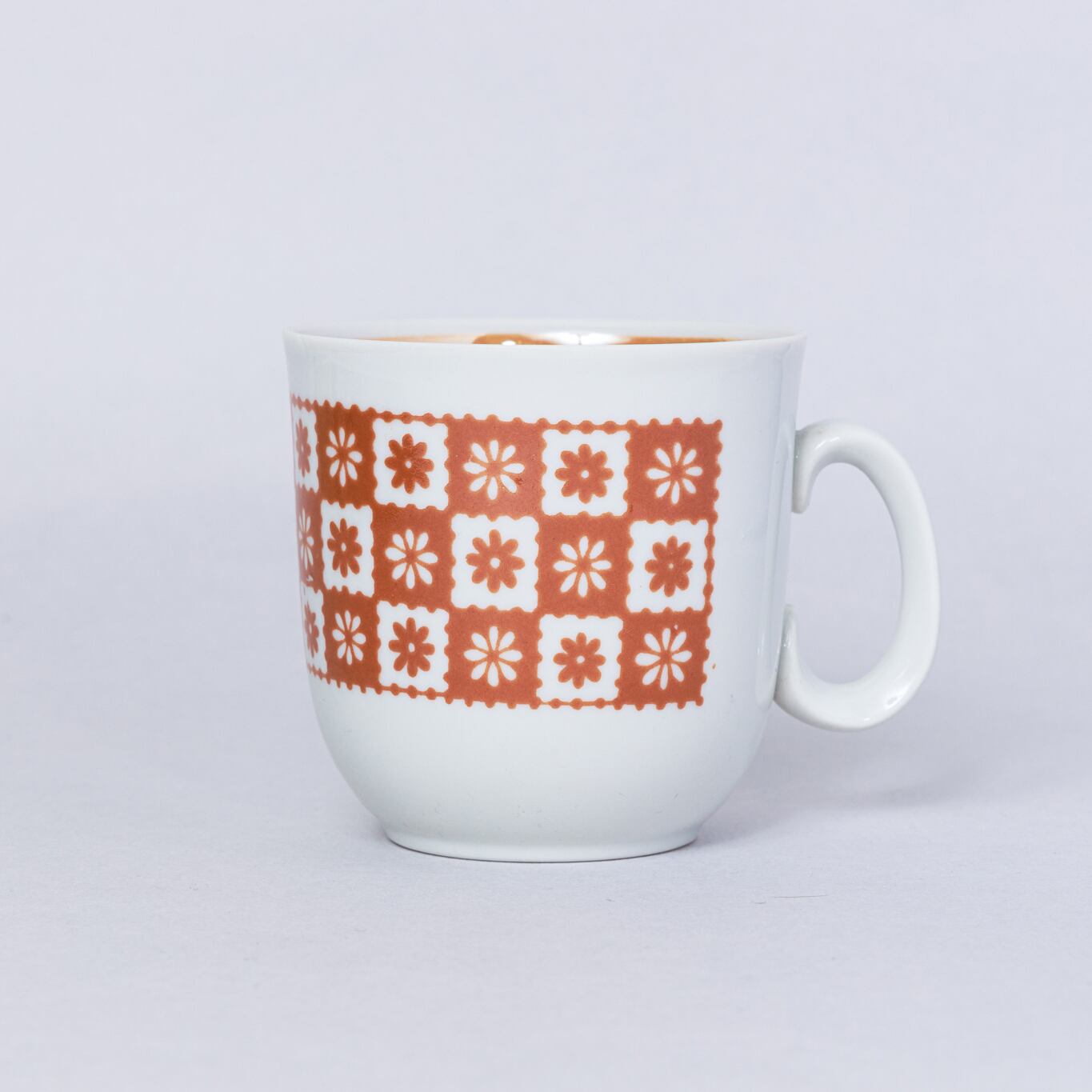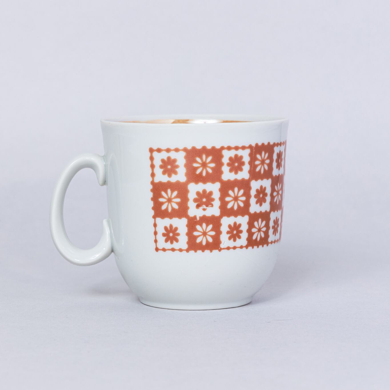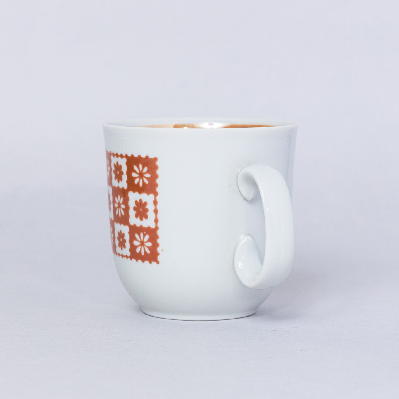 ヴィンテージカップです。旧ソ連時代に生産されたポップな印象のカップです。小さな花がスタンプのように整然と配置されており独特な雰囲気を持っています。手が逆さまに付けられたようなアンバランスの中に可愛らしさがあります。ロシアのボクダノビッチ磁器工場で1973-1991年に製造されました。旧ソ連の市場で購入しました。