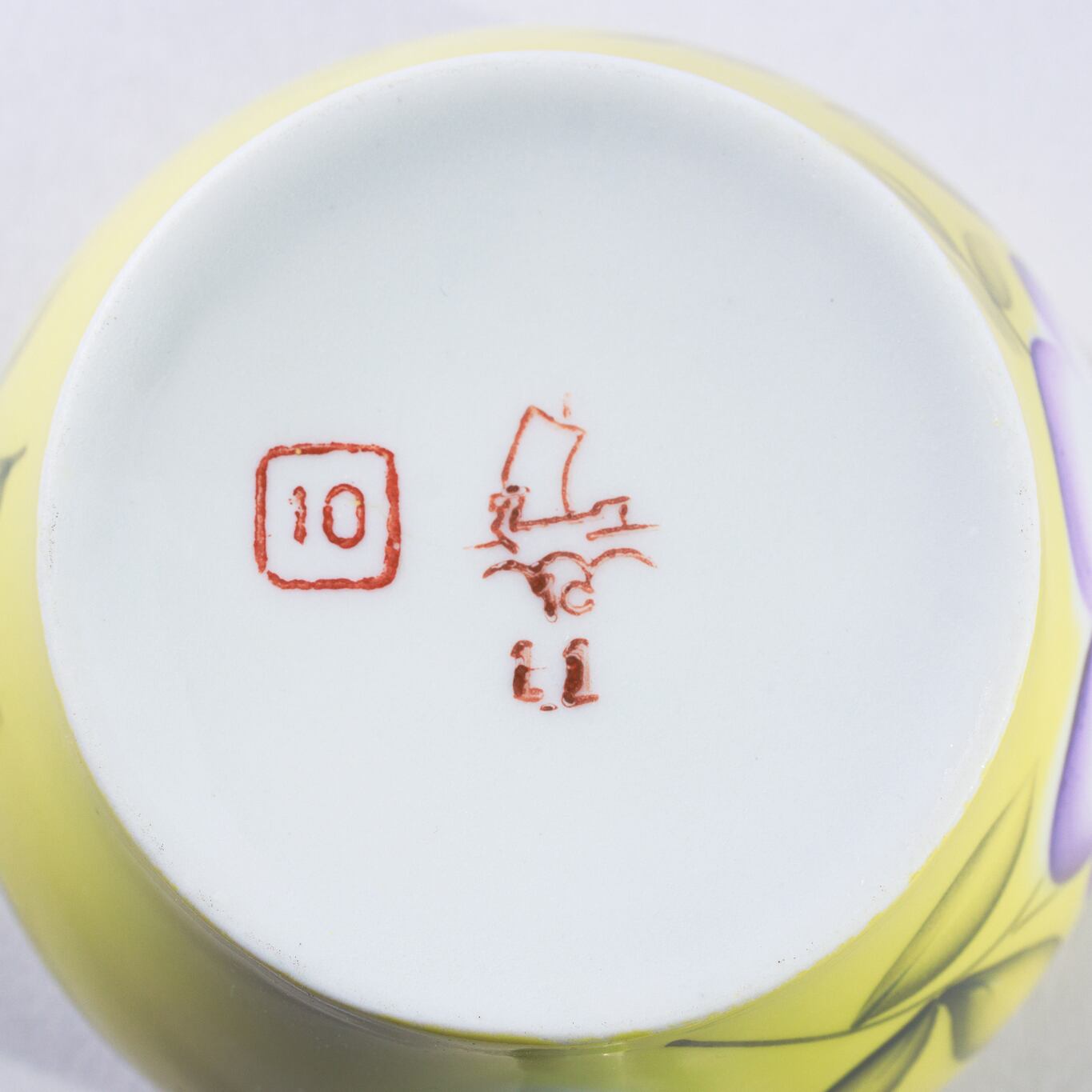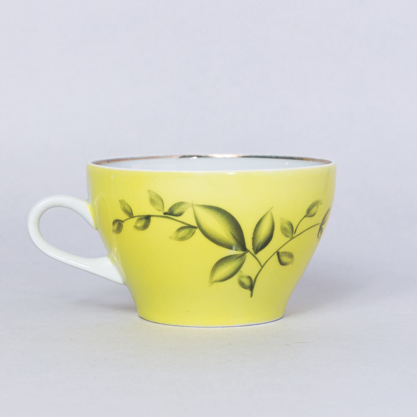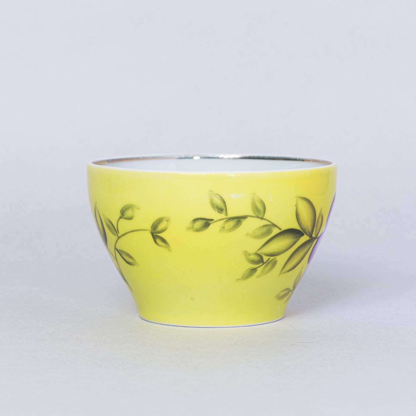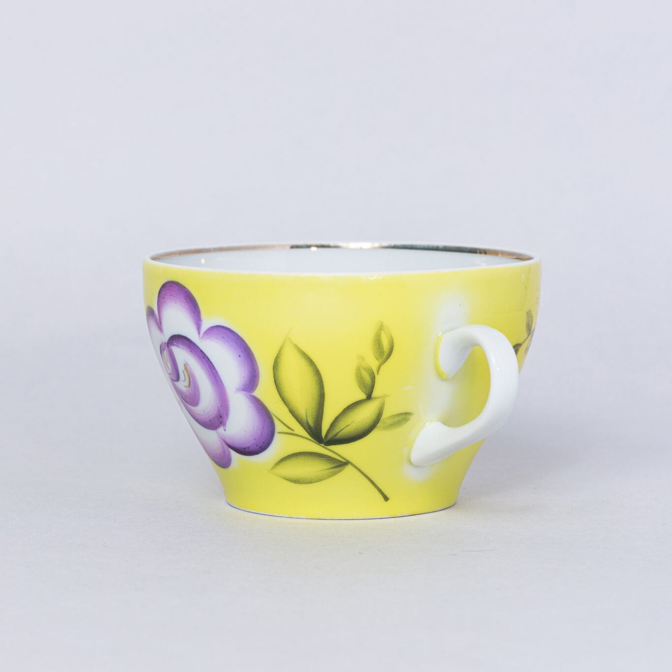 ヴィンテージのカップです。旧ソ連時代に生産された幾何学的な花柄のカップです。黄色と紫のコントラストが素敵です。ロシアのノブゴロドのプロレターリ磁器工場で1967-1975年に製造されました。プロレターリ陶器工場の中でも比較的製造年代が古く希少価値のあるものです。 旧ソ連の市場で購入しました。