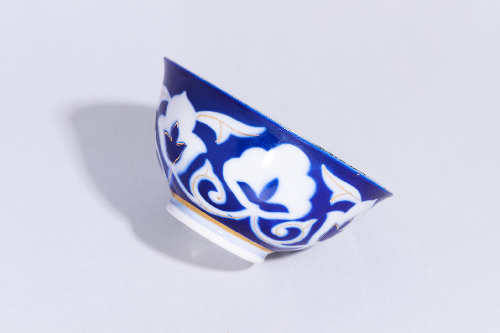 旧ソ連時代に生産された中央アジアでよく使われている取っ手のないヴィンテージのカップです。 ウズベキスタンのタシケント磁器工場で1973-1991年に製造された物です。 ウズベキスタンでよく見る白と紺の綿花柄模様の食器です。現行品で同じデザインの物もありますが、こちらはソ連時代の物で希少です。エスニックな雰囲気がとても素敵です。お菓子入れなどに良さそうです。旧ソ連の市場で購入しました。