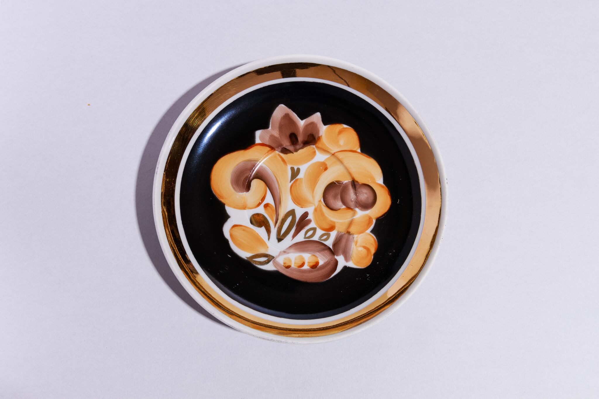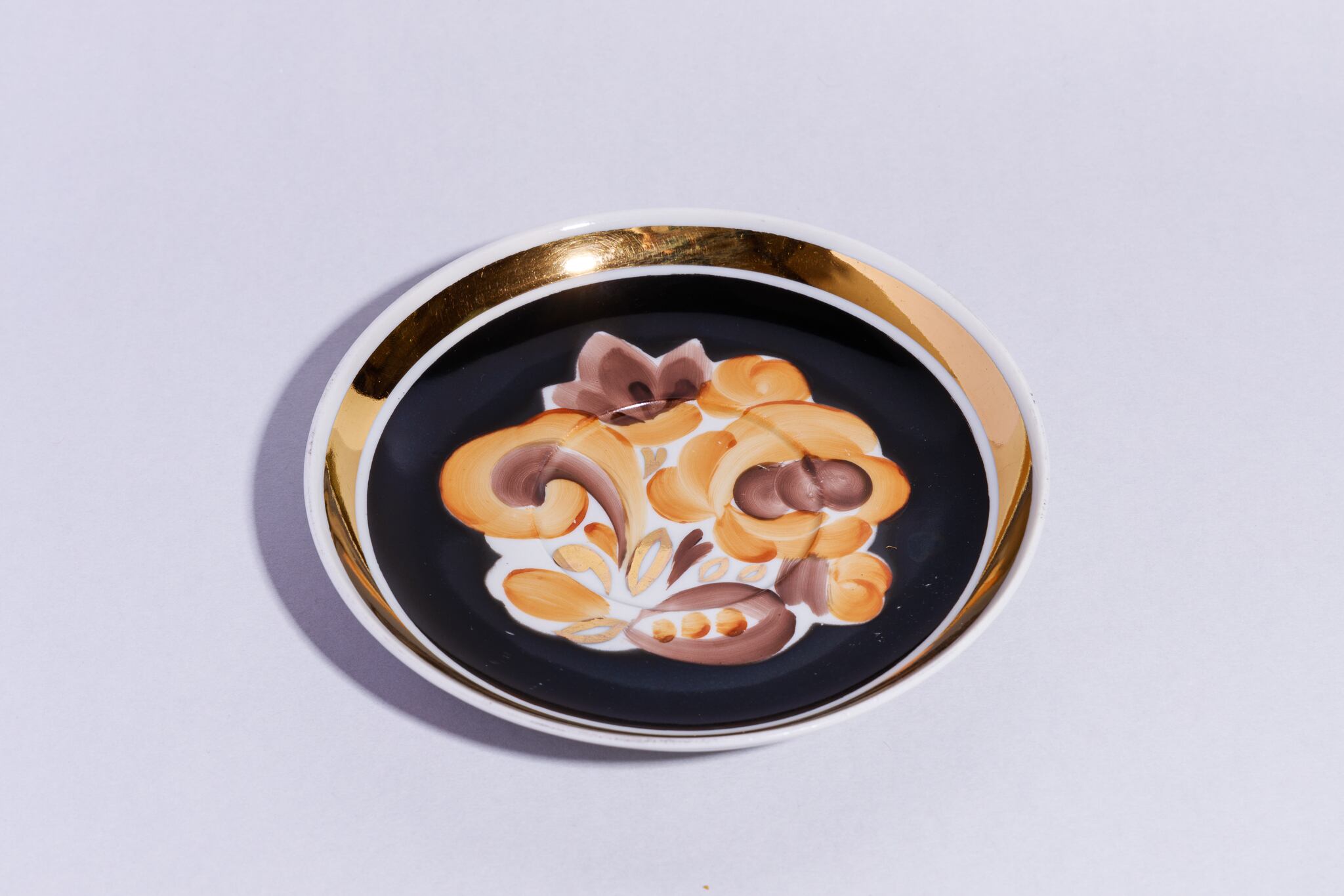 旧ソ連時代に生産されたヴィンテージのプレートです。 茶色ベースの抽象的な花が描かれています。全体を引き締める黒バックはとても珍しいお品です。ロシアのモスクワ近くのドゥリョーヴォ磁器工場で1965年に製造されました。旧ソ連の市場で購入しました。