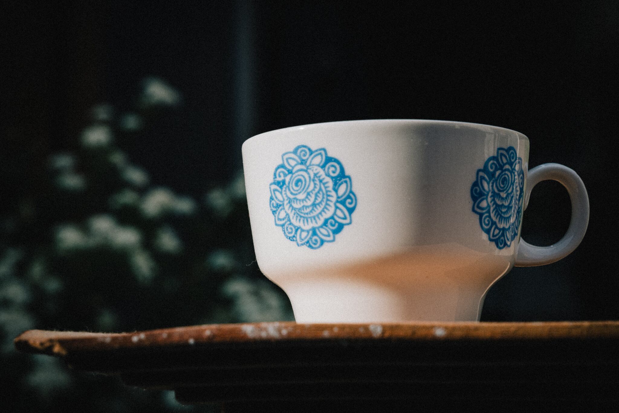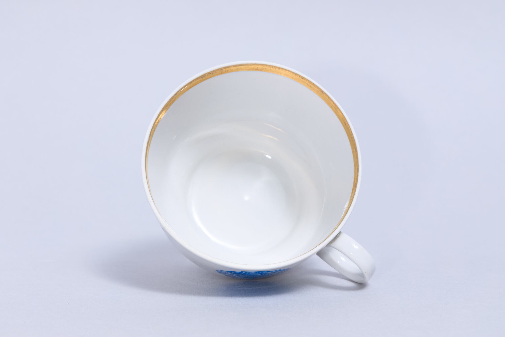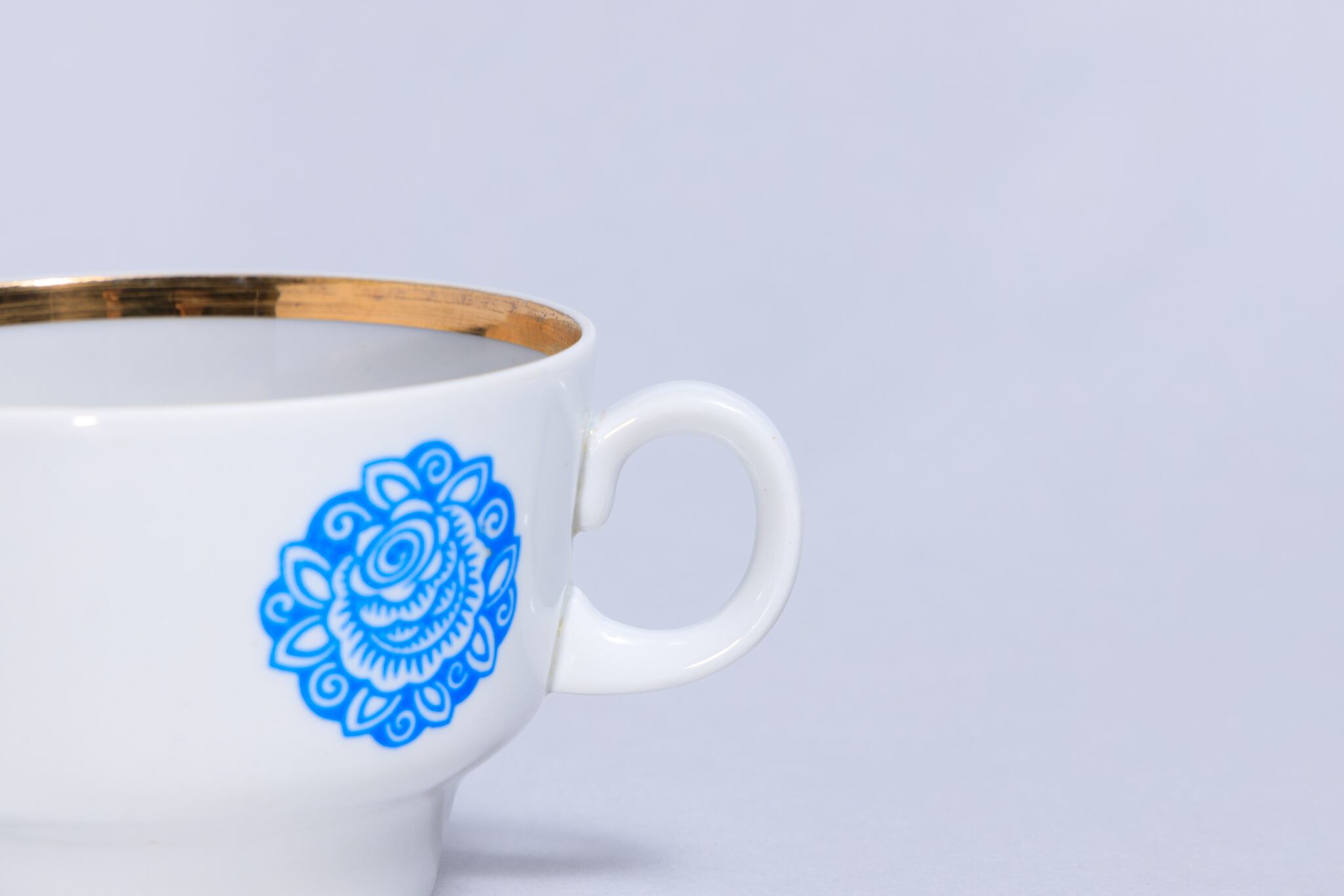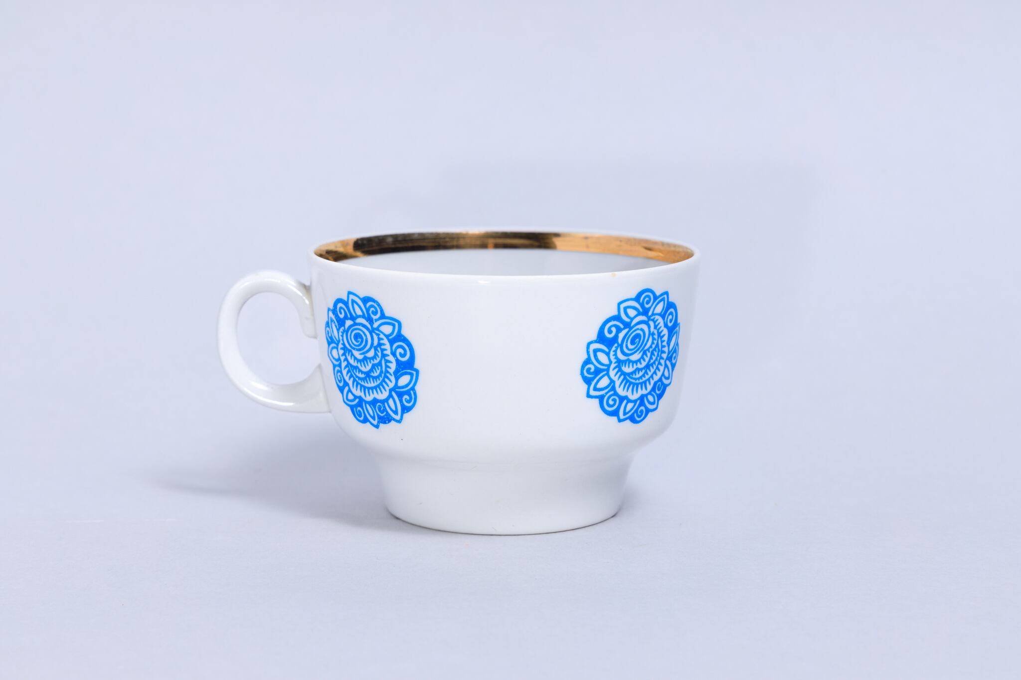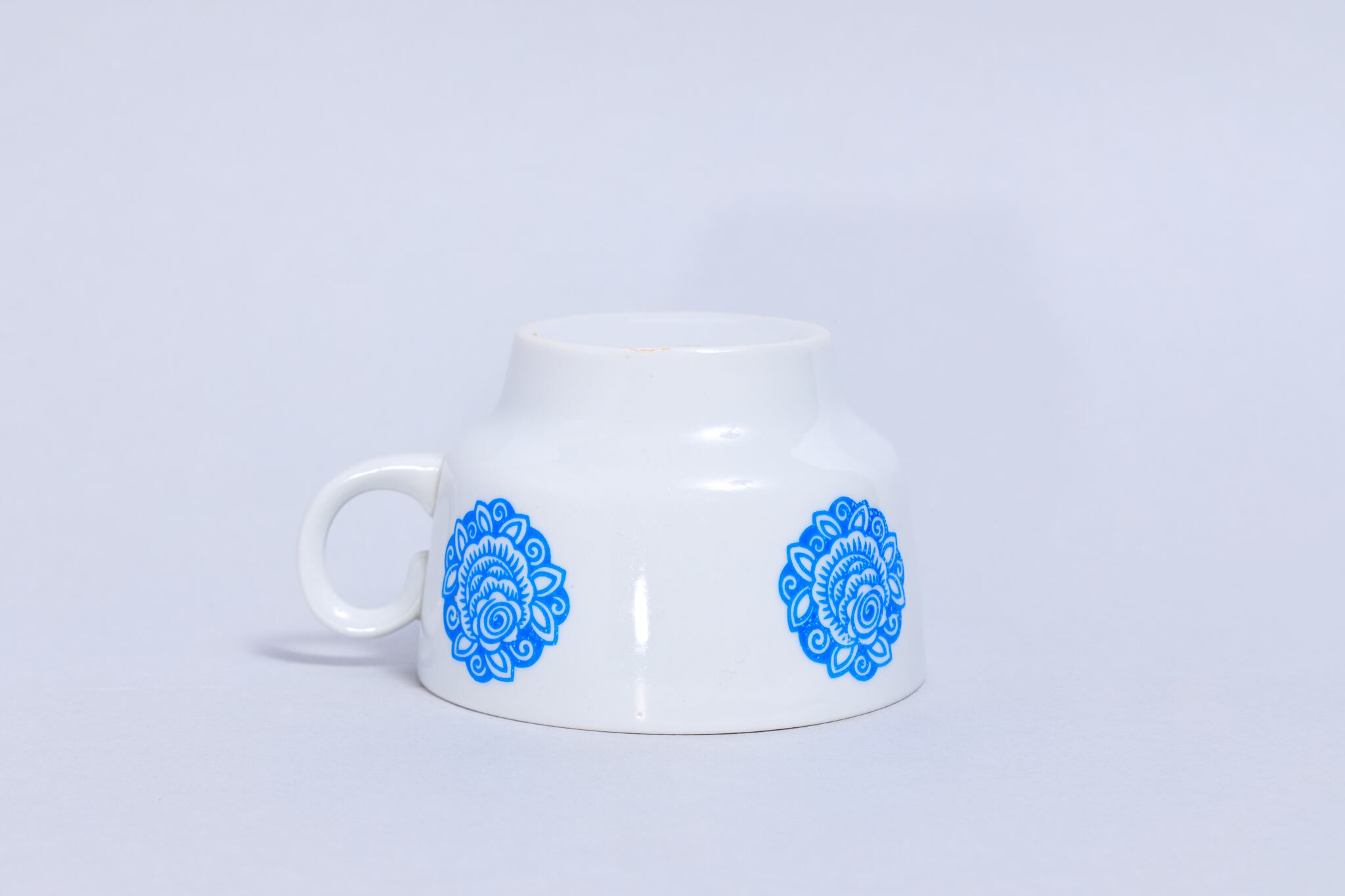 旧ソ連時代に生産されたヴィンテージのカップです。円形にデザインされた、エンブレムのようなブルーの花が描かれています。 ロシアのノブゴロドのプロレターリ磁器工場で1967-1975年に製造されました。旧ソ連の市場で購入しました。