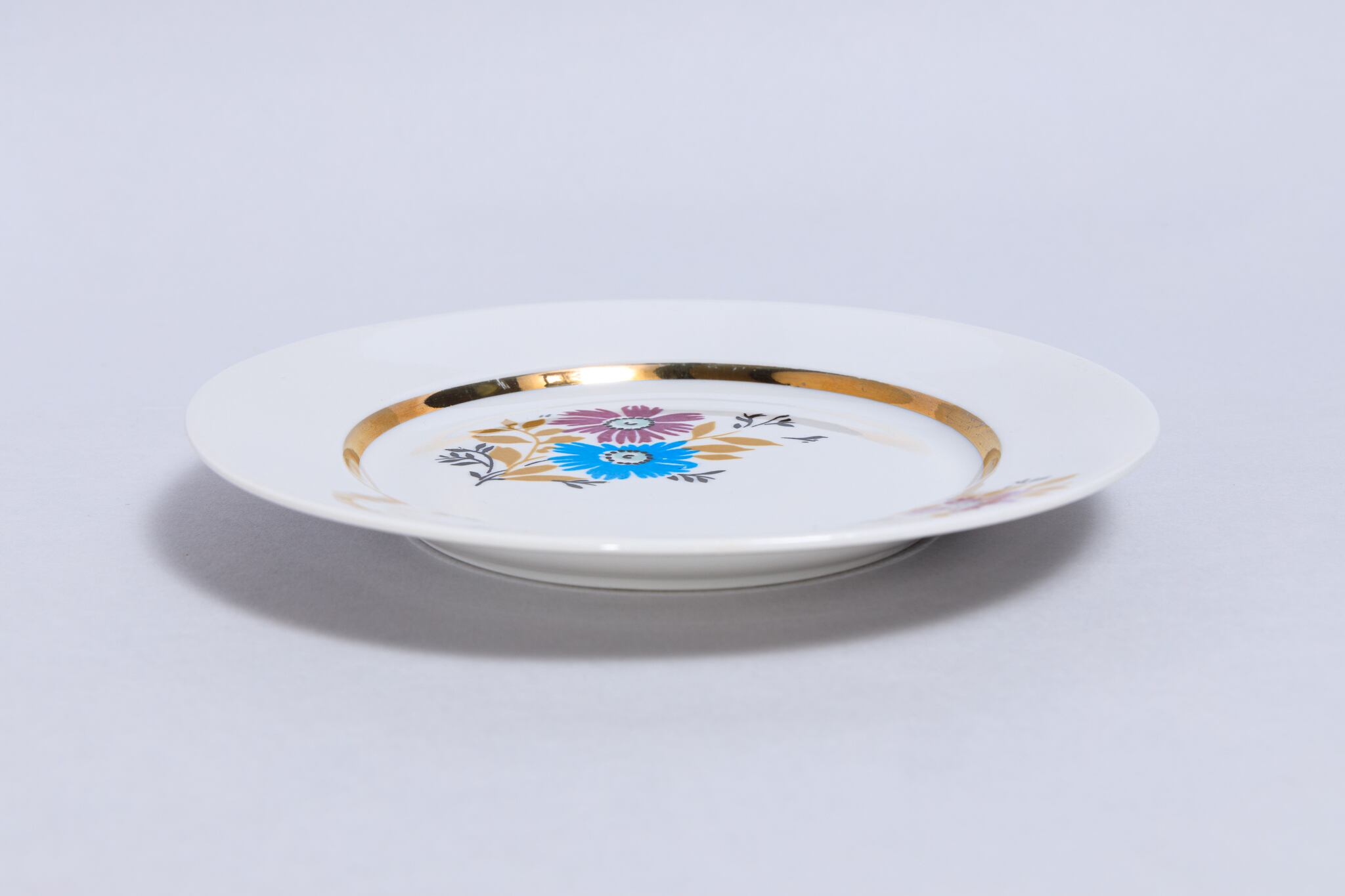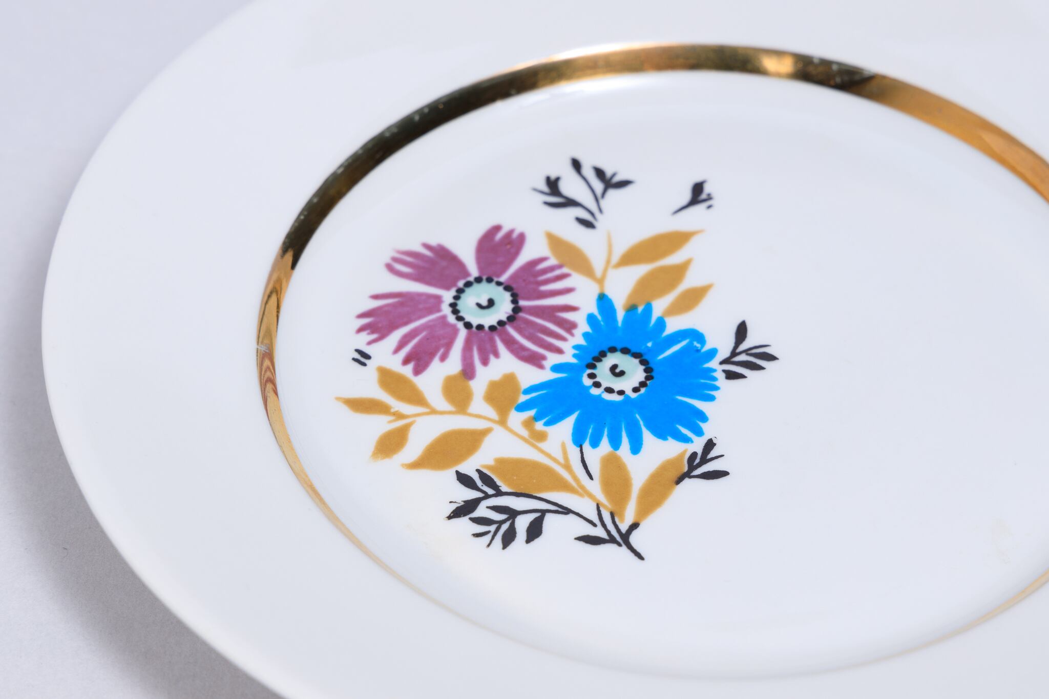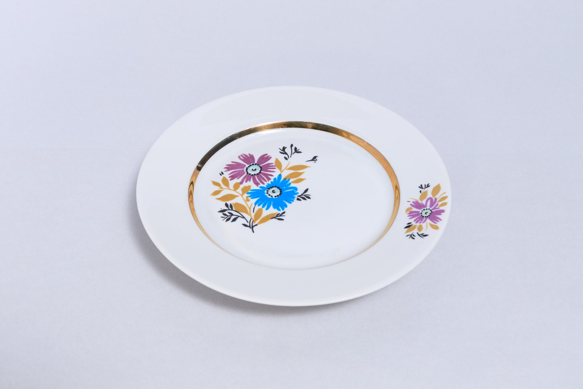 旧ソ連時代に生産されたヴィンテージのプレートです。鮮やかな水色と藤色の花が描かれ懐かしい感じのする素朴なプレートです。 黄土色と黒の葉っぱが花を引き立てます。ロシアのノブゴロドのプロレターリ磁器工場で1967-1975年に製造されました。比較的年代の古い物です。旧ソ連の市場で購入しました。