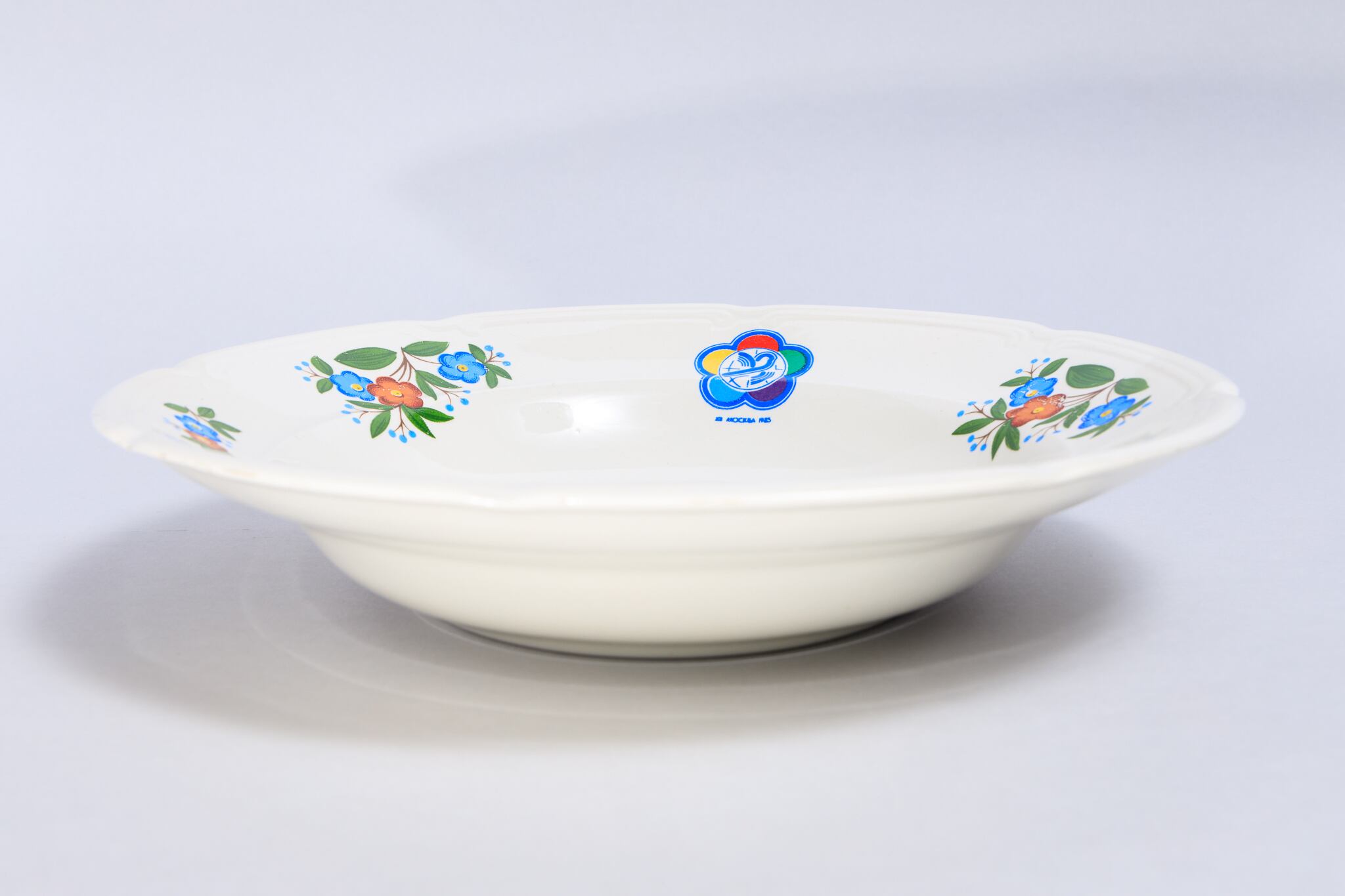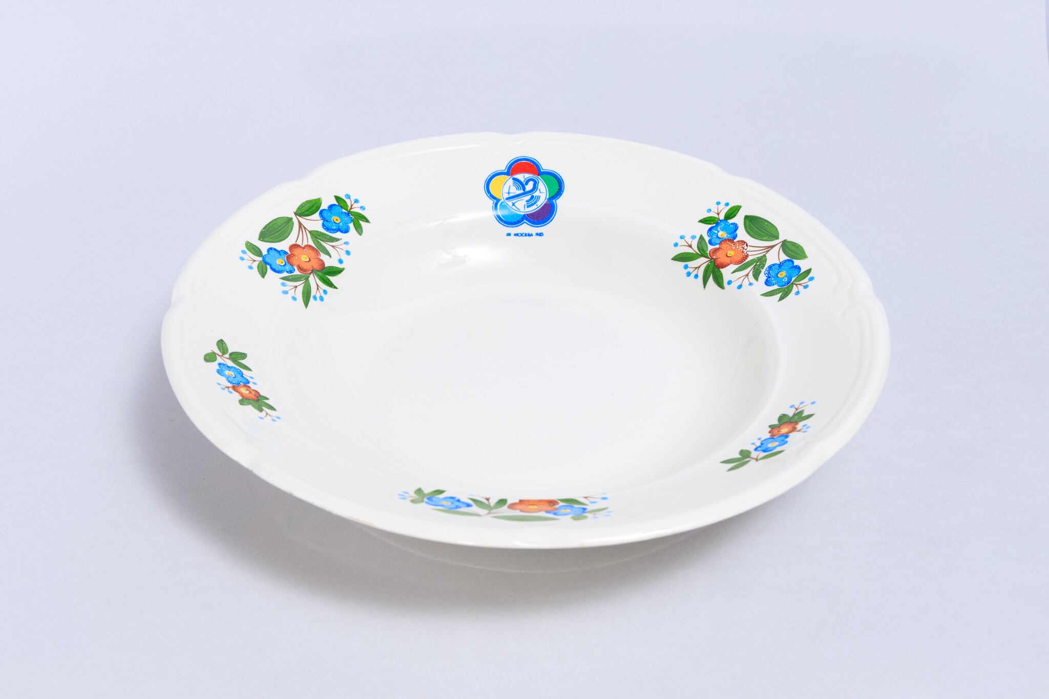 ヴィンテージの大きめのスープ皿です。カレーや具の多いスープなどがマッチしそうです。ロシアのトヴェリ州コナコヴォ陶器工場で製造されました。1985年にモスクワで開催された第12回世界若者学生祭典の記念スープ皿です。この祭典のシンボルと花が描かれています。伝統的な花柄にシンボルマークがモダンな印象です。記念品だけにとても作り込みが素晴らしく貴重なお品です。非常に珍しい物です。旧ソ連の市場で購入しました。