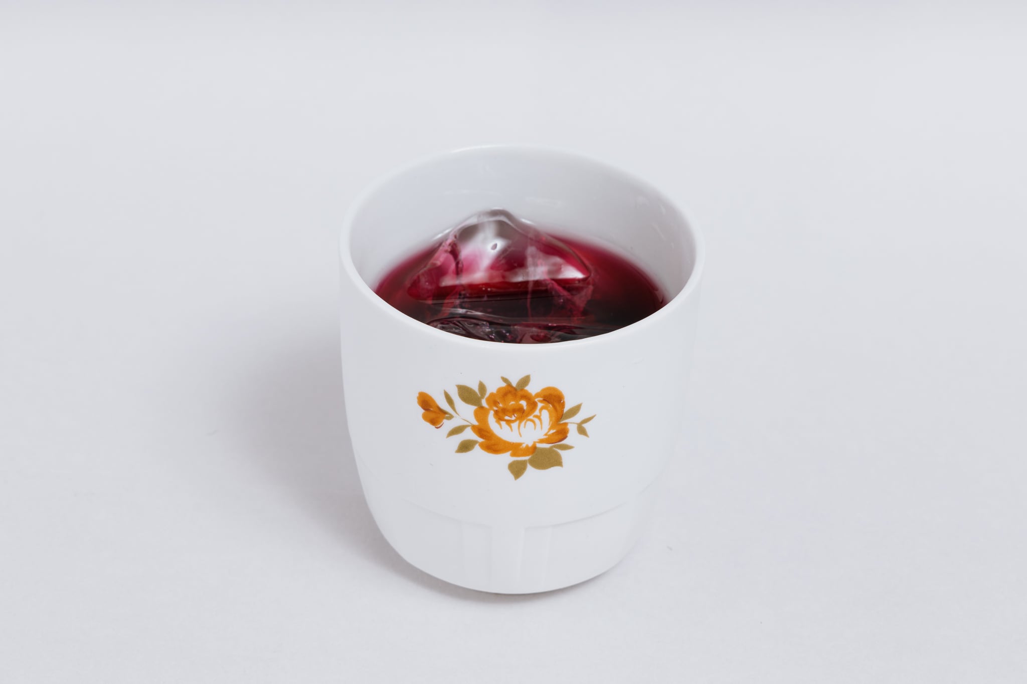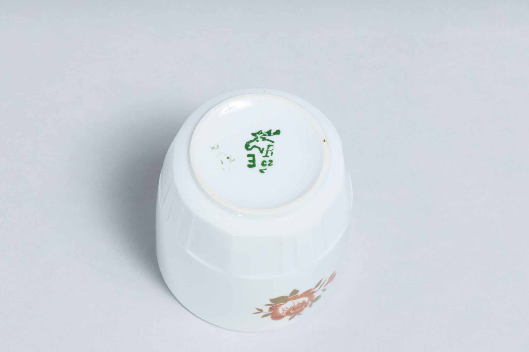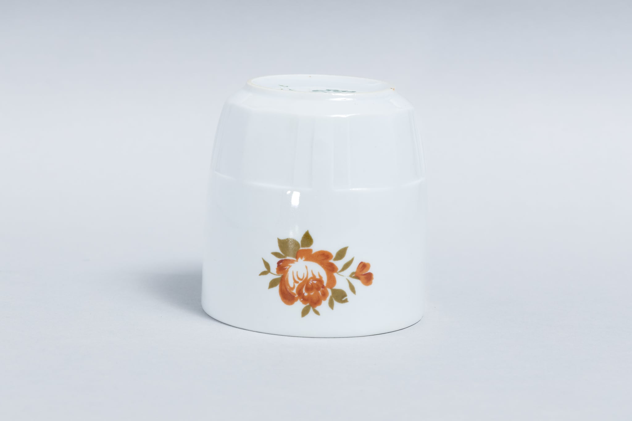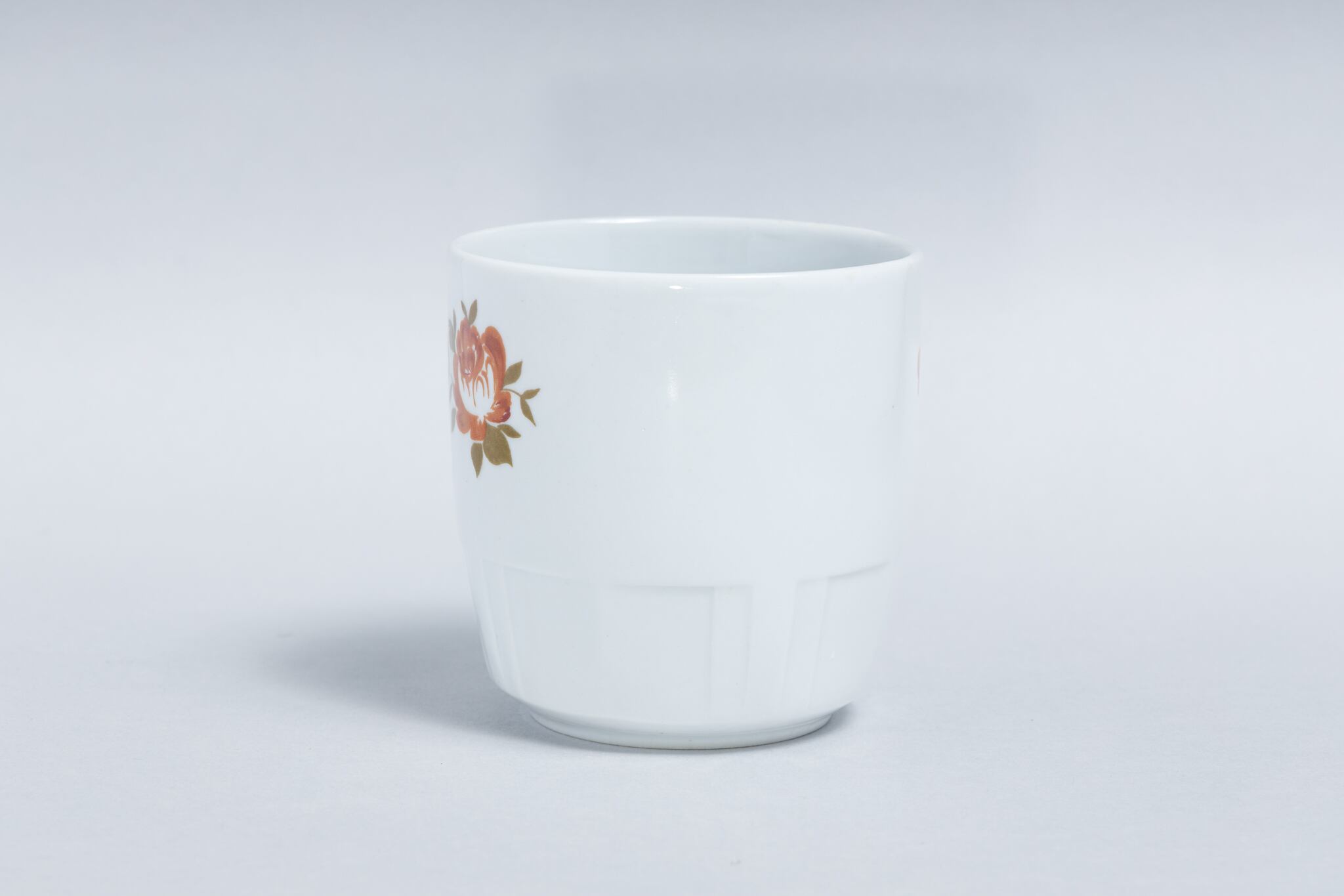 ヴィンテージのシンプルな取手のないカップです。旧ソ連時代の1965 -1991年にロシアのドミトロフ磁器工場で生産されたカップです。底面が大きくどっしりとした形で、ロゴマークのように配置された渋い色味の花、コップ下部のカットデザインなど、シンプルですがそれぞれの要素のバランスが良く、モダンな印象のカップです。