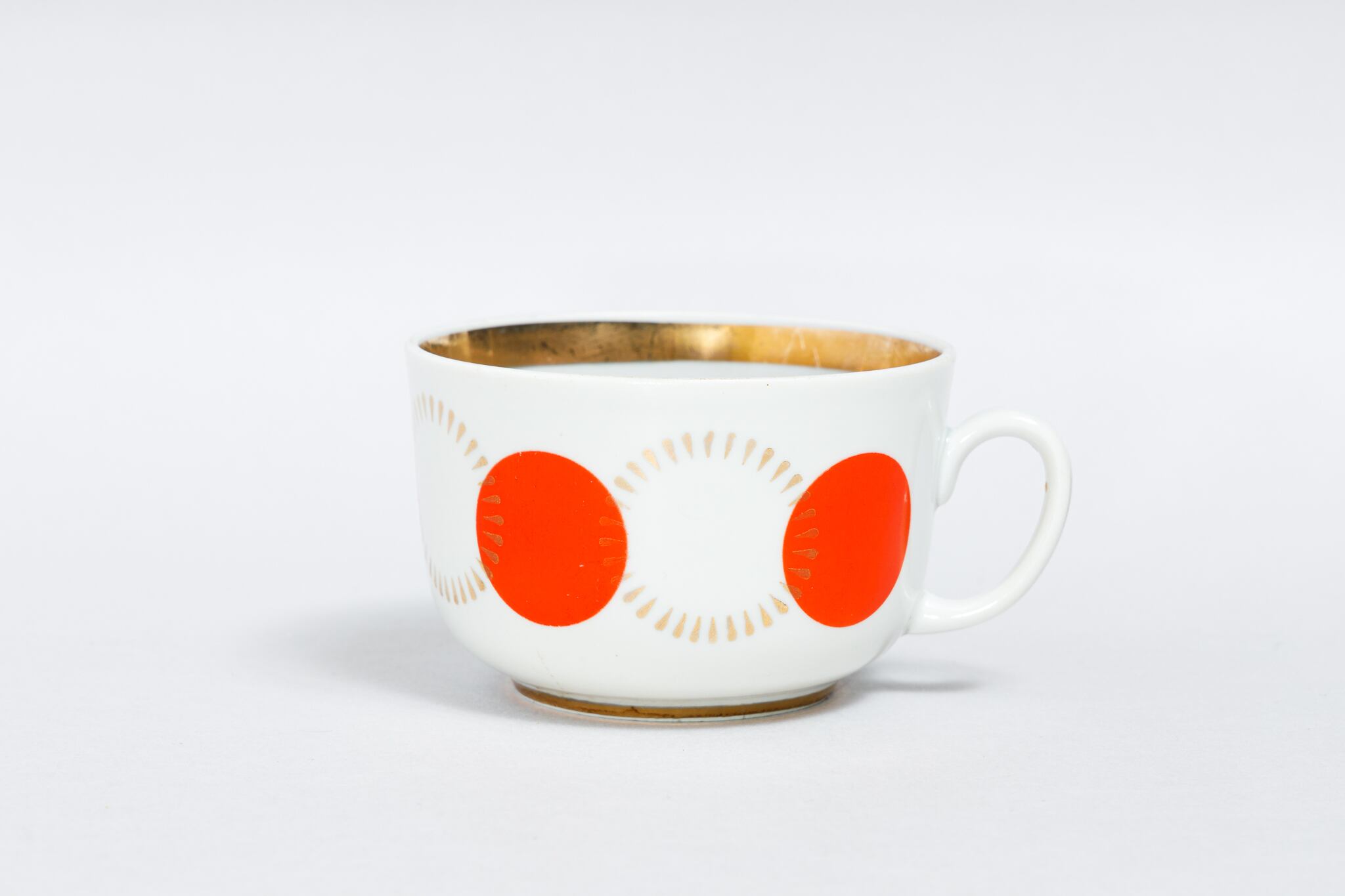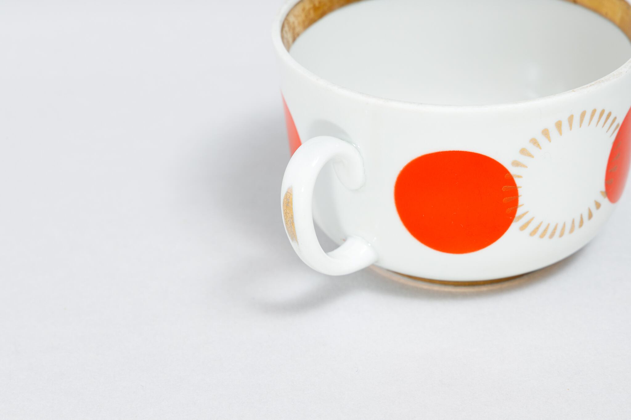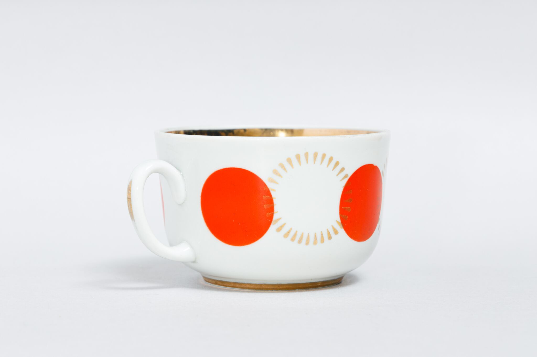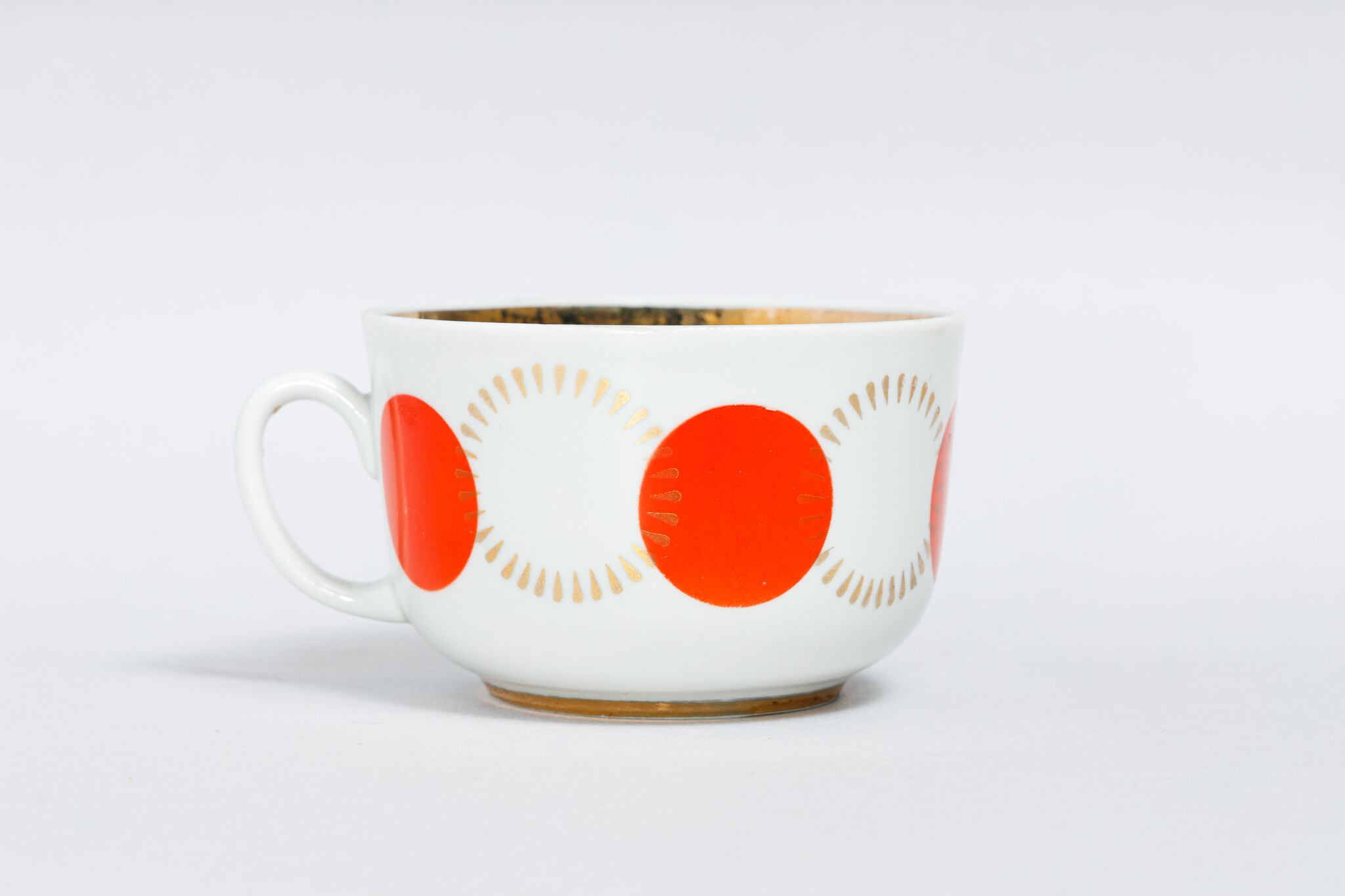 ヴィンテージのカップです。赤の大きなドットと工場の機械の歯車のような模様が全体に描かれています。これは旧ソ連時代1920年代に共産主義を広めるためのアジテーションとしてよく見られるモチーフです。