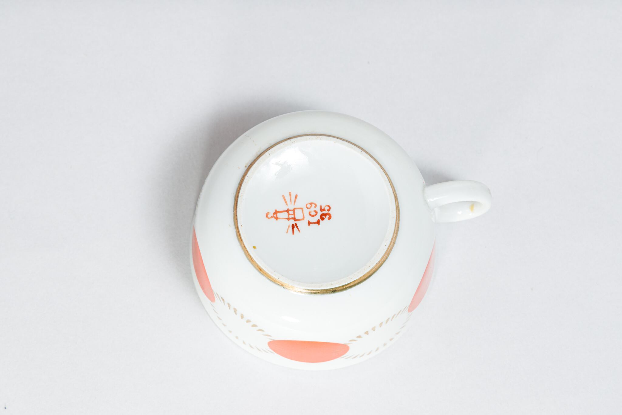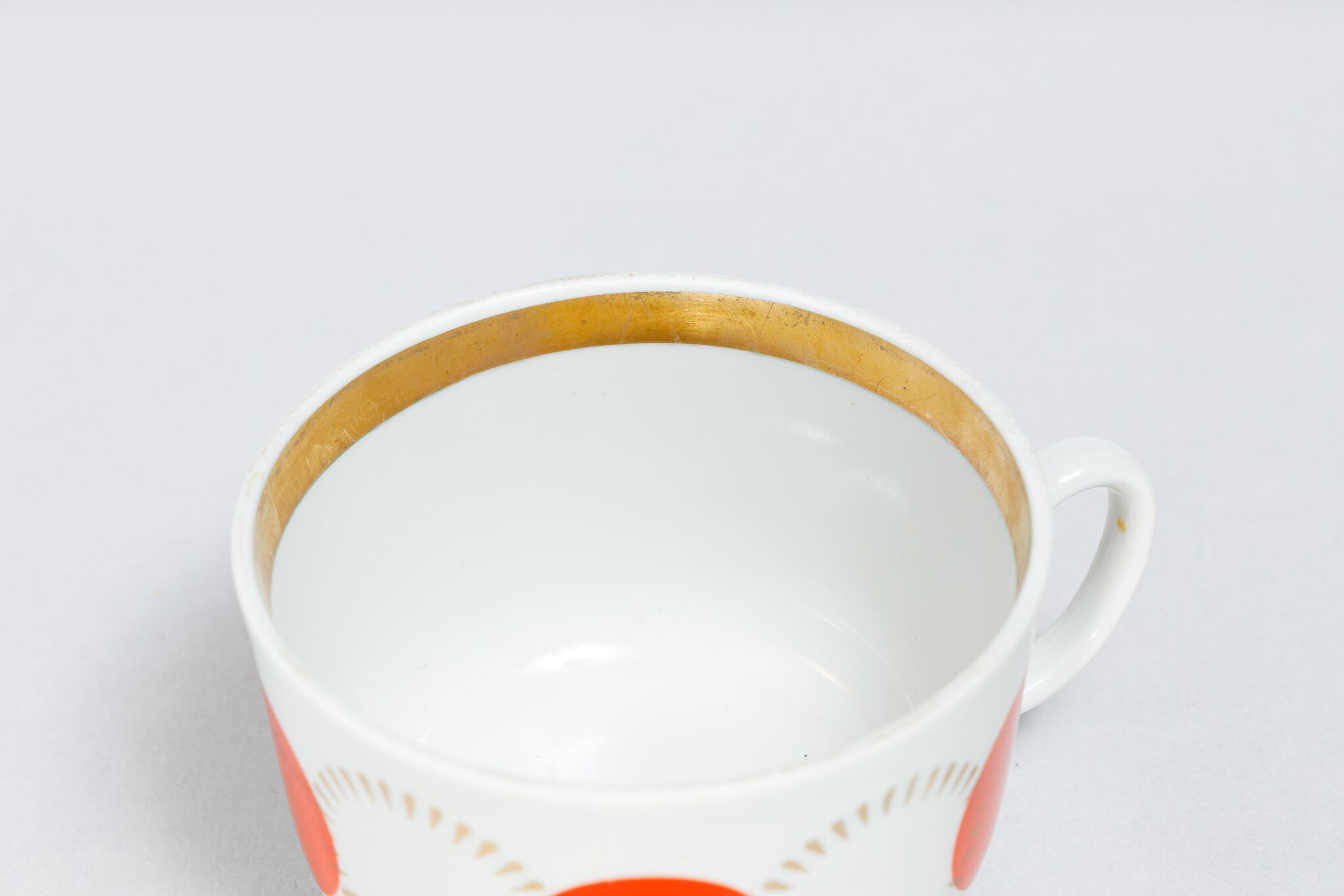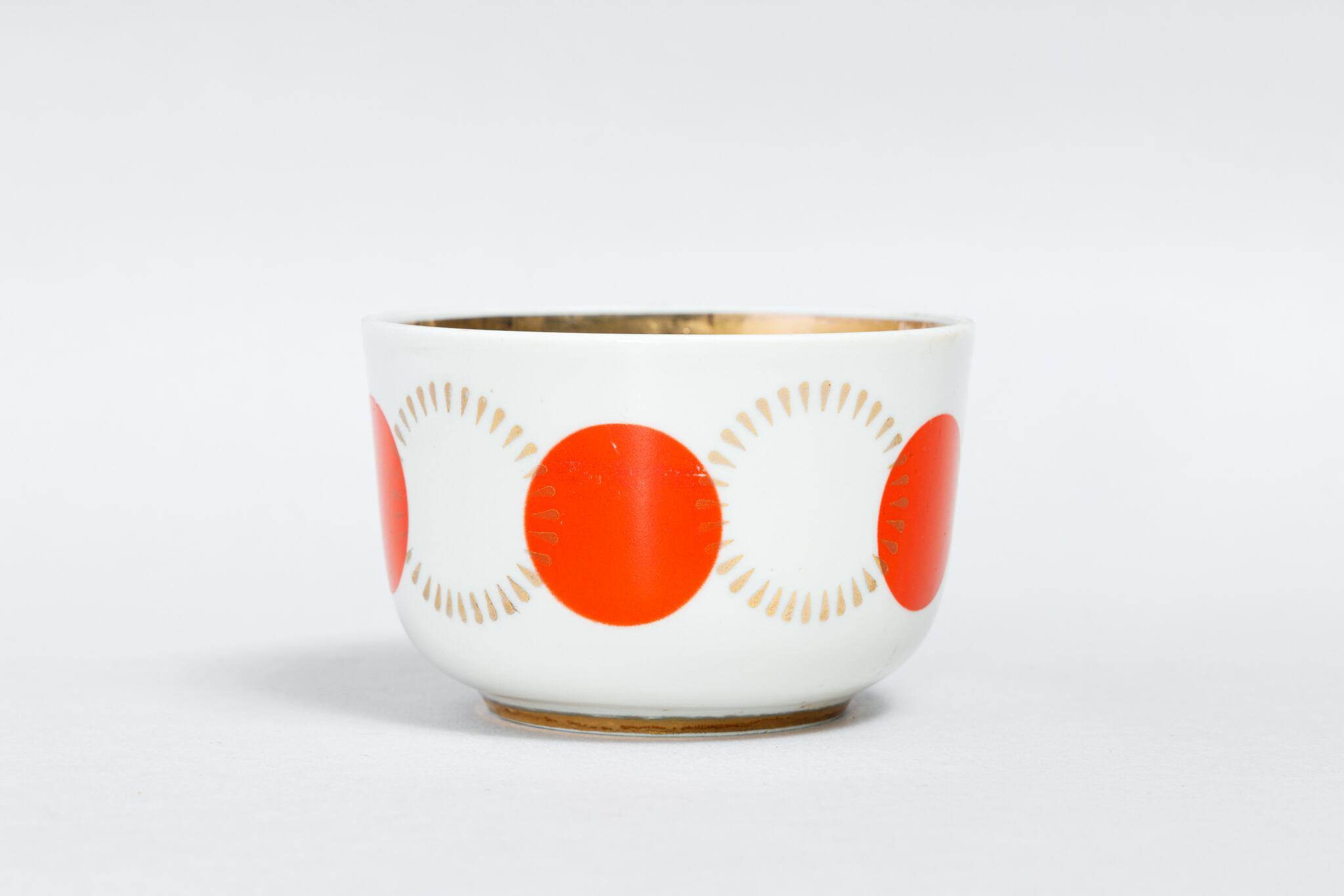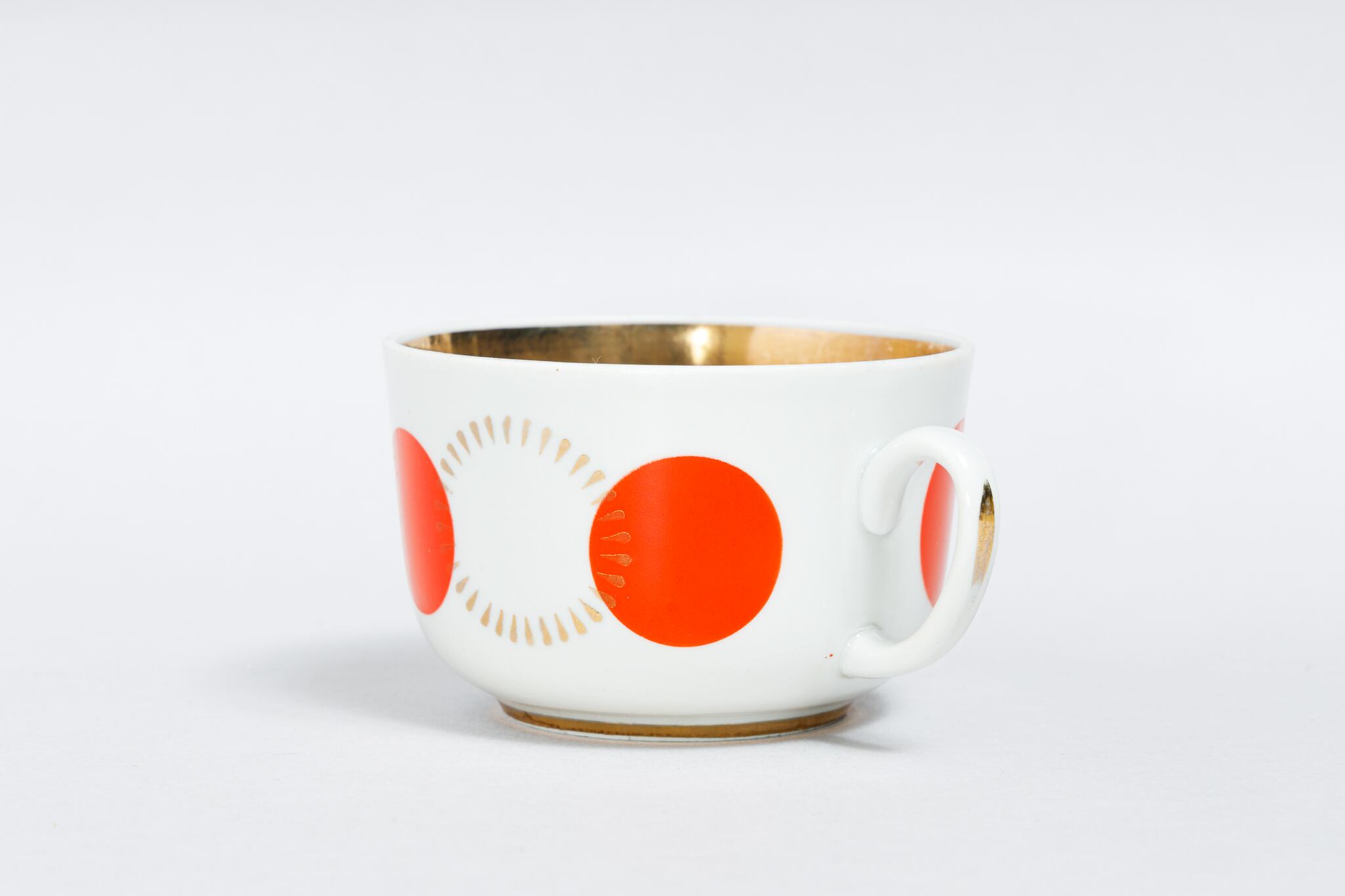 ヴィンテージのカップです。赤の大きなドットと工場の機械の歯車のような模様が全体に描かれています。これは旧ソ連時代1920年代に共産主義を広めるためのアジテーションとしてよく見られるモチーフです。