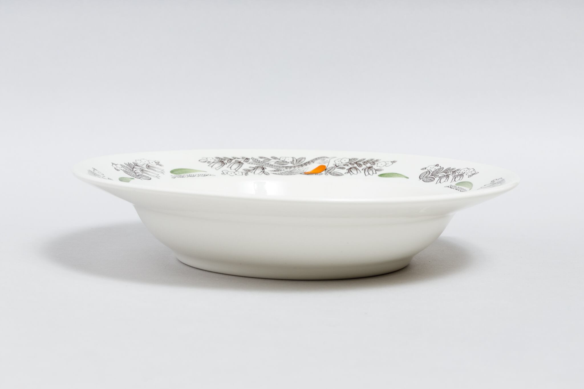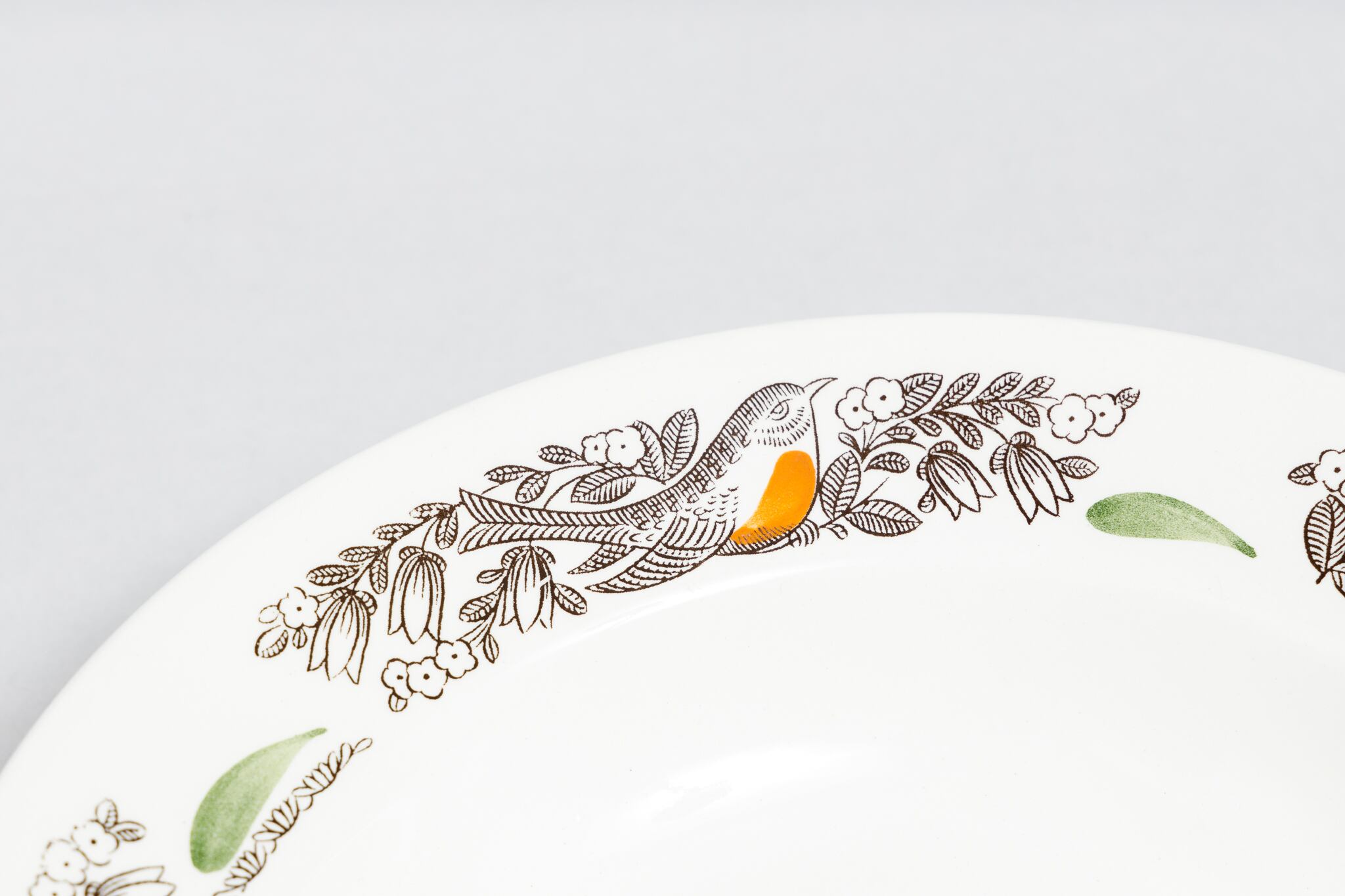 ヴィンテージの小鳥柄のスープ皿です。スープやパスタなどを入れるのに適しています。草花にとまっている小鳥が描かれています。塗り絵のような緑とオレンジが差し色となり全体を華やかな印象にしています。ロシアのトヴェリ州コナコヴォ陶器工場で1974-1991年に製造されました。コナコヴァらしい優しい色合いと素朴な風合いが素敵です。旧ソ連の市場で購入しました。