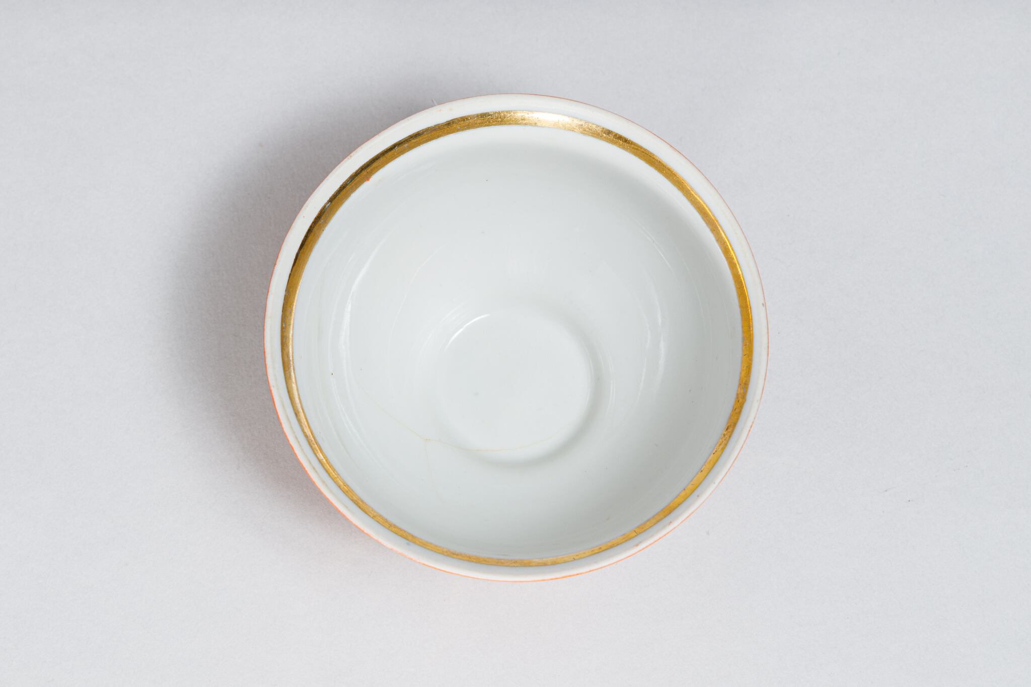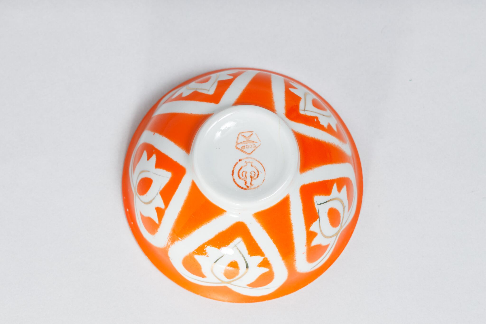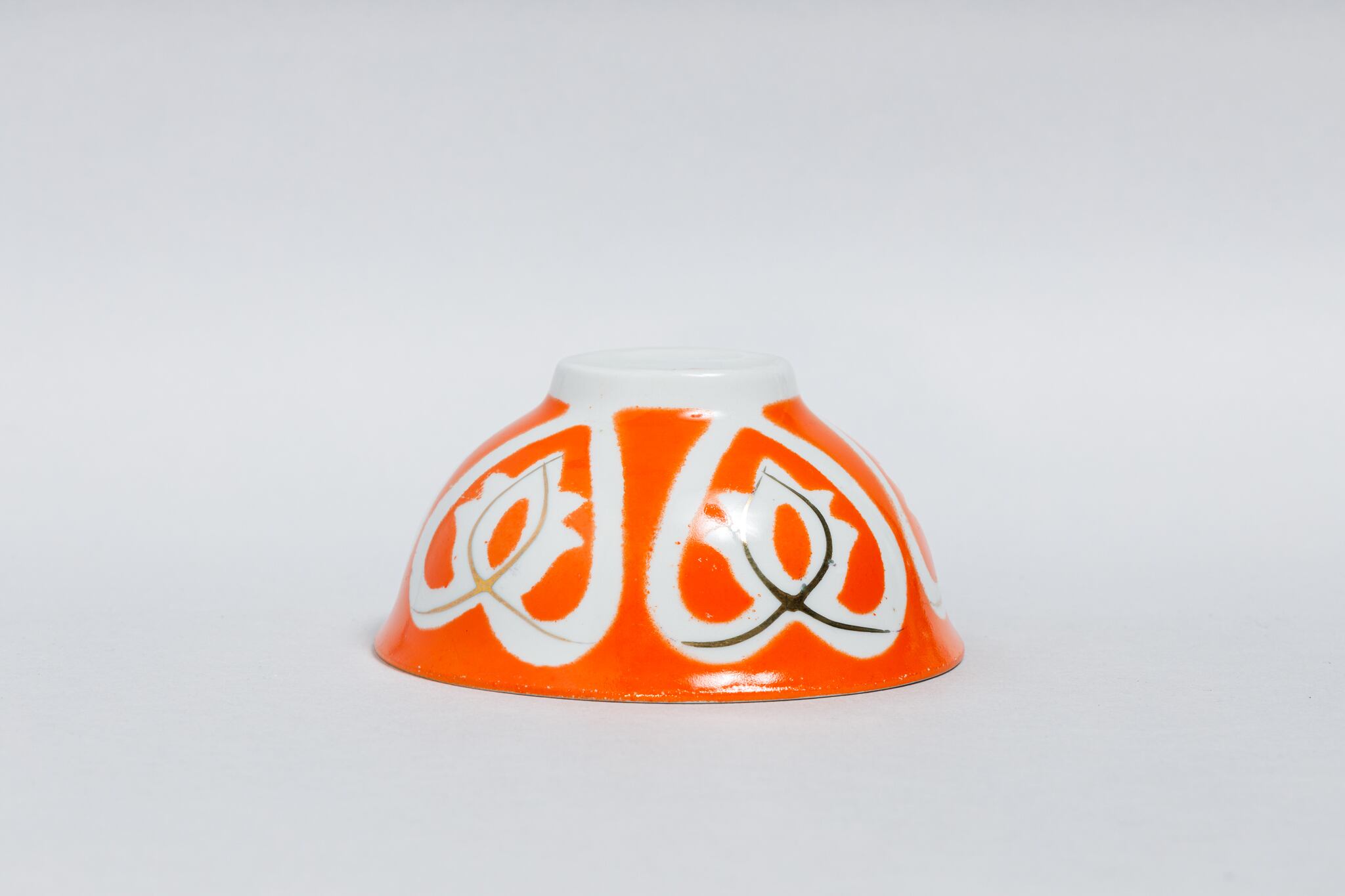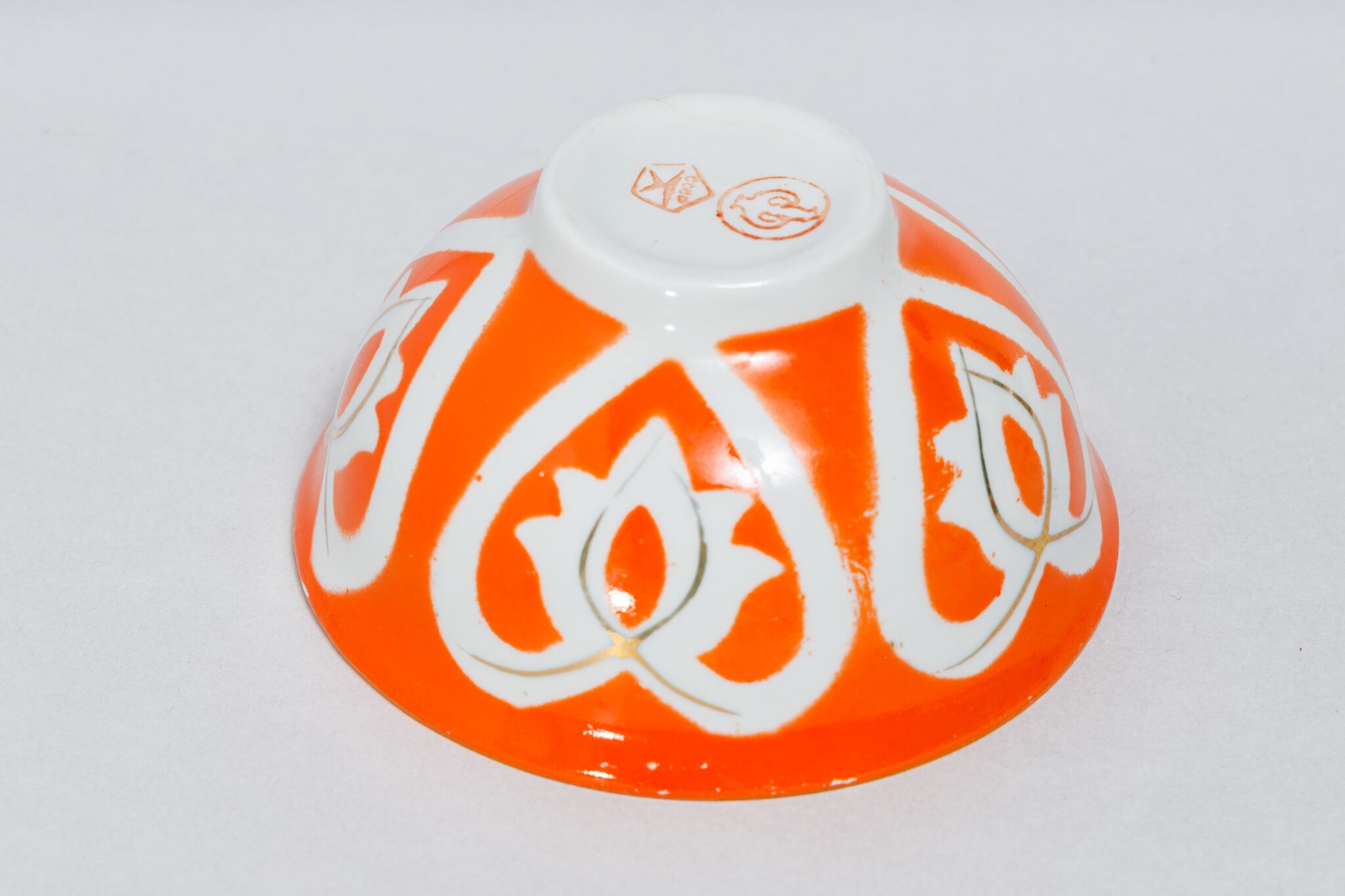 また、ソ連製は日本製などと違い、等級によって作りの丁寧さが違い、低い等級の物は、絵付けのムラがあったり、飲み口や底の多少の凹凸などがあったりします。
