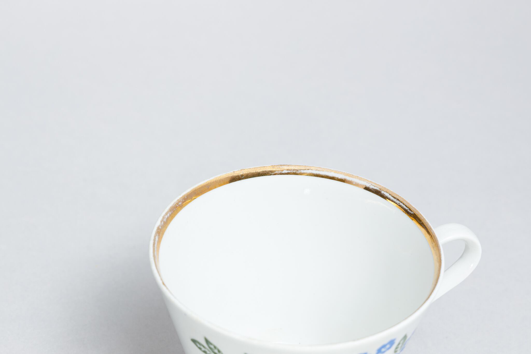 また、ソ連製は日本製などと違い、等級によって作りの丁寧さが違い、低い等級の物は、絵付けのムラがあったり、飲み口や底の多少の凹凸などがあったりします。
