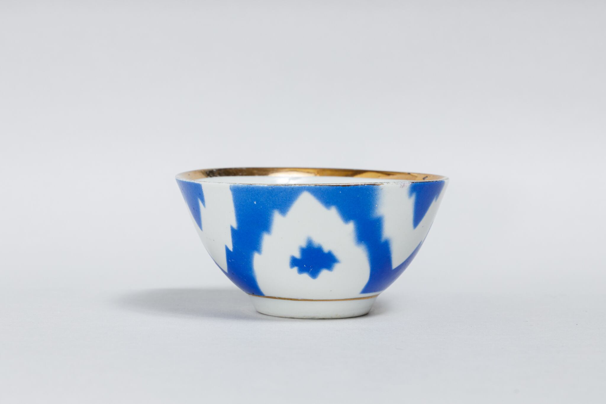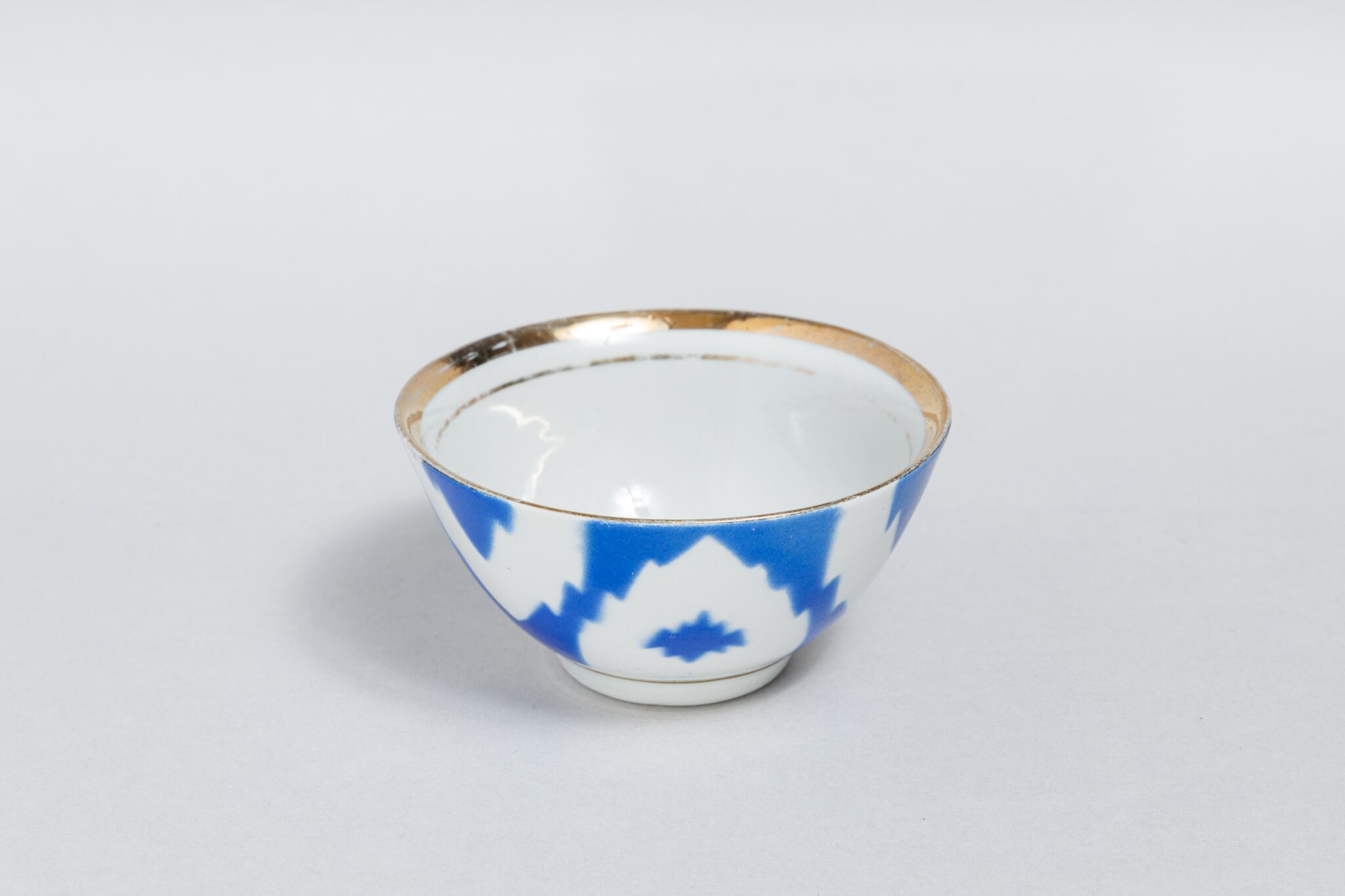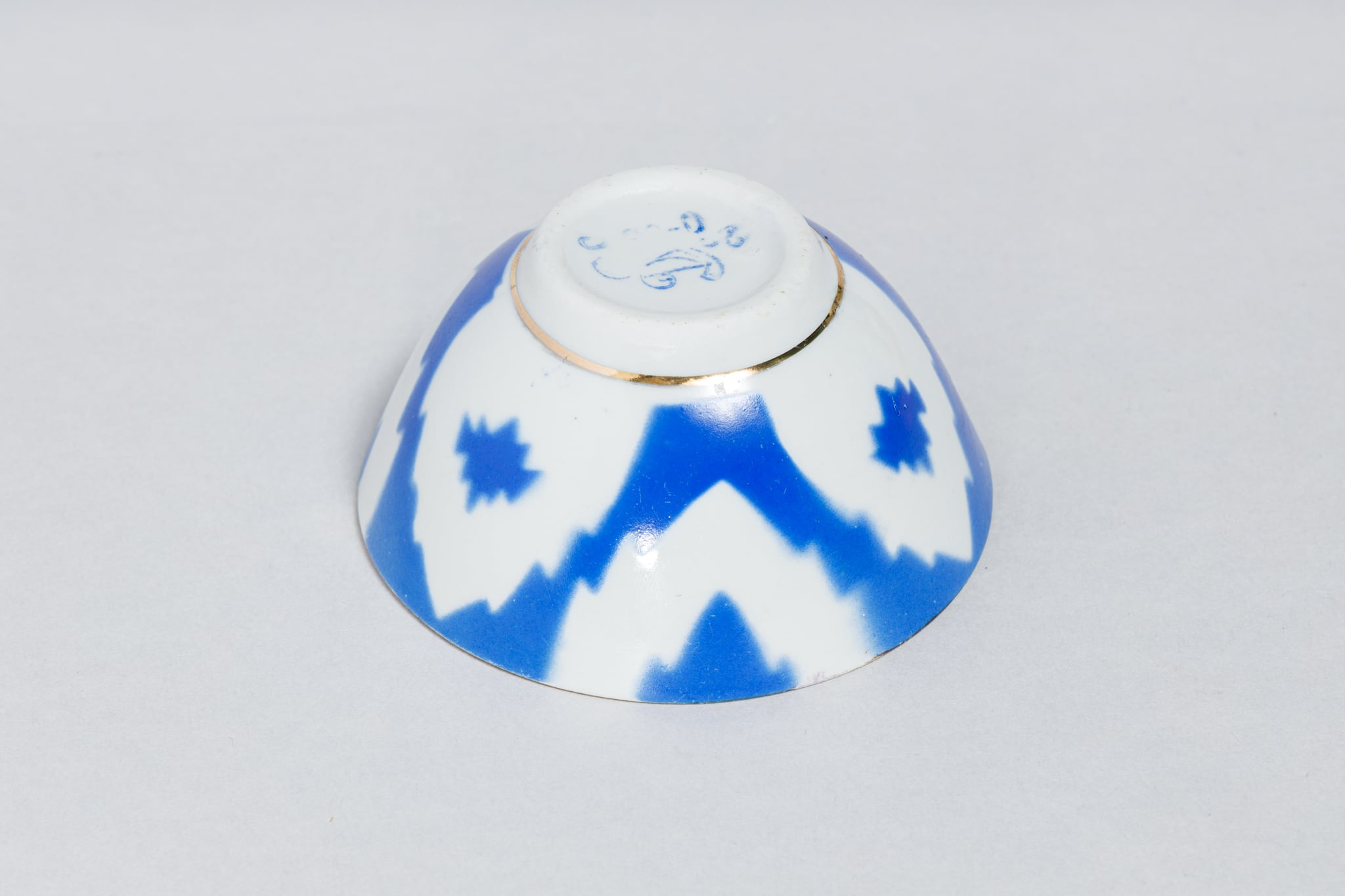 旧ソ連時代に生産された中央アジアでよく使われている取っ手のないブルーと白のヴィンテージのカップです。 ウズベキスタンのタシケント磁器工場で1973-1991年に製造された物です。 綿花柄が描かれています。このデザインはウズベキスタンやタジキスタンの絣(かすり)織物に典型的なものだそうです。また、カップの底には綿花の花とウズベック語で「おめでとう!」と書かれています。稀少な物です。陶器の形が均一ではなく歪んでいます。これも一つのソ連製品の味でこの陶器を魅力的な物にしています。