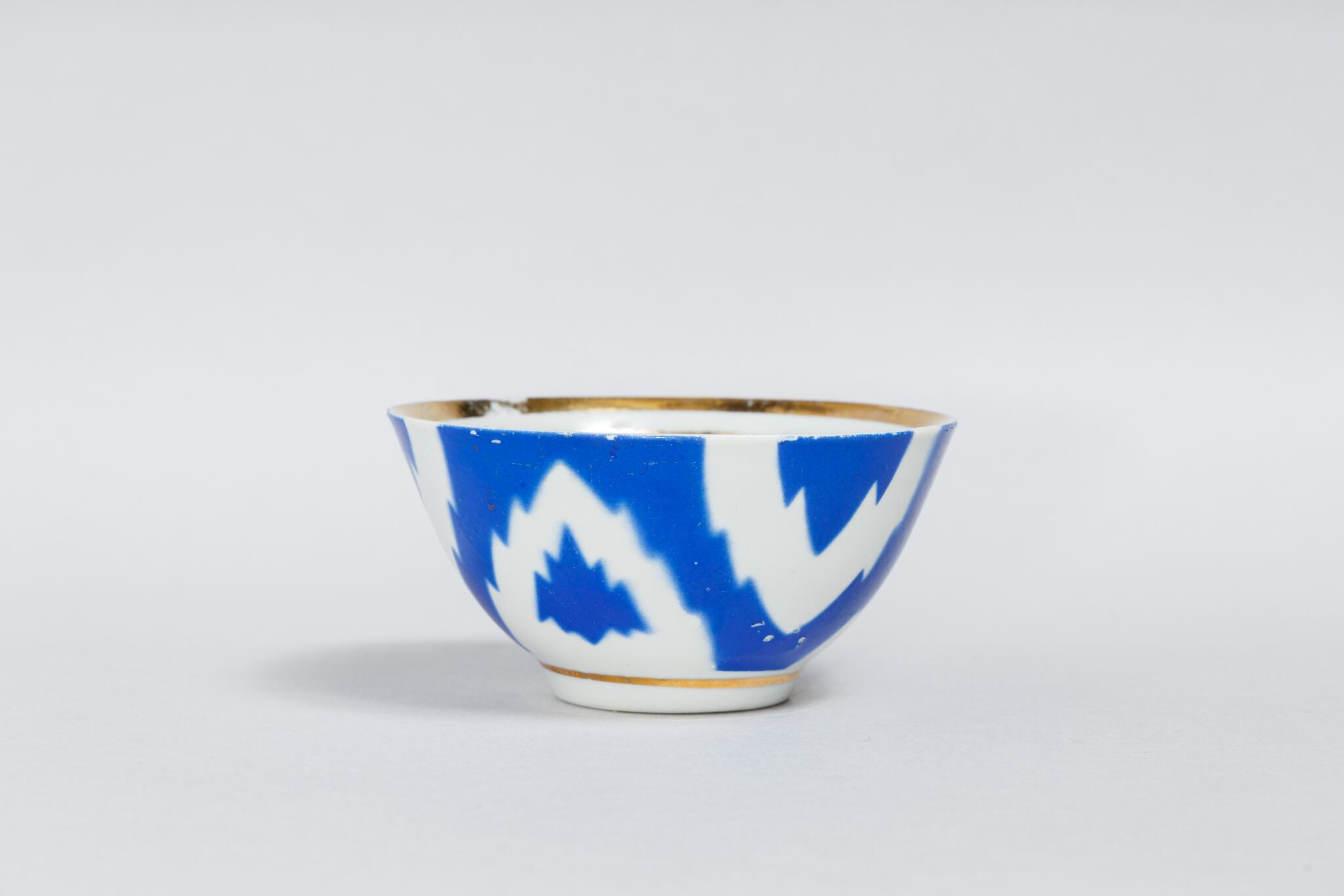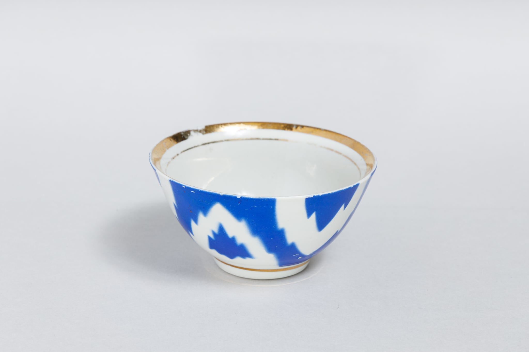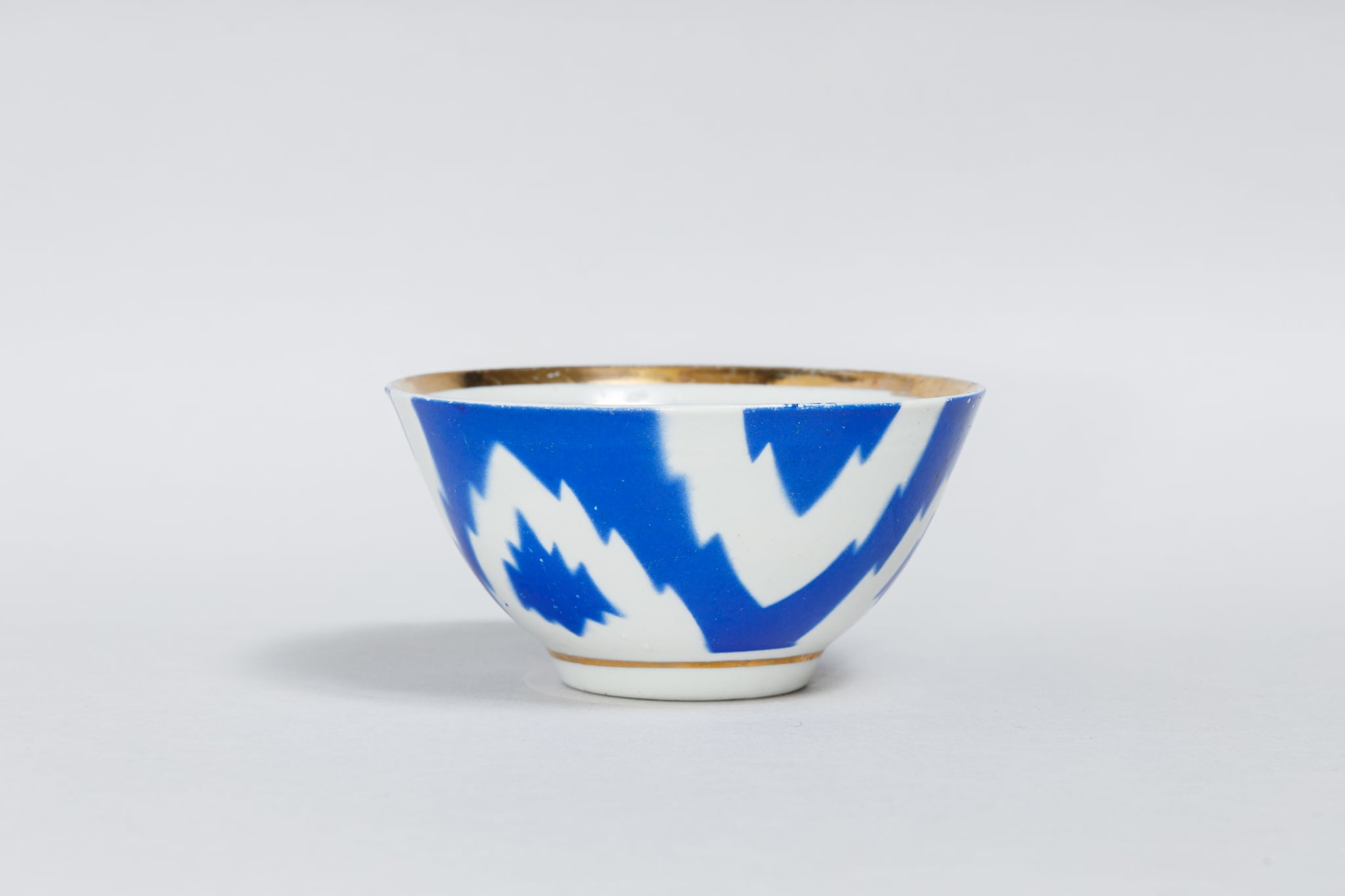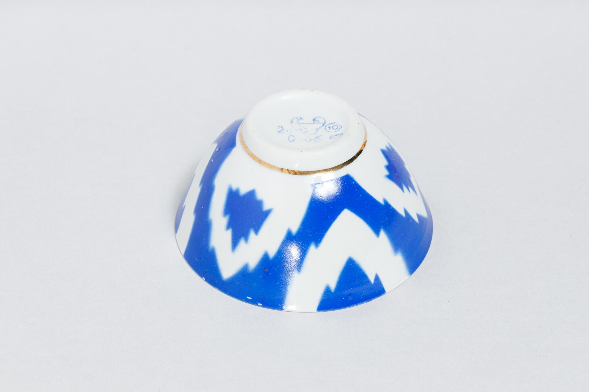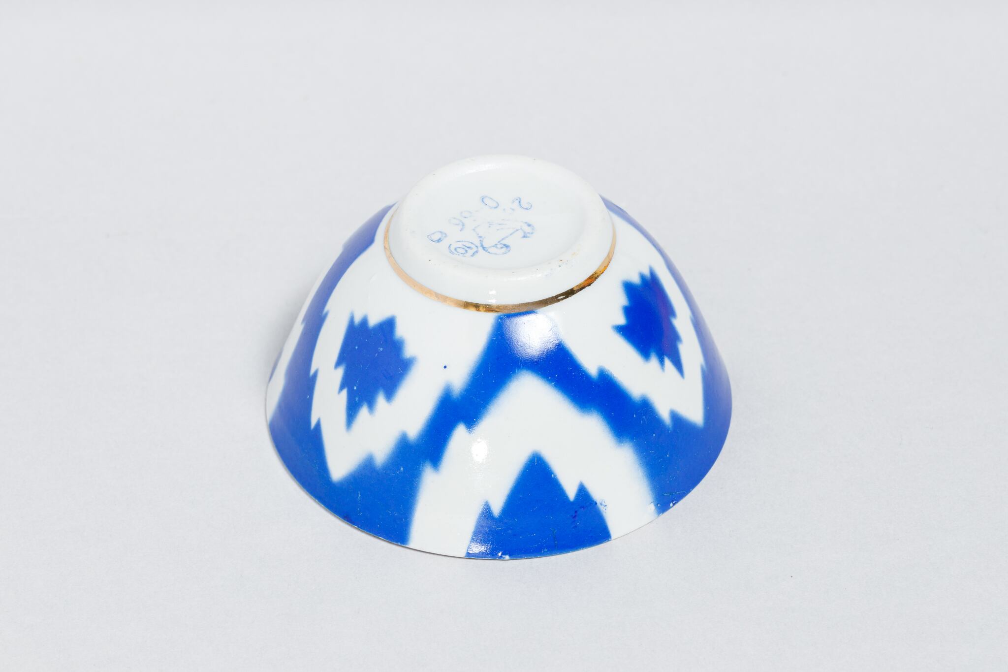 旧ソ連時代に生産された中央アジアでよく使われている取っ手のないブルーのヴィンテージのカップです。 ウズベキスタンのタシケント磁器工場で1973-1991年に製造された物です。 綿花柄が描かれています。このデザインはウズベキスタンやタジキスタンの絣(かすり)織物に典型的なものだそうです。0305のようにカップの底には綿花の花とウズベック語で「おめでとう!」はありません。陶器の形が均一ではなく歪んでいます。これも一つのソ連製品の味でこの陶器を魅力的な物にしています。旧ソ連の市場で購入しました。