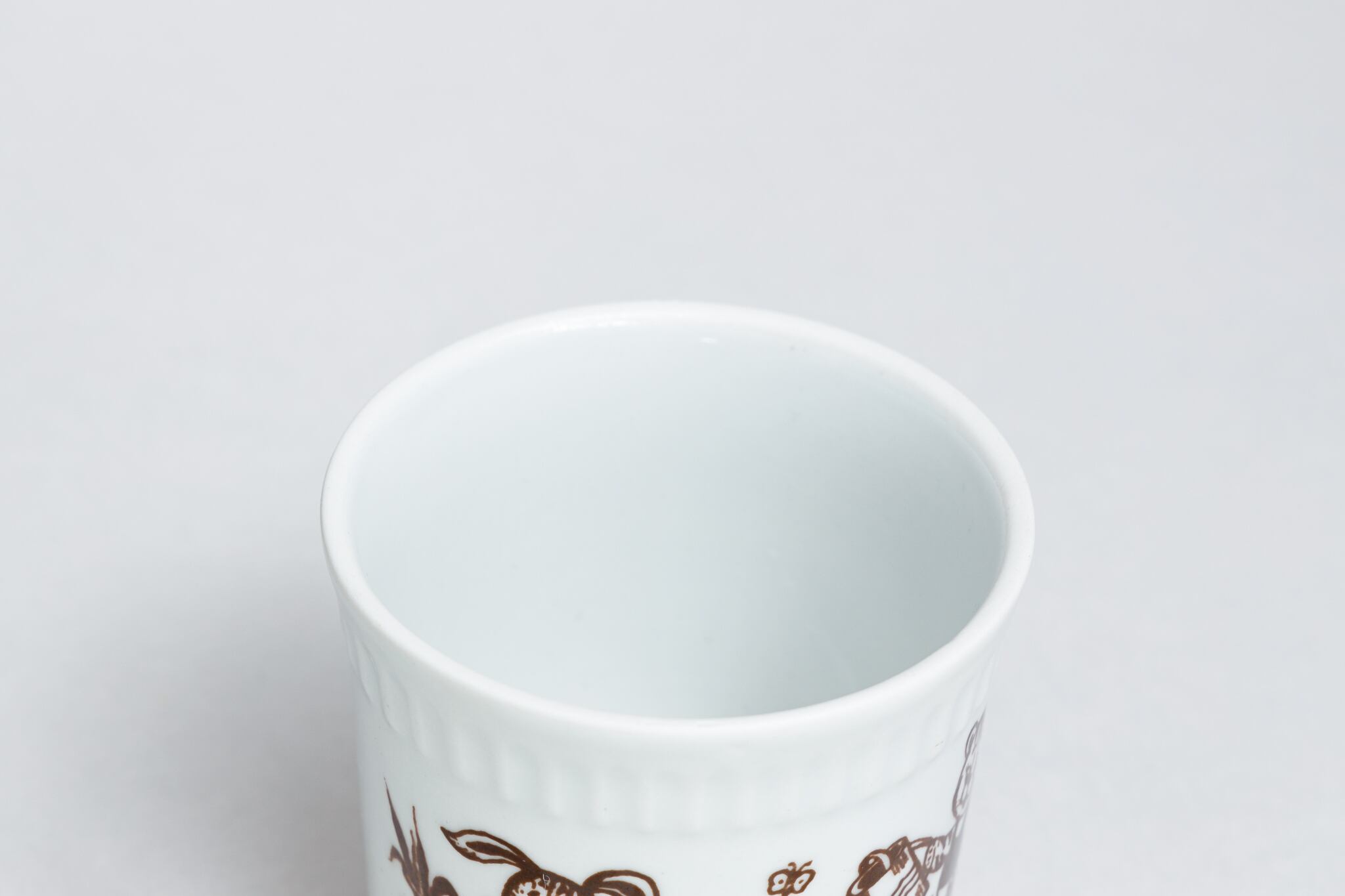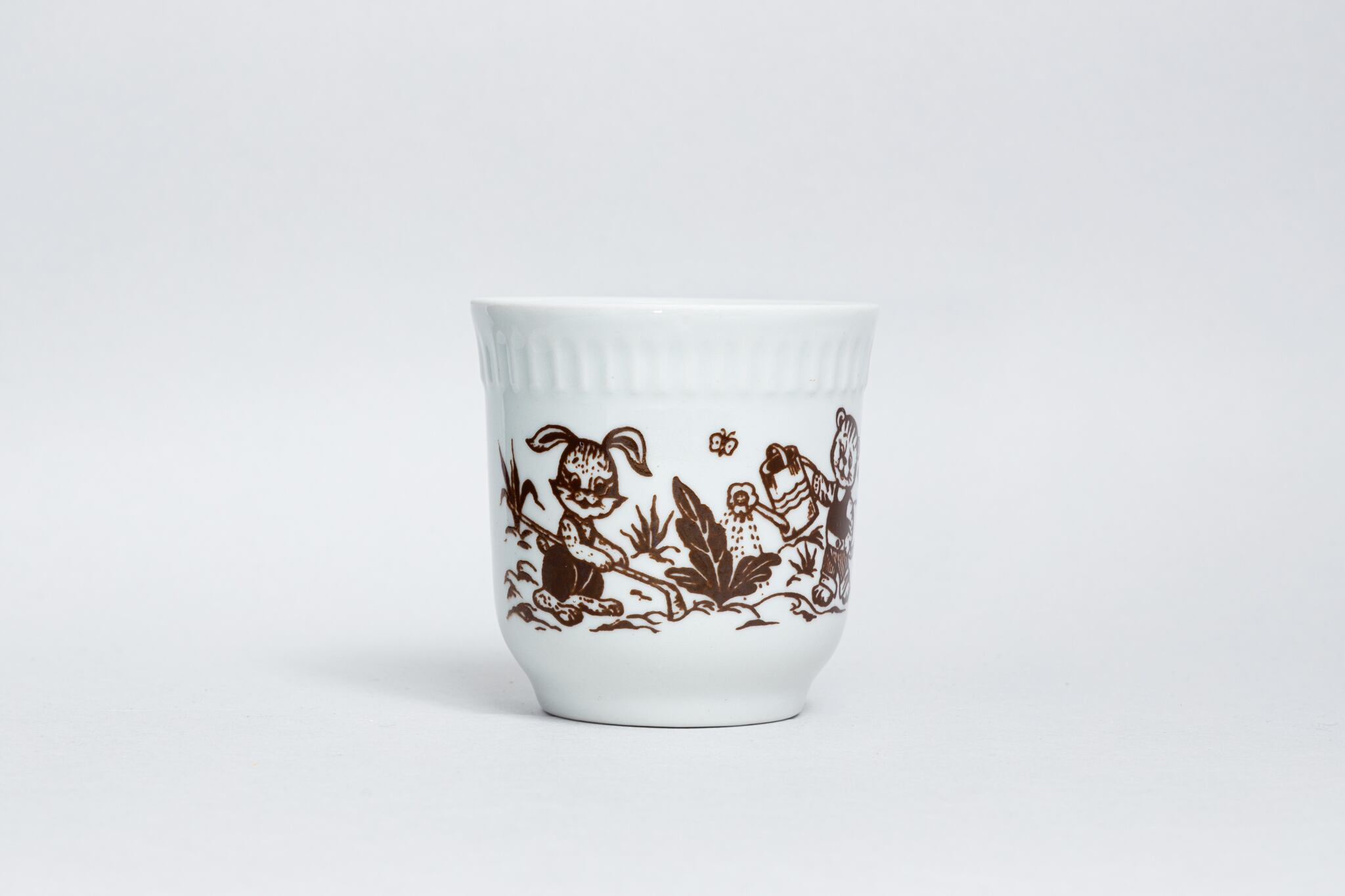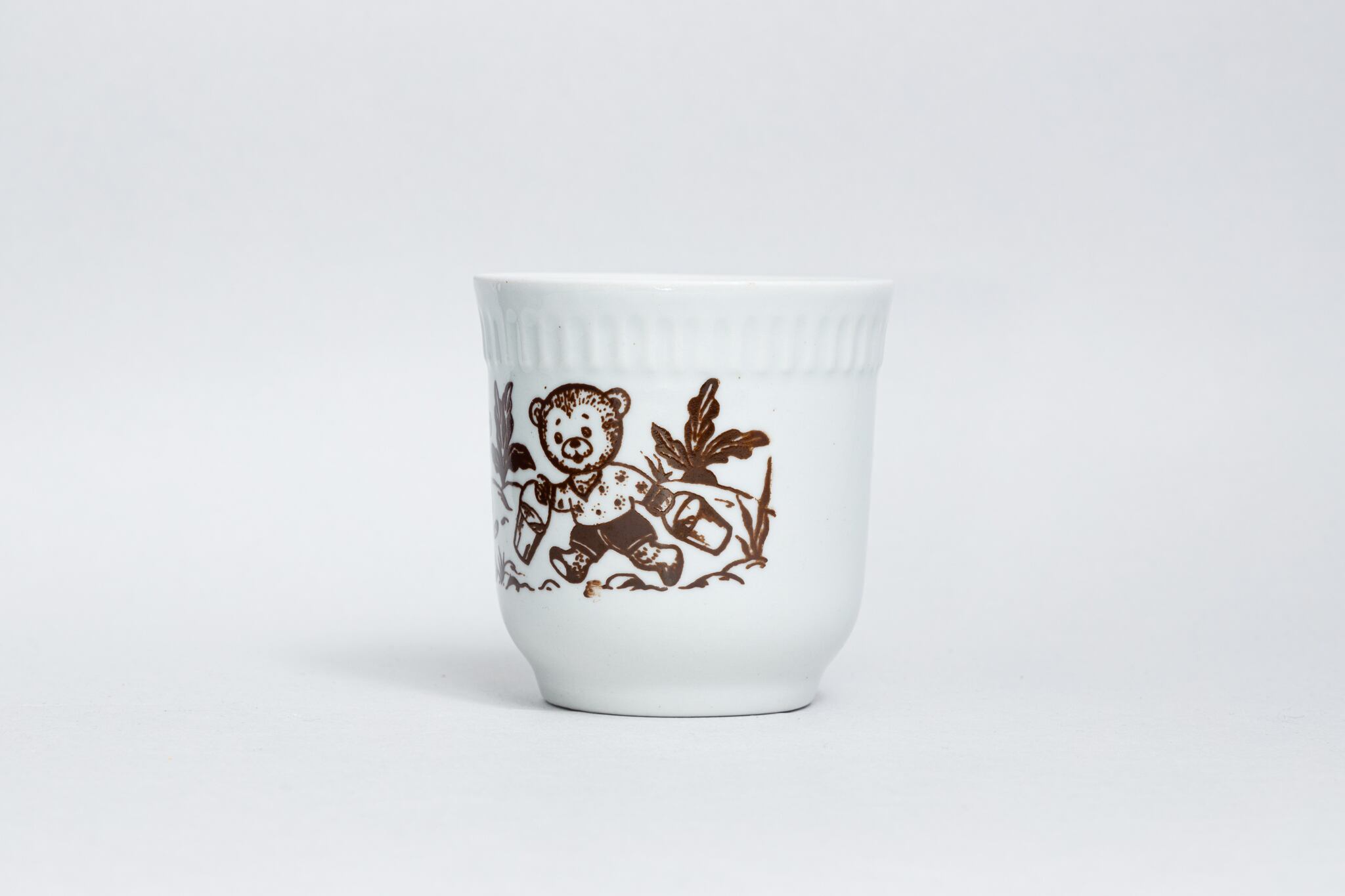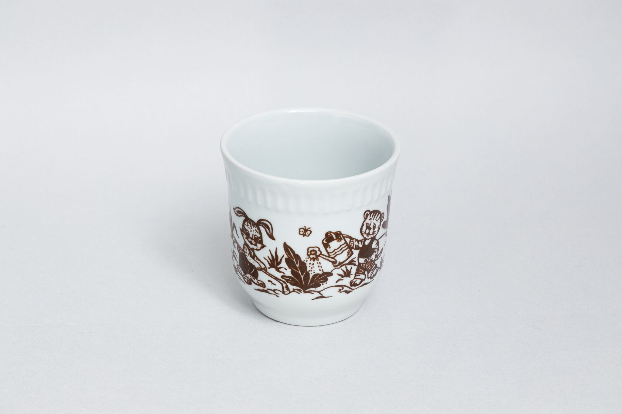 子どもの絵本をモチーフにしたヴィンテージカップです。熊、虎、兎柄が畑で作業をしている一場面が白と茶色で描かれています。とても素朴で愛らしいカップです。1970-1991年にウクライナのゴロドニツキー磁器工場で製造されました。ゴロドニツキー磁器工場には茶色と白の子ども向けのカップがたくさん作られていました。旧ソ連の市場で購入しました。