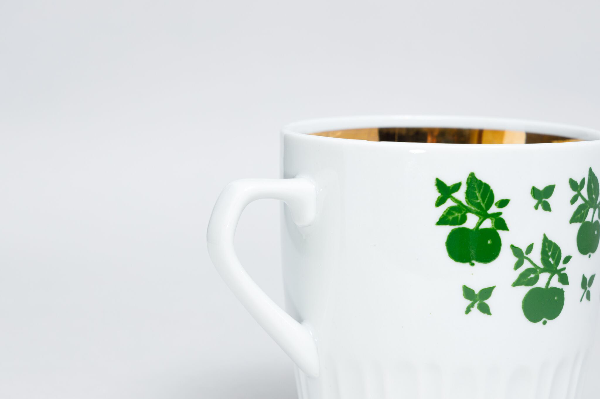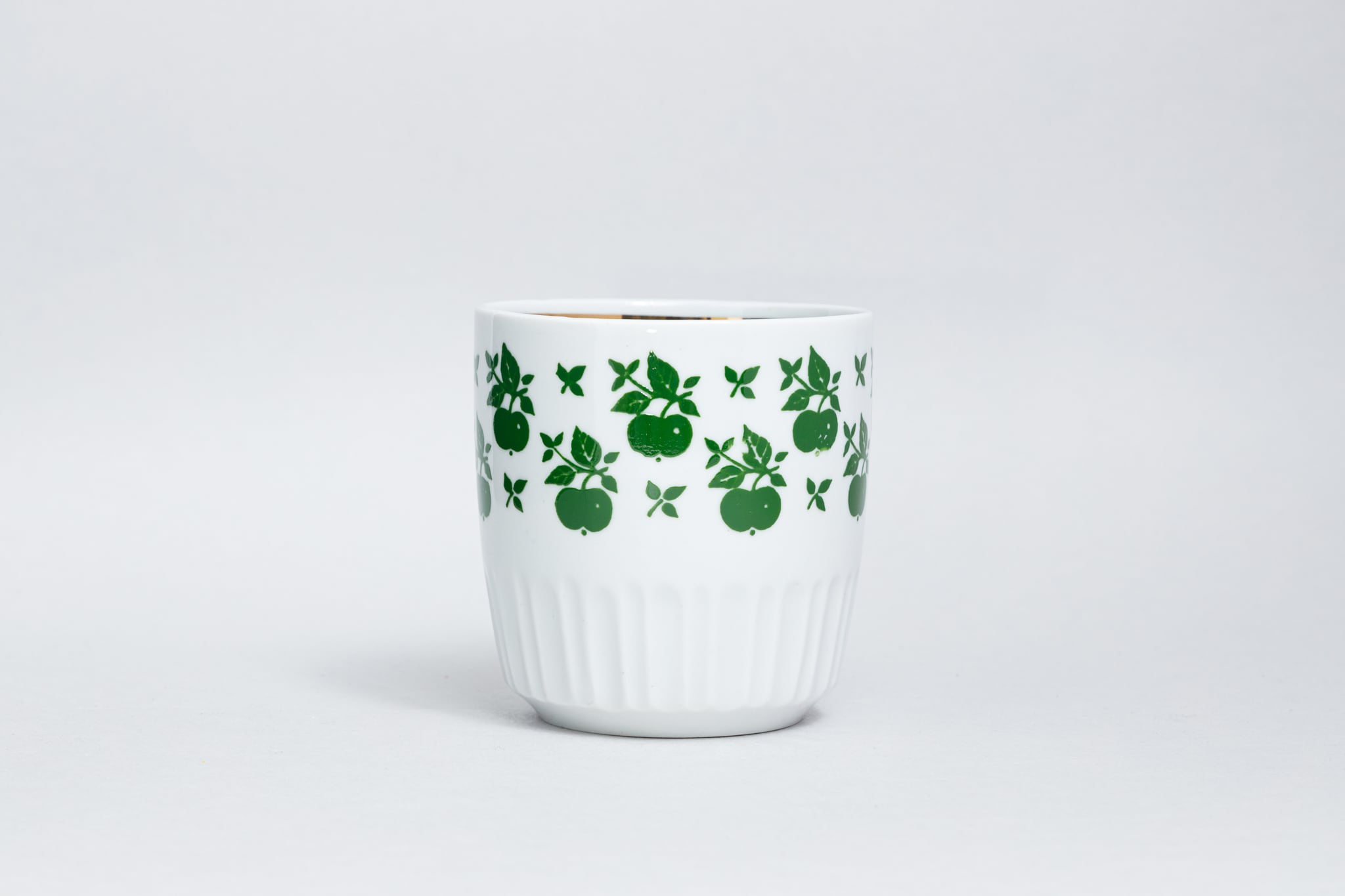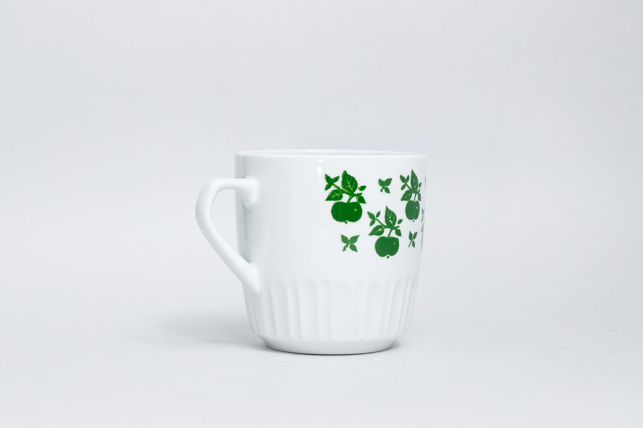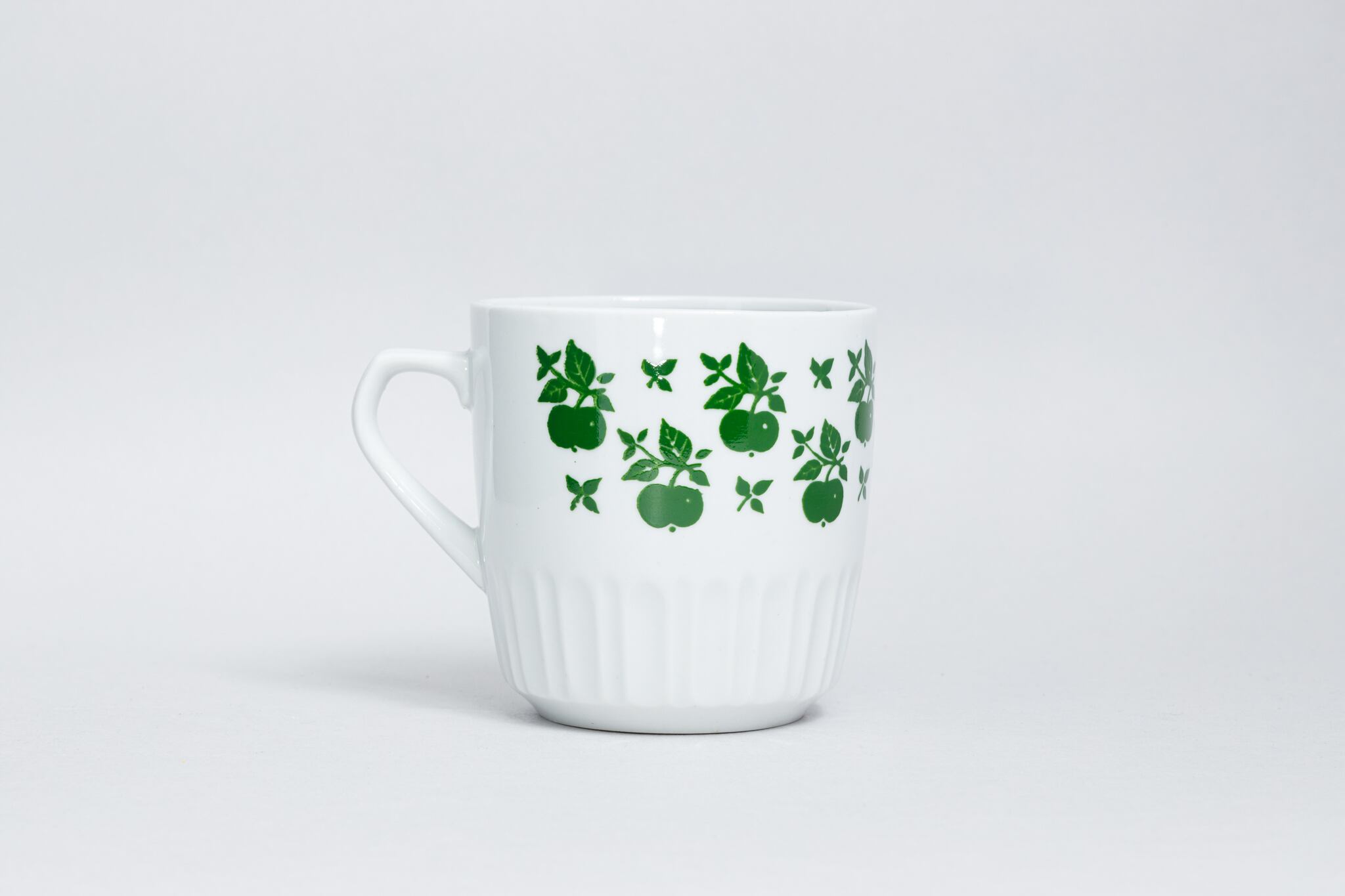 ヴィンテージのマグカップです。旧ソ連時代の1965 -1991年にロシアのドミトロフ磁器工場で生産されたマグカップです。カップの胴にはさくらんぼが整然と描かれていて、少し不思議な印象のカップです。カップの高台の部分は縞のような溝が彫られています。