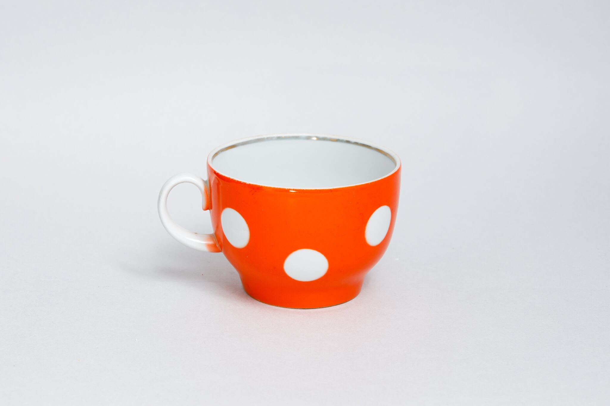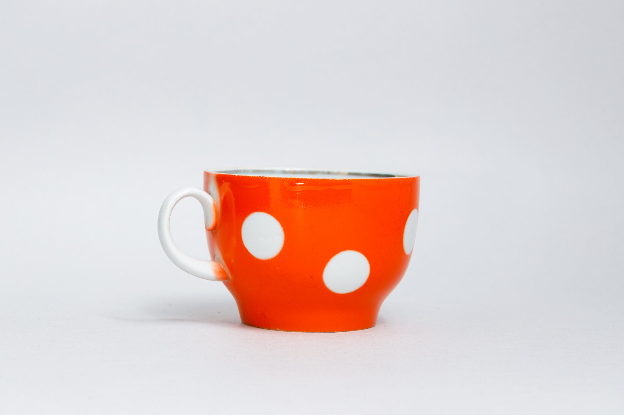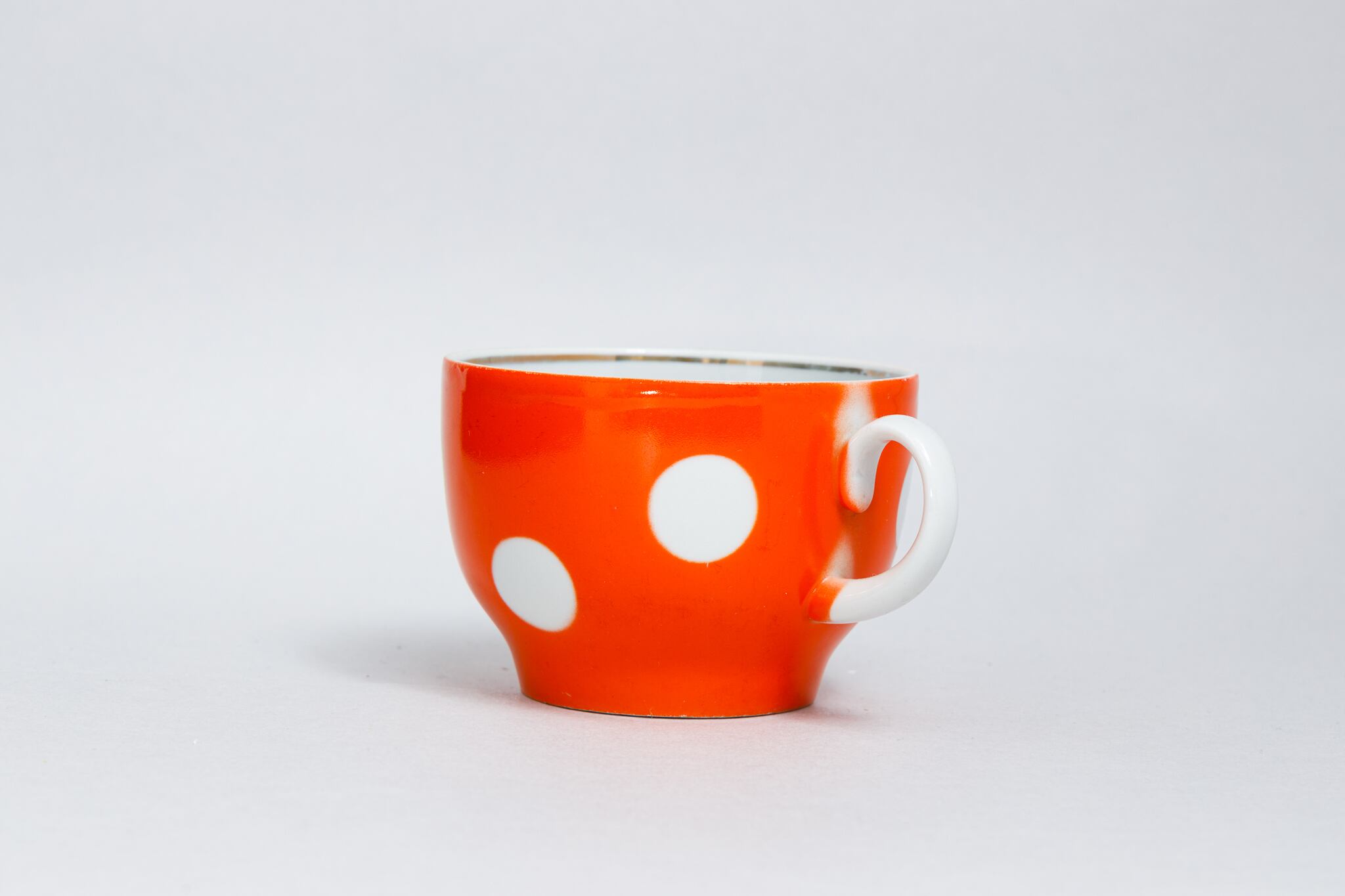 ヴィンテージのカップです。旧ソ連時代に生産された定番の水玉が描かれているカップです。とても発色の良いオレンジが他の国にないインパクトあるお品です。金色のリムがアクセントです。白の陶磁器に水玉部分を残して赤を吹き付けていて、とても雰囲気があります。ロシアのノブゴロドのクラスヌイ・ファルフォリスト磁器工場で1971-1991年に製造されました。旧ソ連の市場で購入しました。