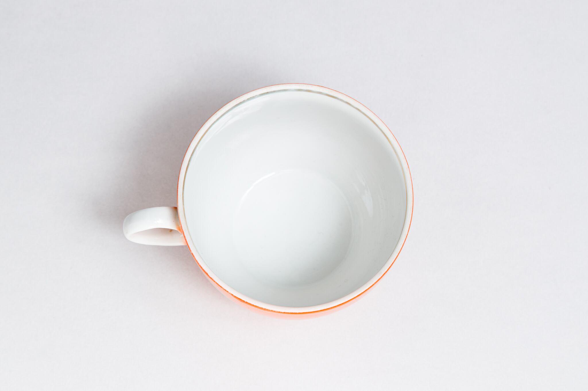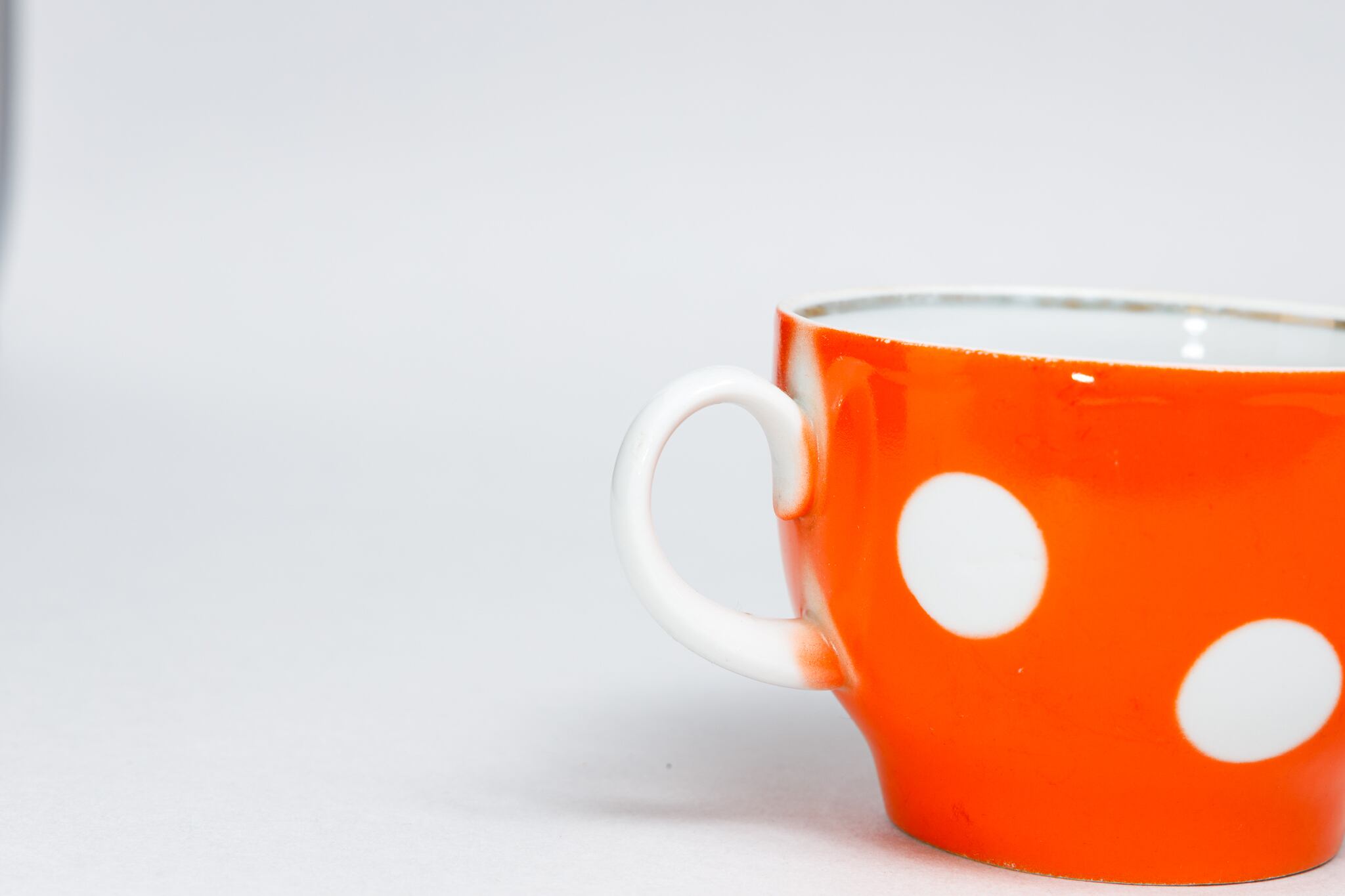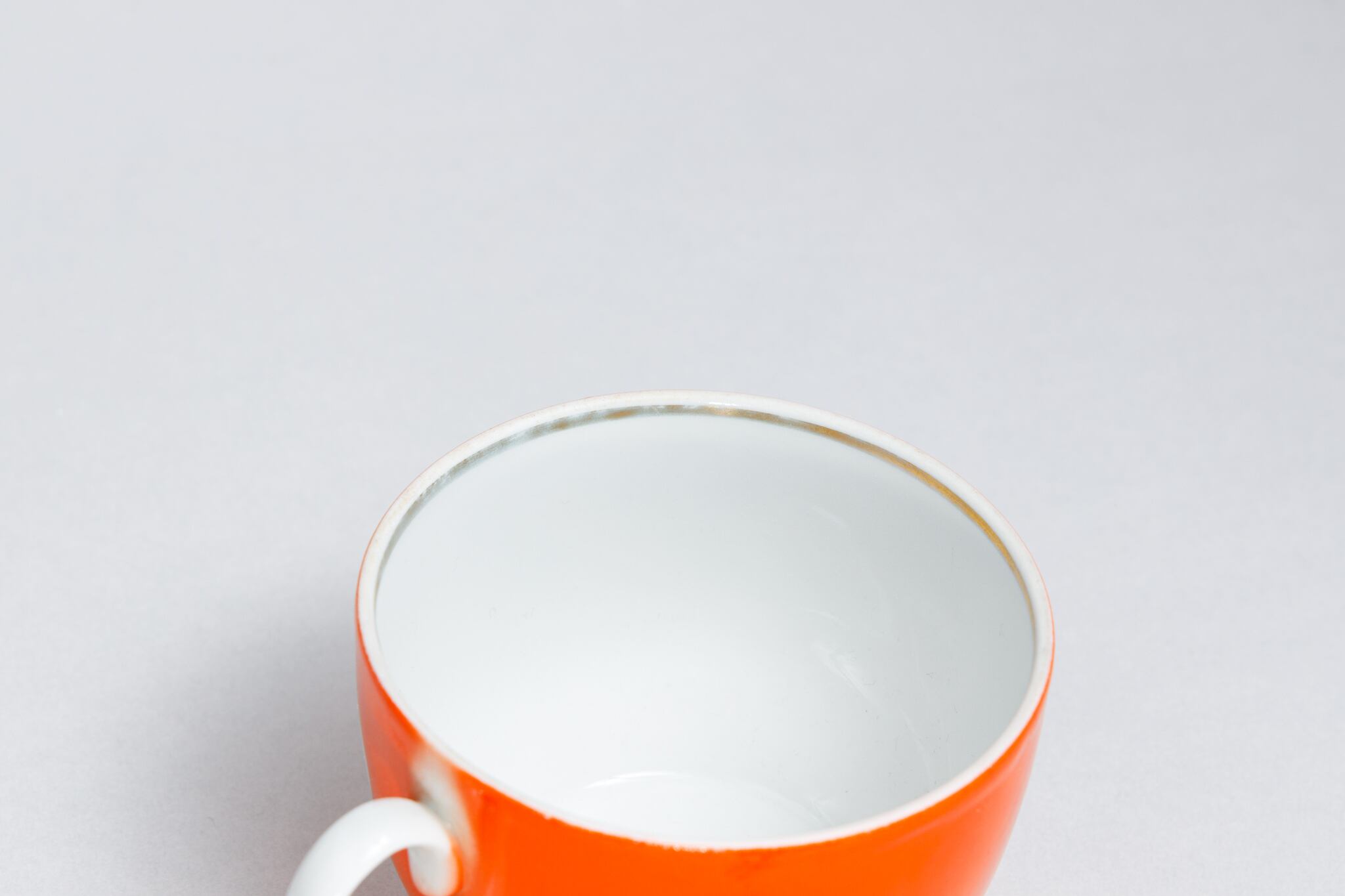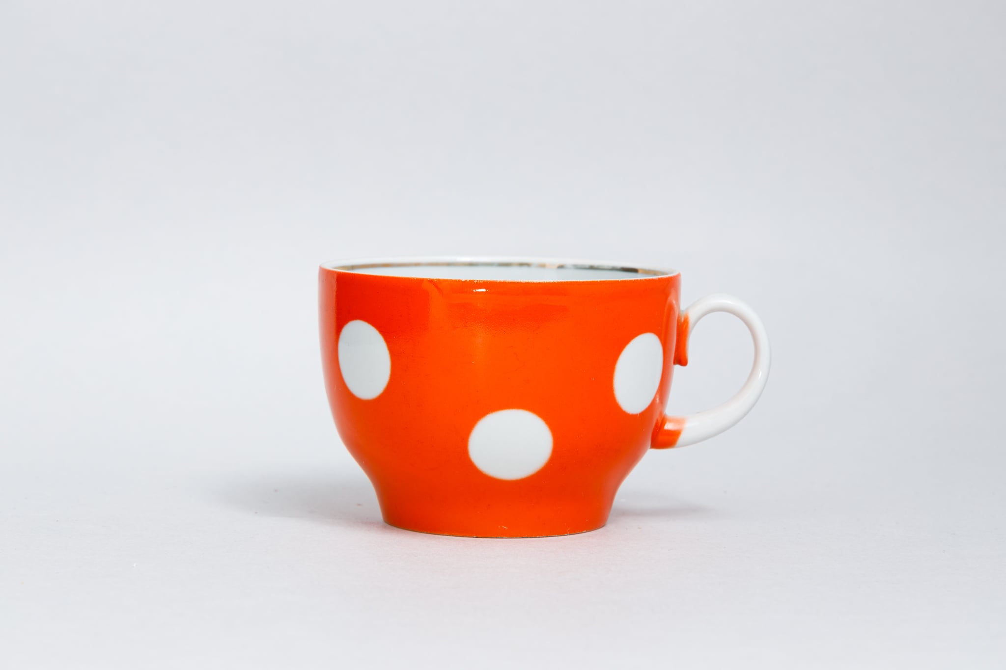ヴィンテージのカップです。旧ソ連時代に生産された定番の水玉が描かれているカップです。とても発色の良いオレンジが他の国にないインパクトあるお品です。金色のリムがアクセントです。白の陶磁器に水玉部分を残して赤を吹き付けていて、とても雰囲気があります。ロシアのノブゴロドのクラスヌイ・ファルフォリスト磁器工場で1971-1991年に製造されました。旧ソ連の市場で購入しました。