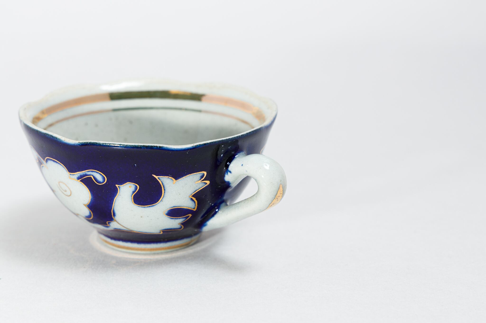 また、ソ連製は日本製などと違い、等級によって作りの丁寧さが違い、低い等級の物は、絵付けのムラがあったり、飲み口や底の多少の凹凸などがあったりします。