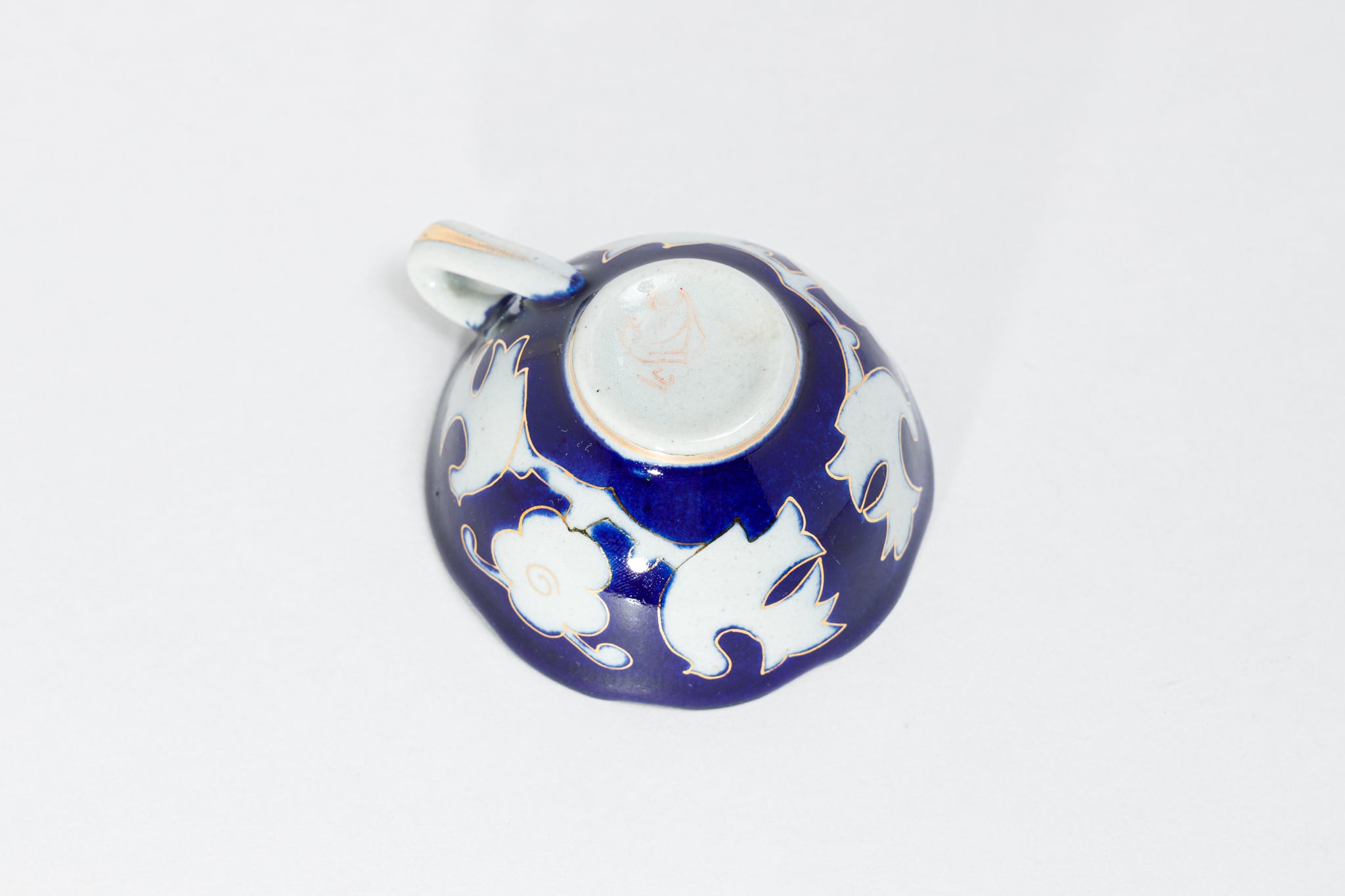 旧ソ連時代に生産された中央アジアで一番ポピュラーな柄のヴィンテージのデミカップです。 ウズベキスタンのタシケント磁器工場で1973-1991年に製造された物です。 ウズベキスタンでよく見る白と紺の綿花柄模様の食器ですがベースの色味が白ではなく青白磁のように少し青味を感じる色味で珍しいです。取っ手のない湯呑みはよく見かけますか、こちらはデミカップで希少です。カップの呑み口はまん丸ではなく波打っている形が素敵です。旧ソ連の市場で購入しました。