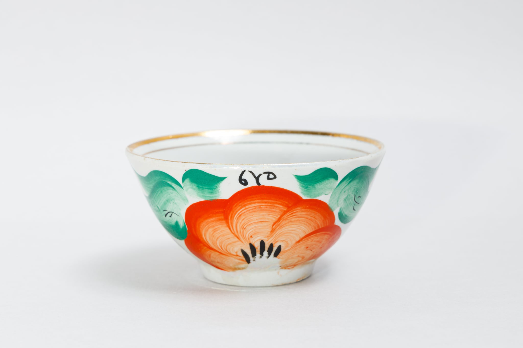 また、ソ連製は日本製などと違い、等級によって作りの丁寧さが違い、低い等級の物は、絵付けのムラがあったり、飲み口や底の多少の凹凸などがあったりします。