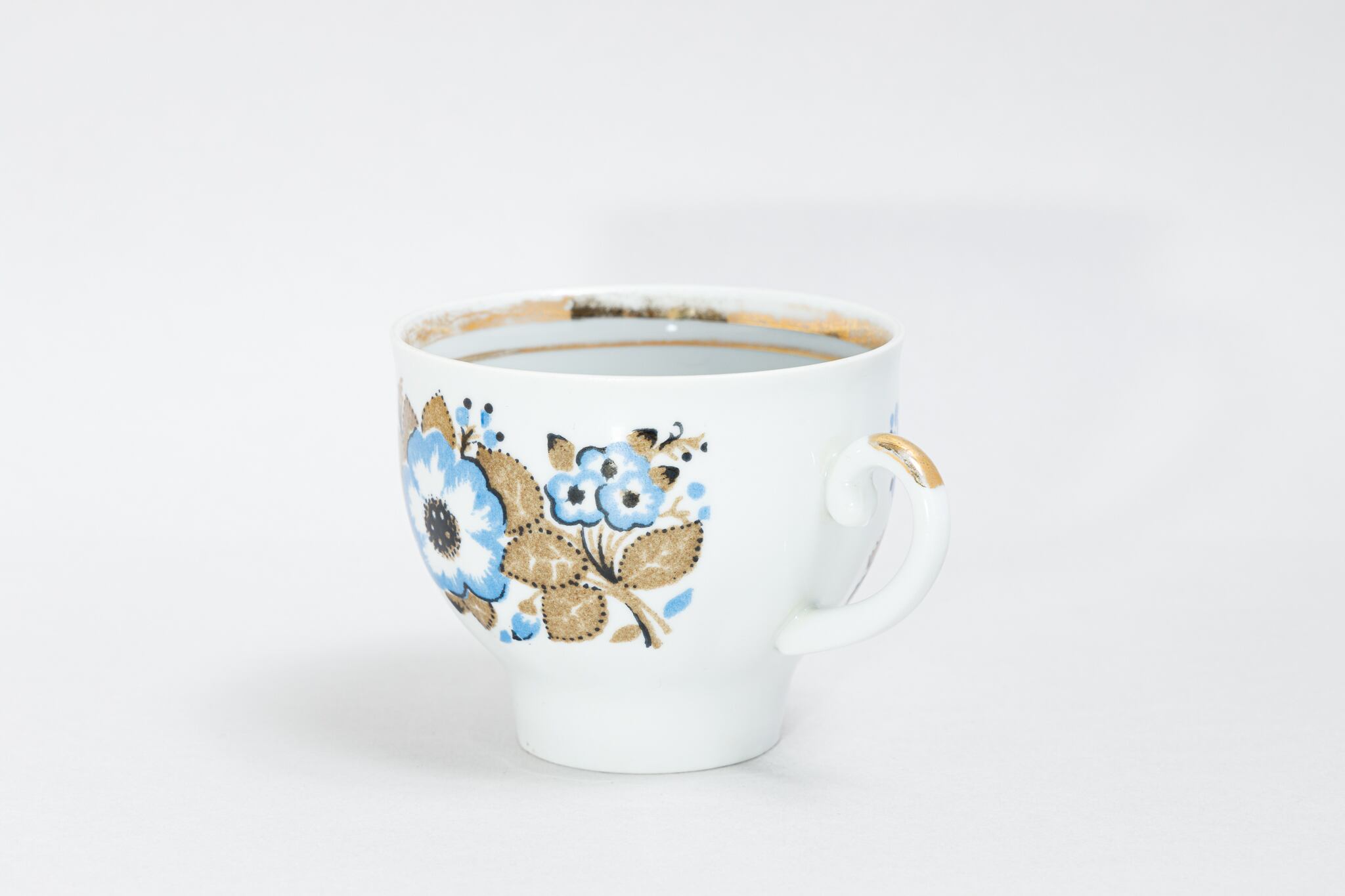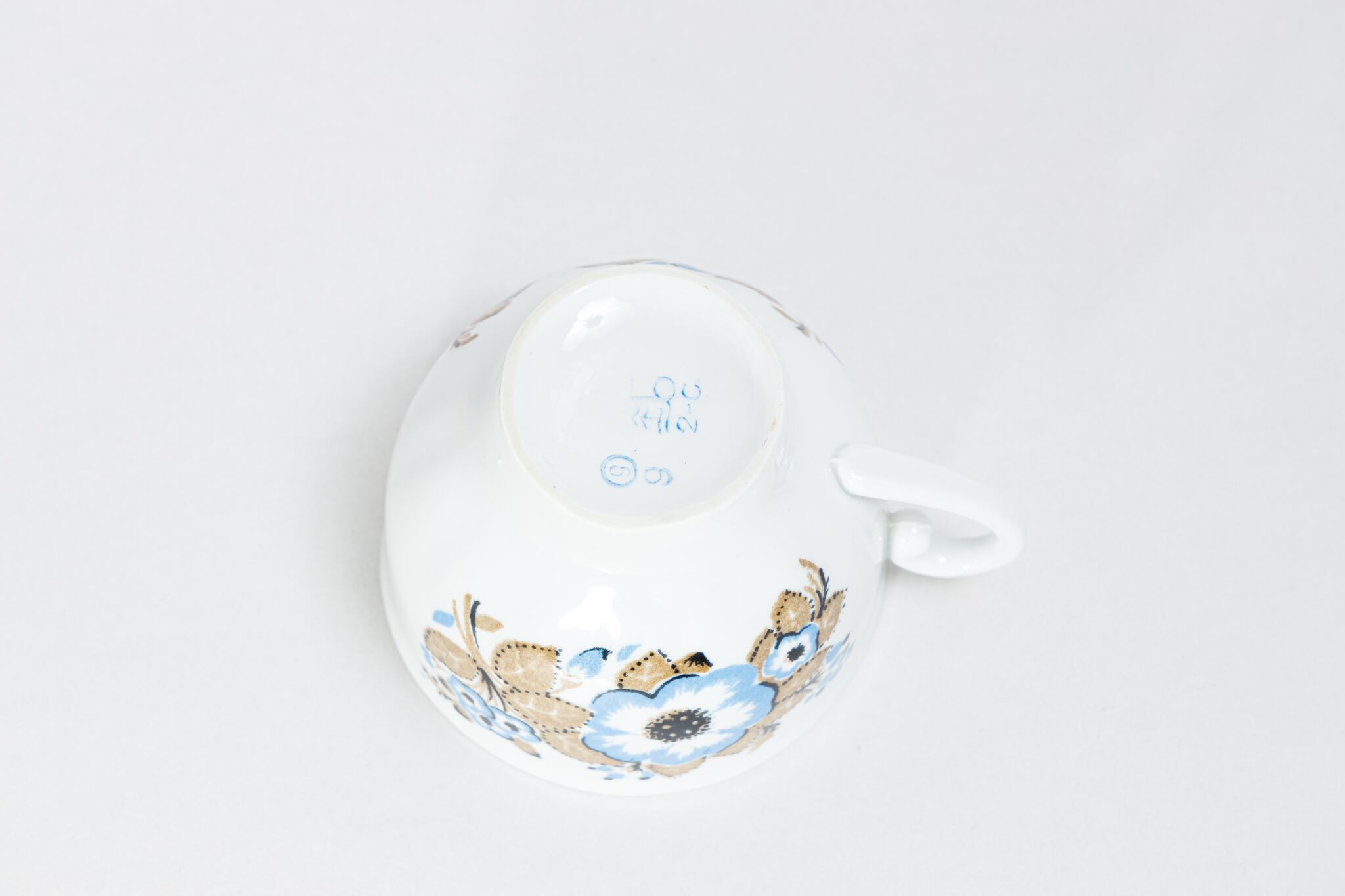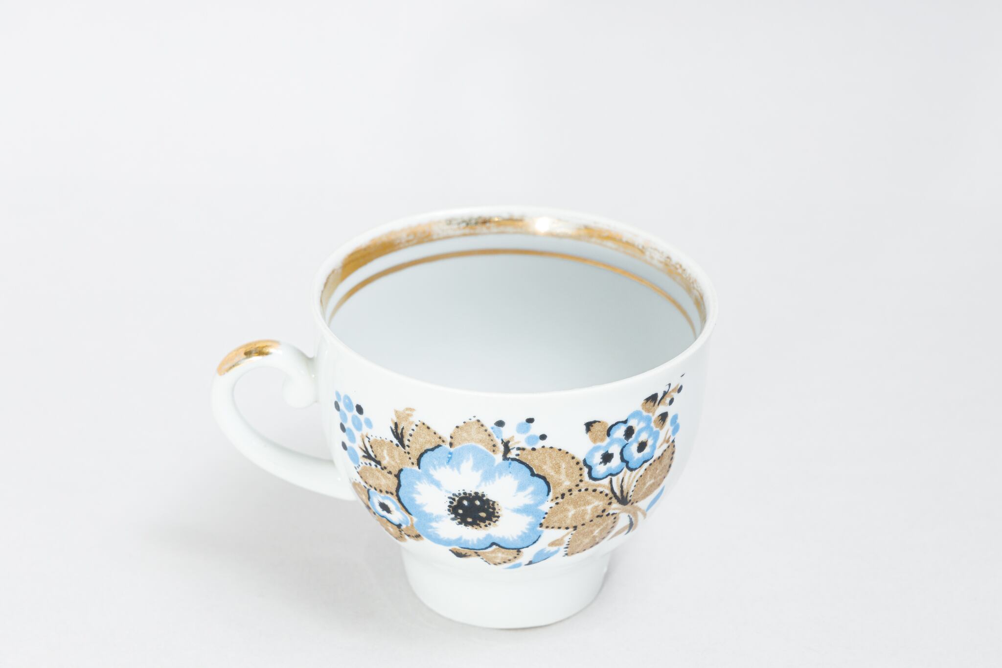 旧ソ連時代に生産されたカップです。このカップは、ウクライナのジトミール州のバラ二フカ磁器工場で1970年代から1991年に製造されました。ケシのような花をソ連らしい独特な感性で抽象的に描いた素敵なカップです。旧ソ連の市場で購入しました。