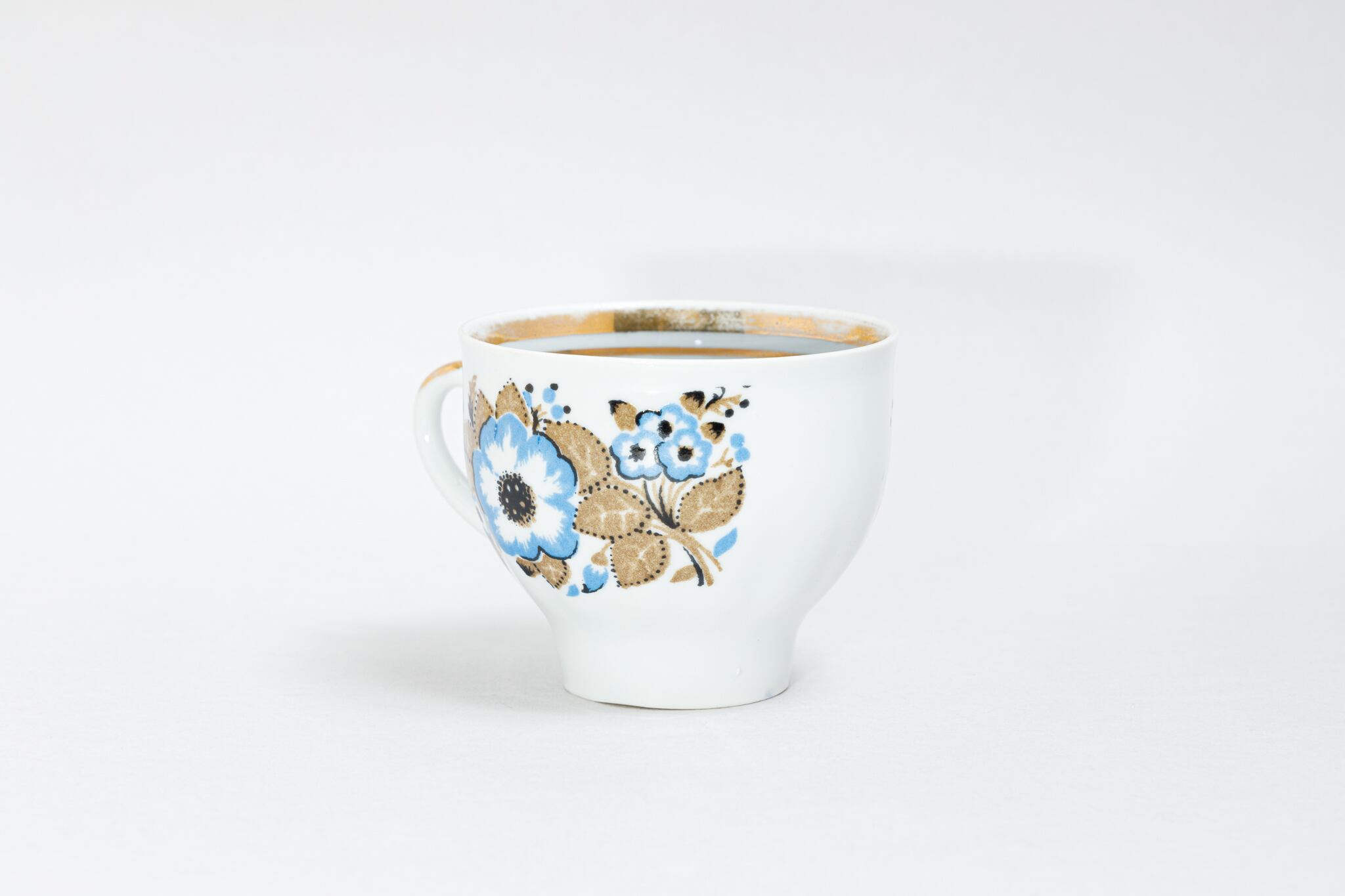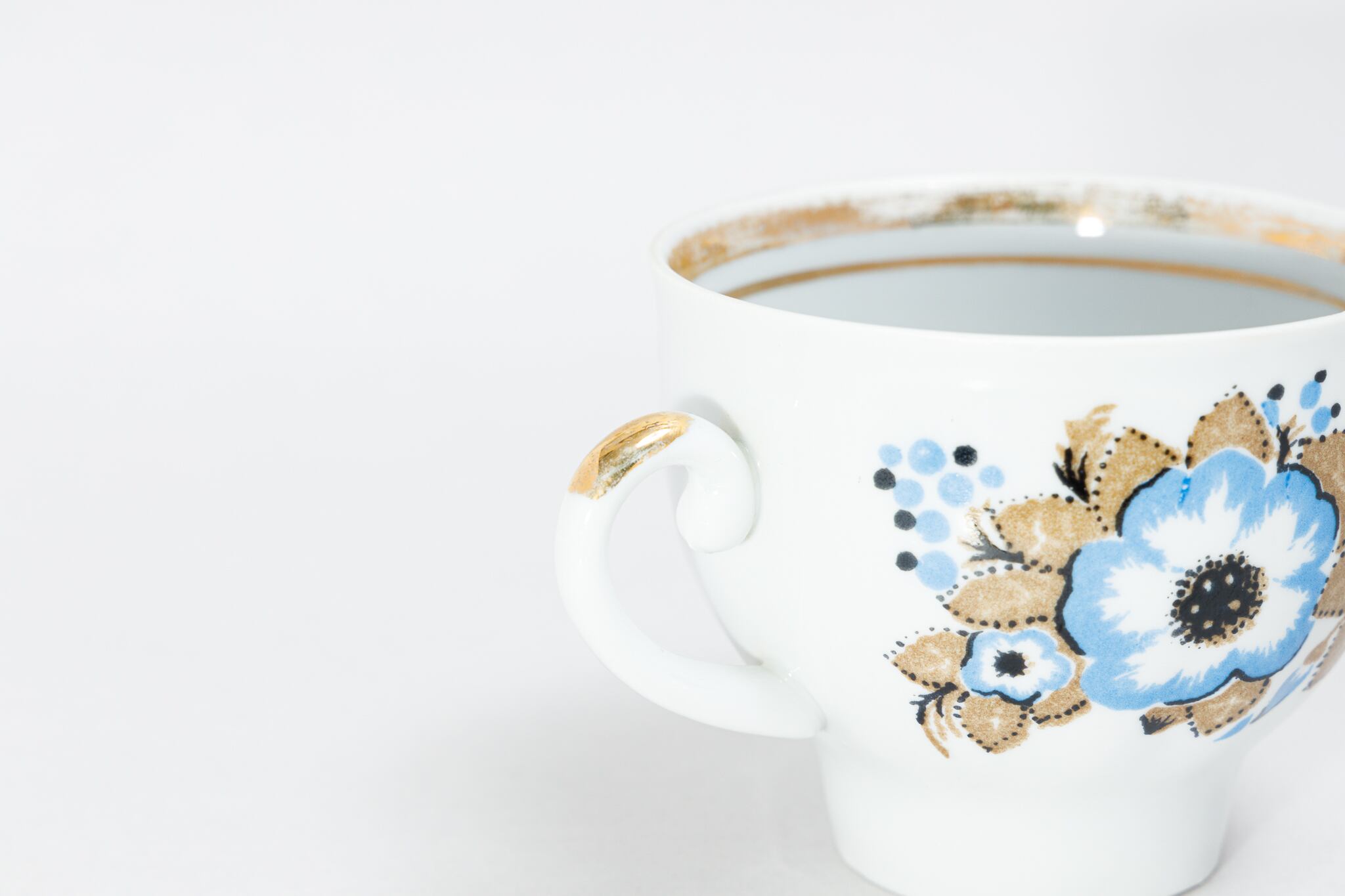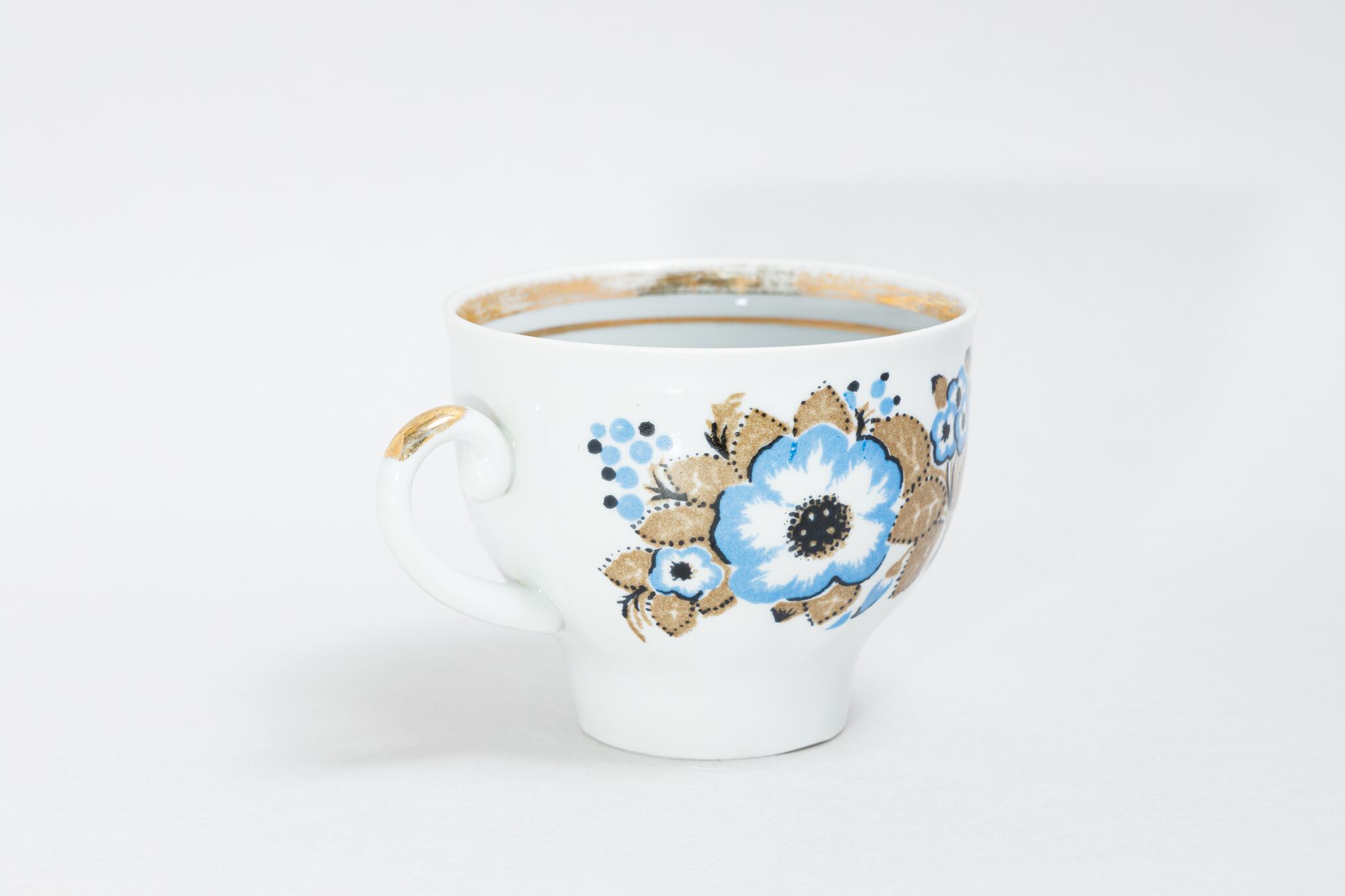 旧ソ連時代に生産されたカップです。このカップは、ウクライナのジトミール州のバラ二フカ磁器工場で1970年代から1991年に製造されました。ケシのような花をソ連らしい独特な感性で抽象的に描いた素敵なカップです。旧ソ連の市場で購入しました。