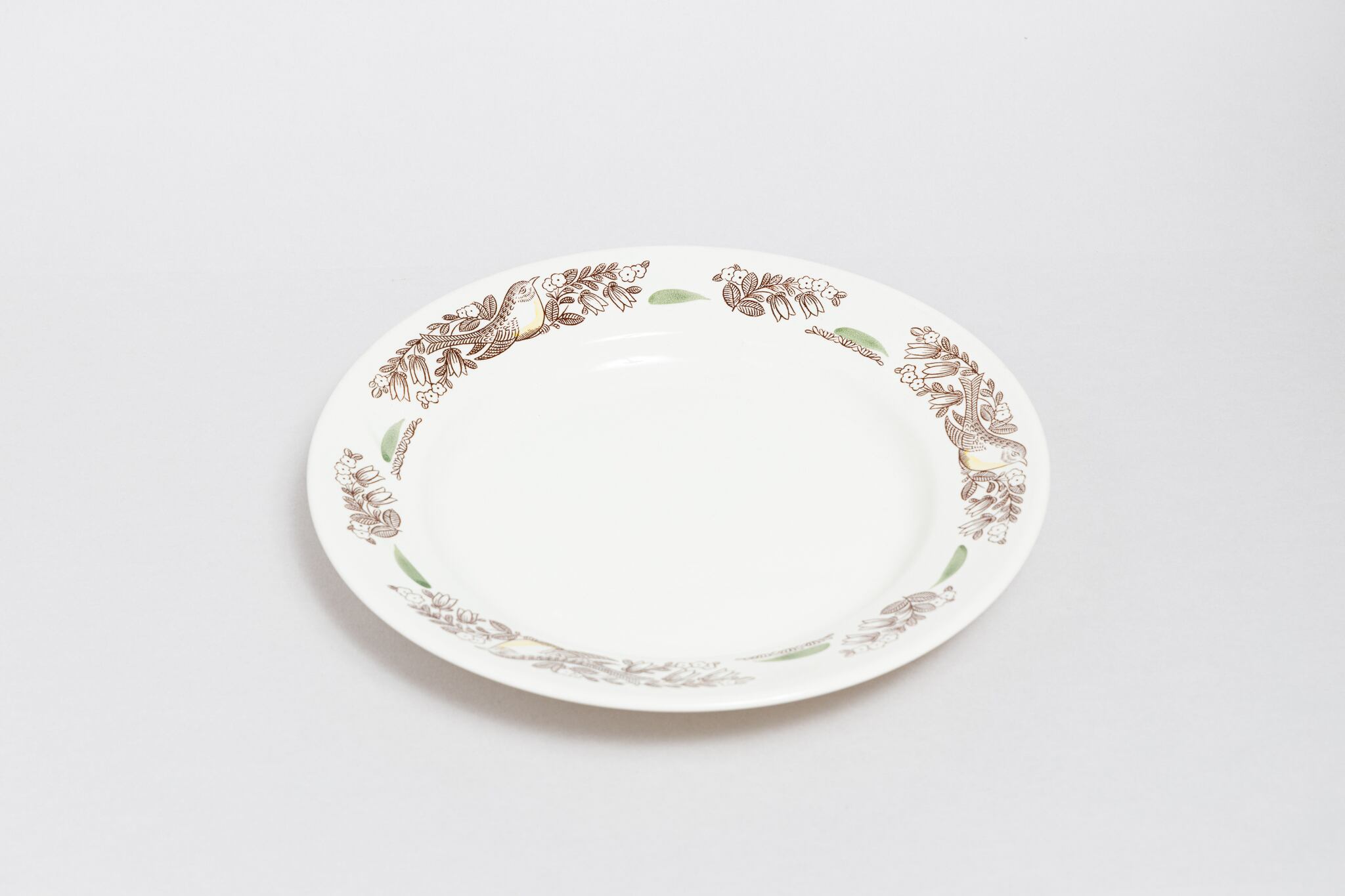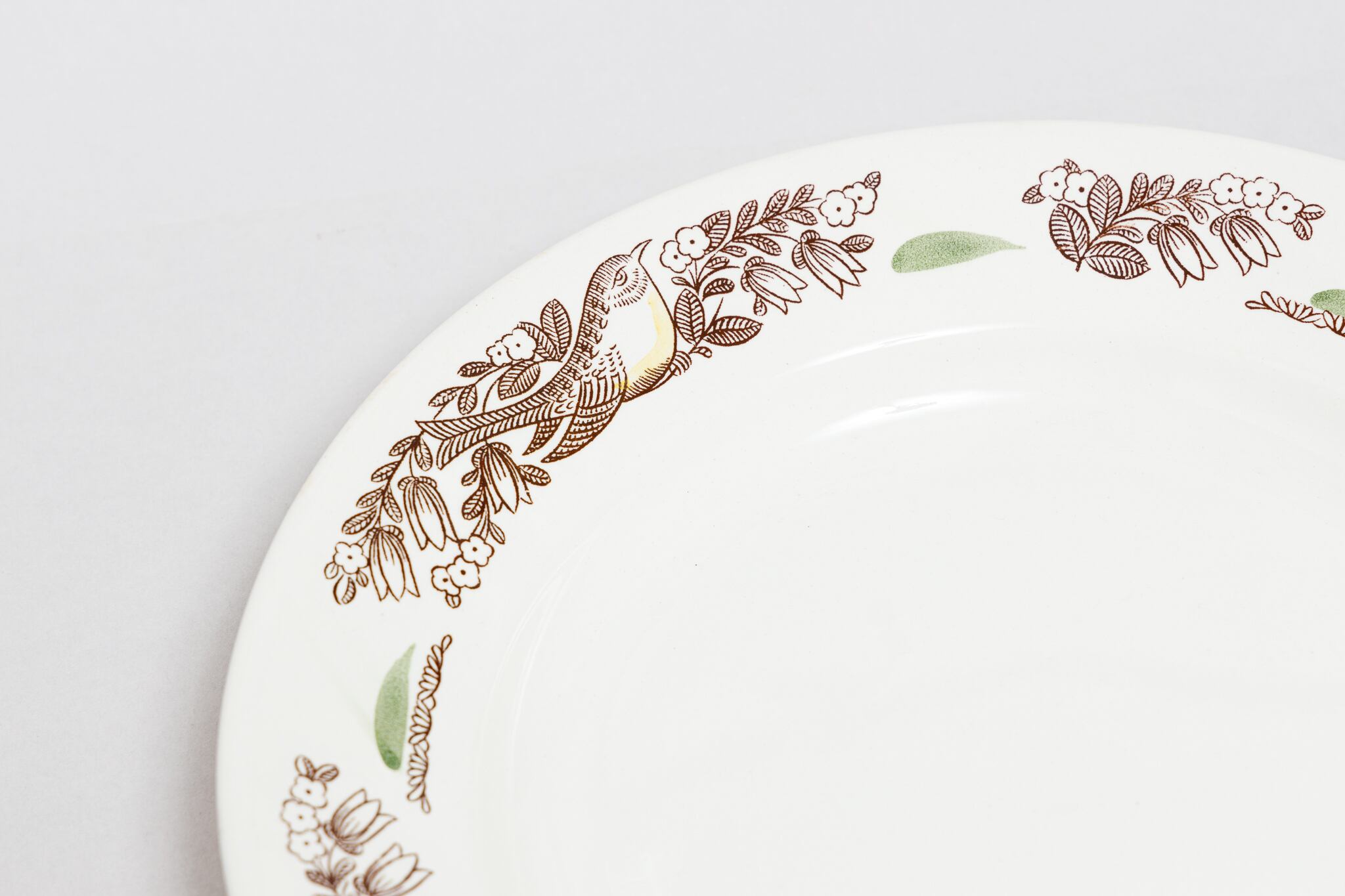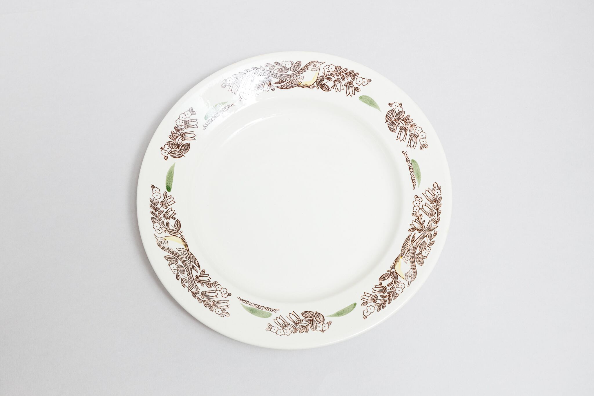 ヴィンテージの小鳥柄の少し大きめの皿です。草花にとまっている小鳥が描かれています。塗り絵のような緑とオレンジが差し色となり全体を華やかな印象にしています。ロシアのトヴェリ州コナコヴォ陶器工場で1974-1991年に製造されました。コナコヴァらしい優しい色合いと素朴な風合いが素敵です。旧ソ連の市場で購入しました。