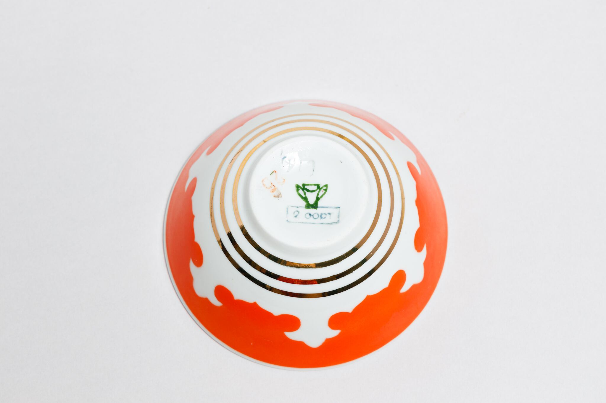 また、ソ連製は日本製などと違い、等級によって作りの丁寧さが違い、低い等級の物は、絵付けのムラがあったり、飲み口や底の多少の凹凸などがあったりします。