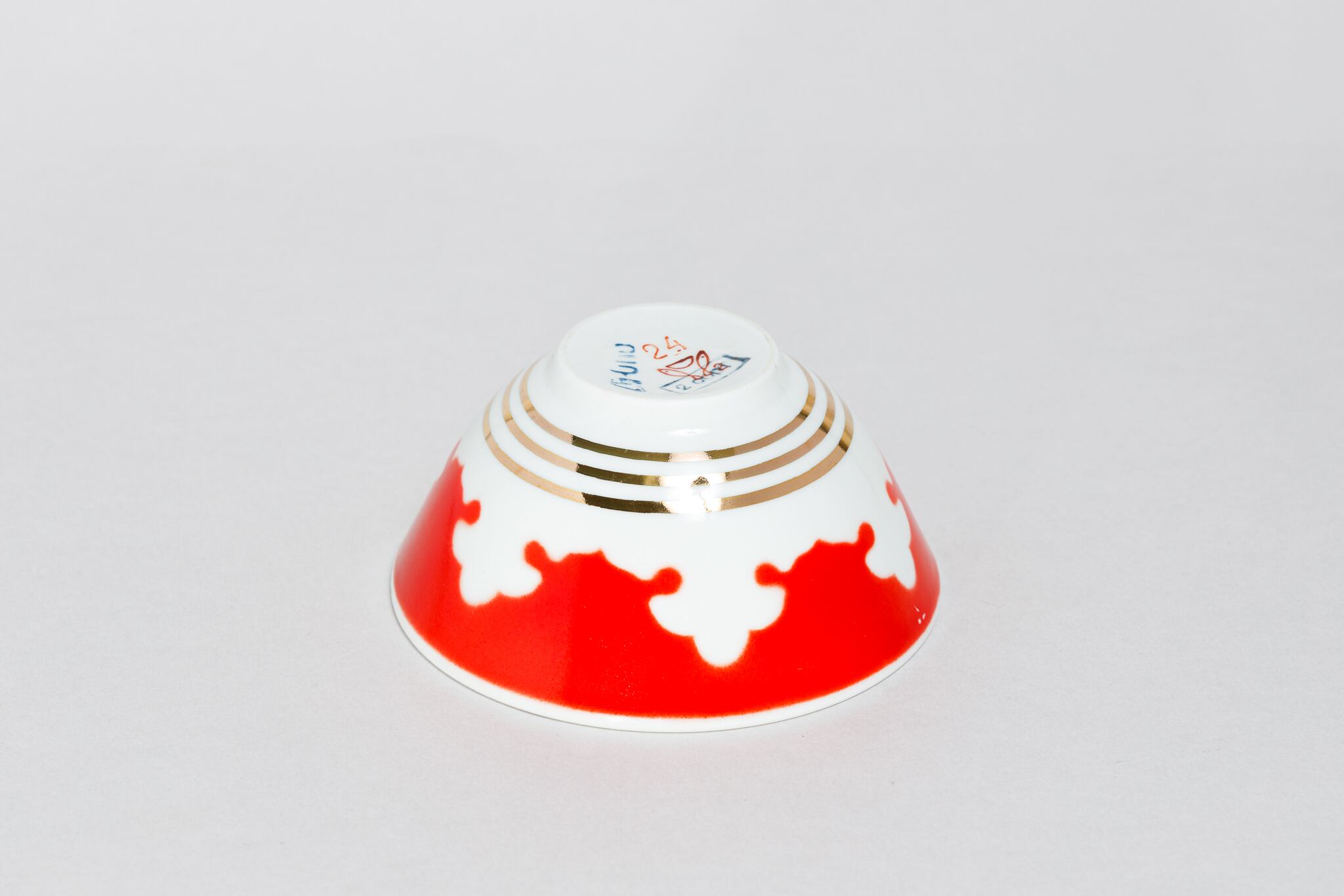 また、ソ連製は日本製などと違い、等級によって作りの丁寧さが違い、低い等級の物は、絵付けのムラがあったり、飲み口や底の多少の凹凸などがあったりします。