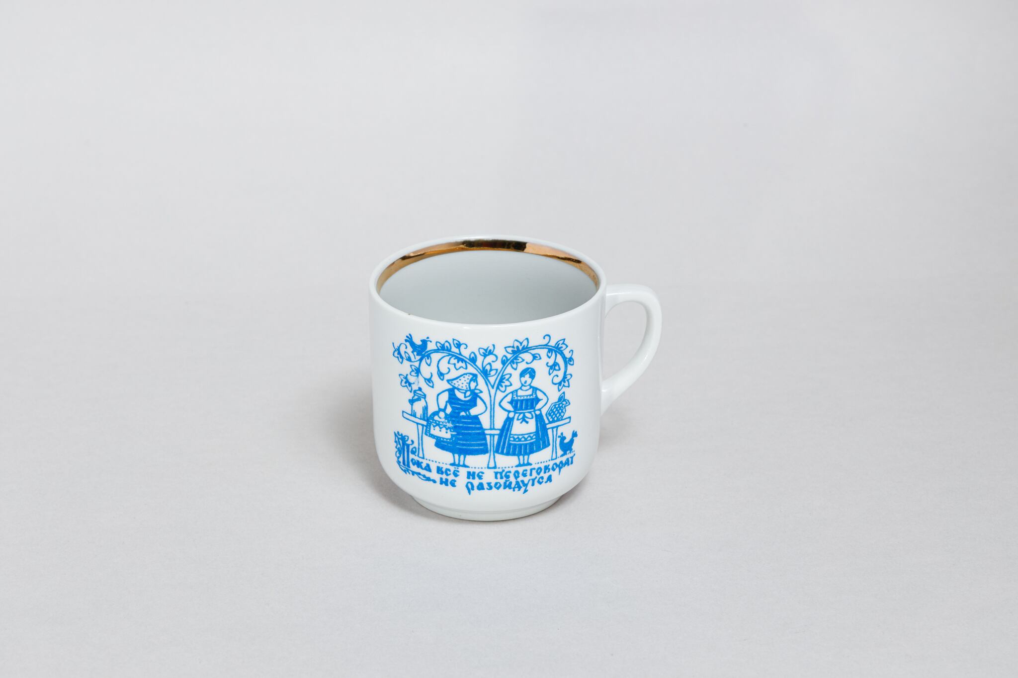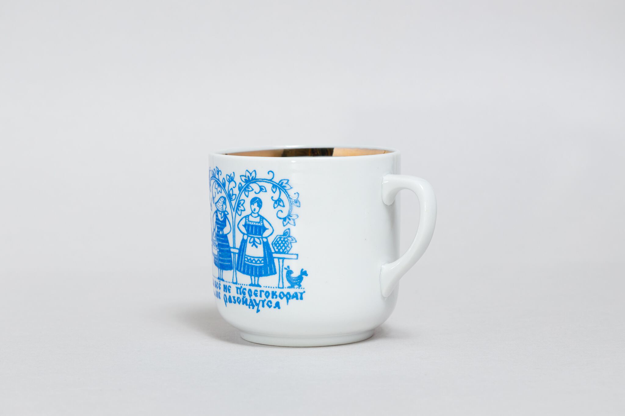 ヴィンテージのカップです。旧ソ連時代の1965 -1991年にロシアのドミトロフ磁器工場で生産されたカップです。ロシアの農家の日常が描かれています。女性二人が話をしていて、「話が終わらないと、帰らない」とロシア文字で書かれています。ロシアの日常が感じられる絵柄です。