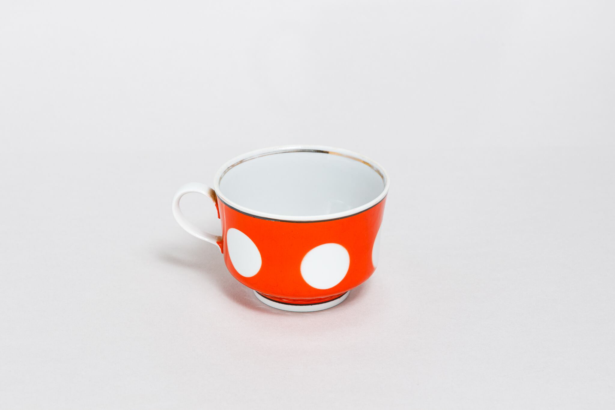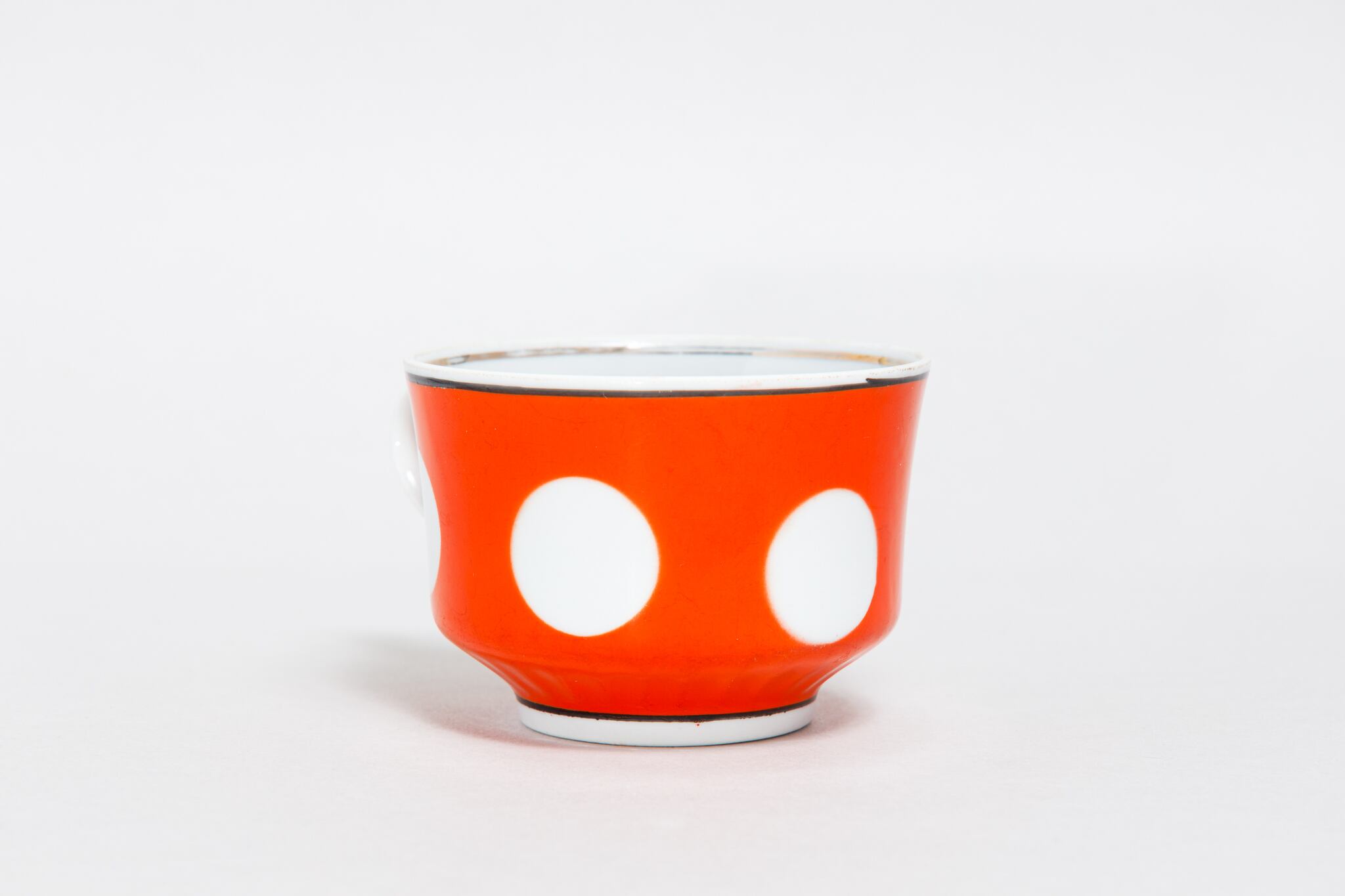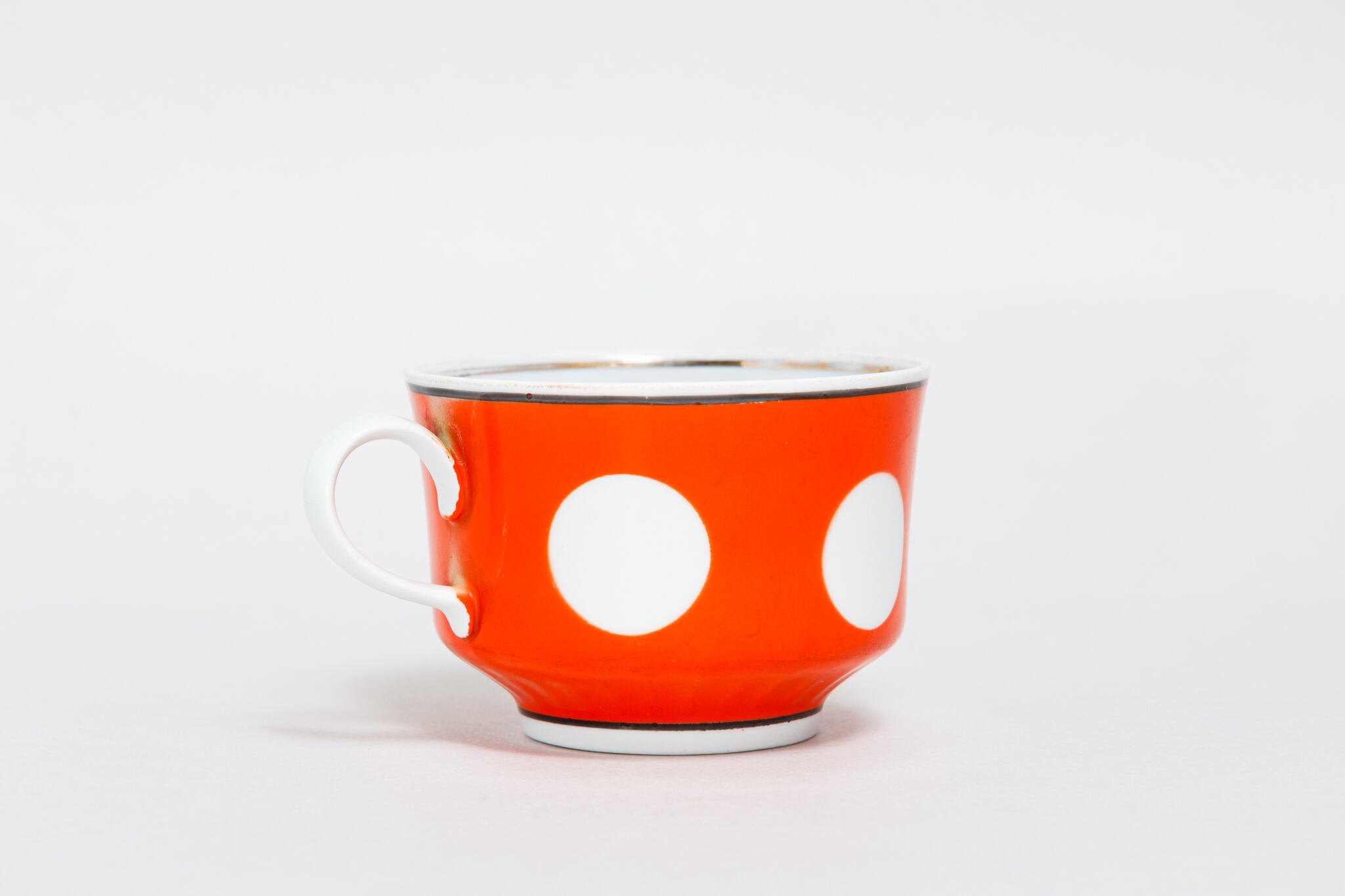 ヴィンテージのカップです。旧ソ連時代に生産されました。朱色に大きな白の水玉柄が描かれています。縁と下に黒の線があり、シャープな感じがします。ウクライナのテルノーピリ磁器工場で1975-1991年に製造されました。旧ソ連の市場で購入しました。