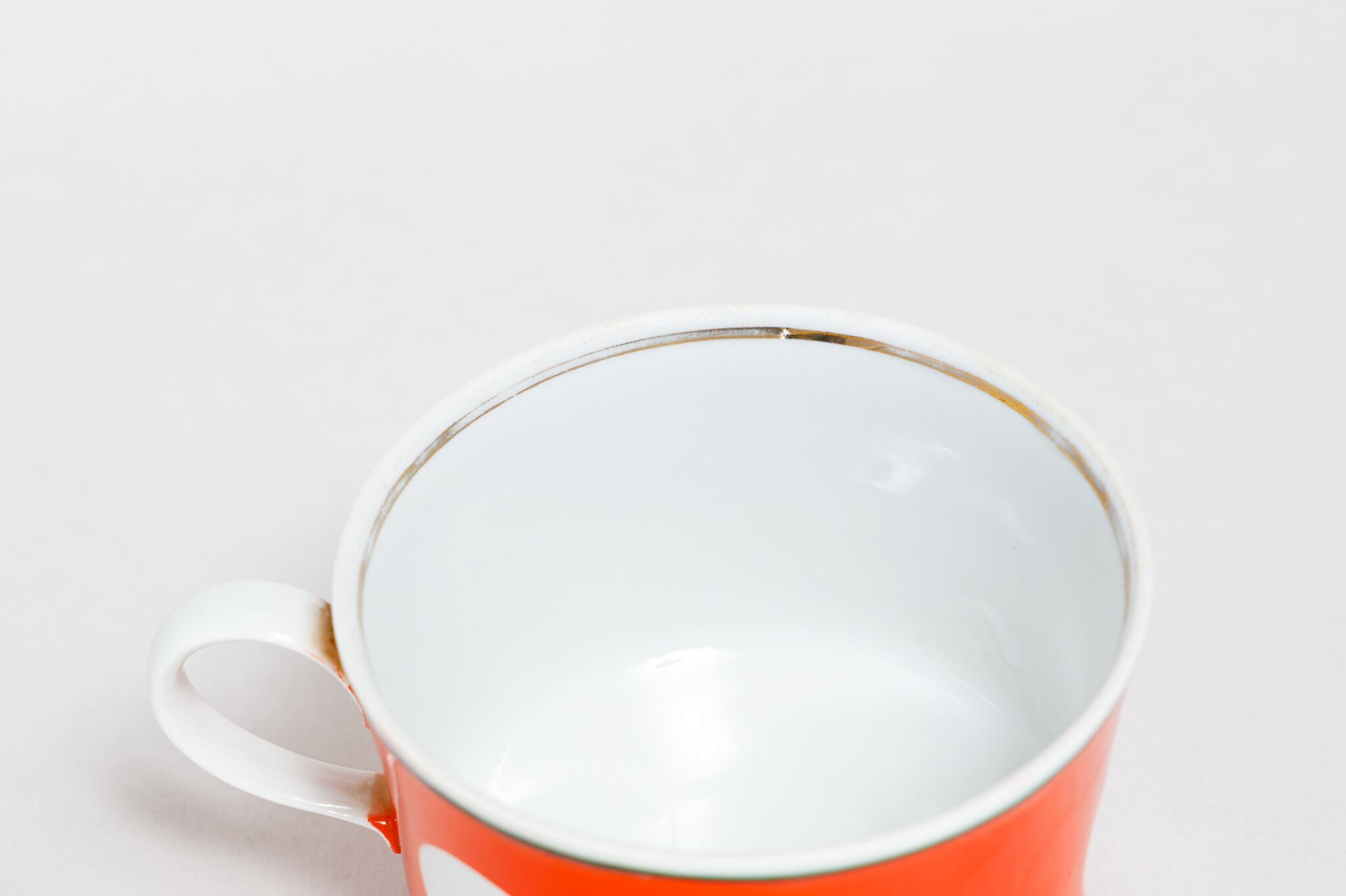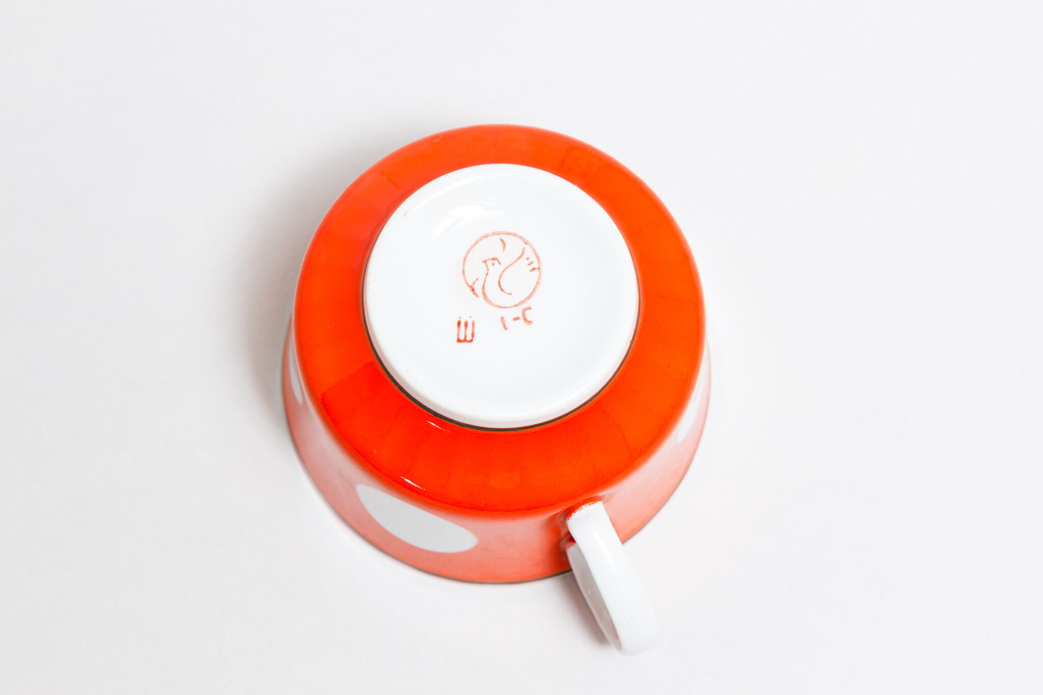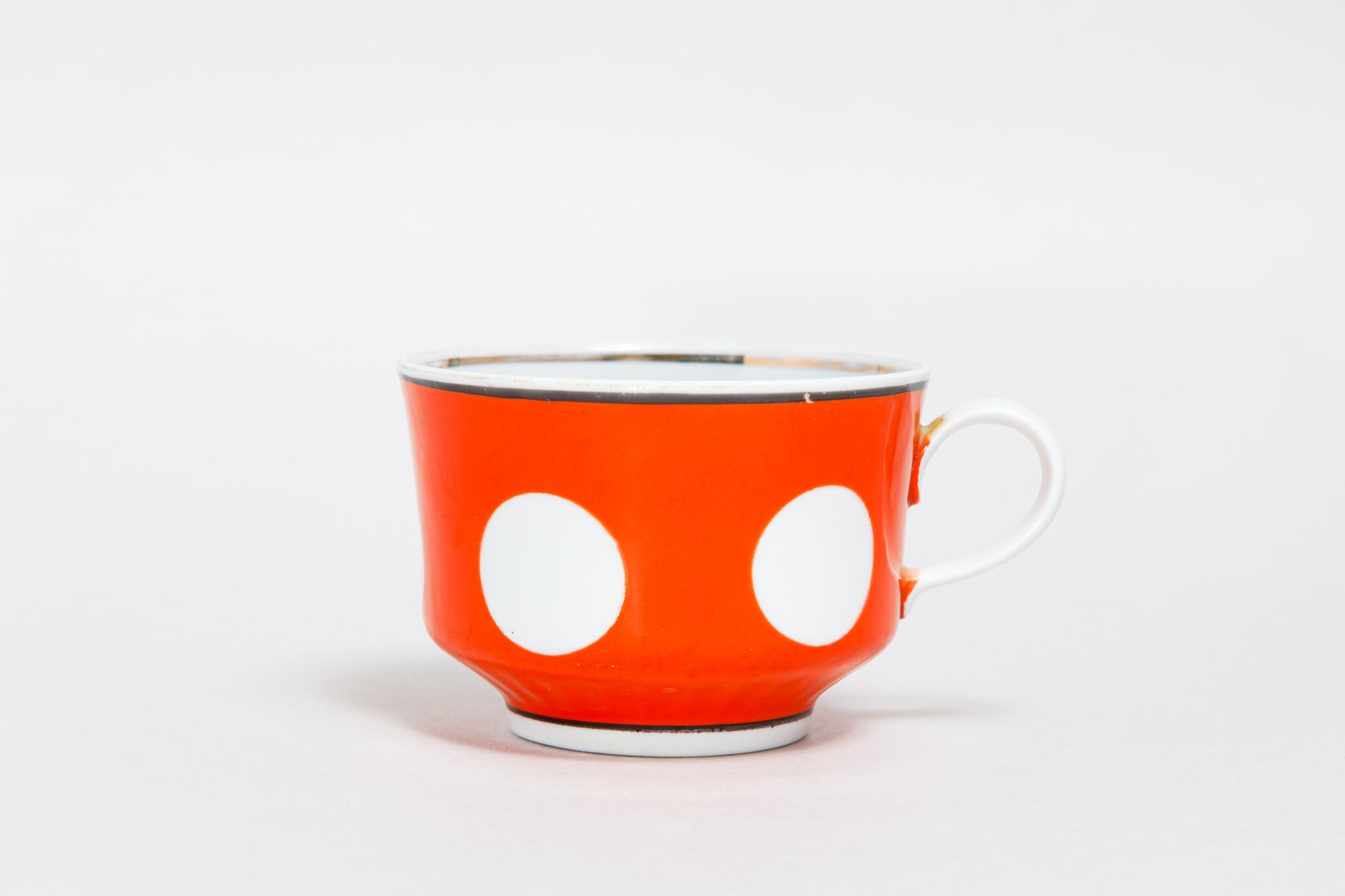 ヴィンテージのカップです。旧ソ連時代に生産されました。朱色に大きな白の水玉柄が描かれています。縁と下に黒の線があり、シャープな感じがします。ウクライナのテルノーピリ磁器工場で1975-1991年に製造されました。旧ソ連の市場で購入しました。