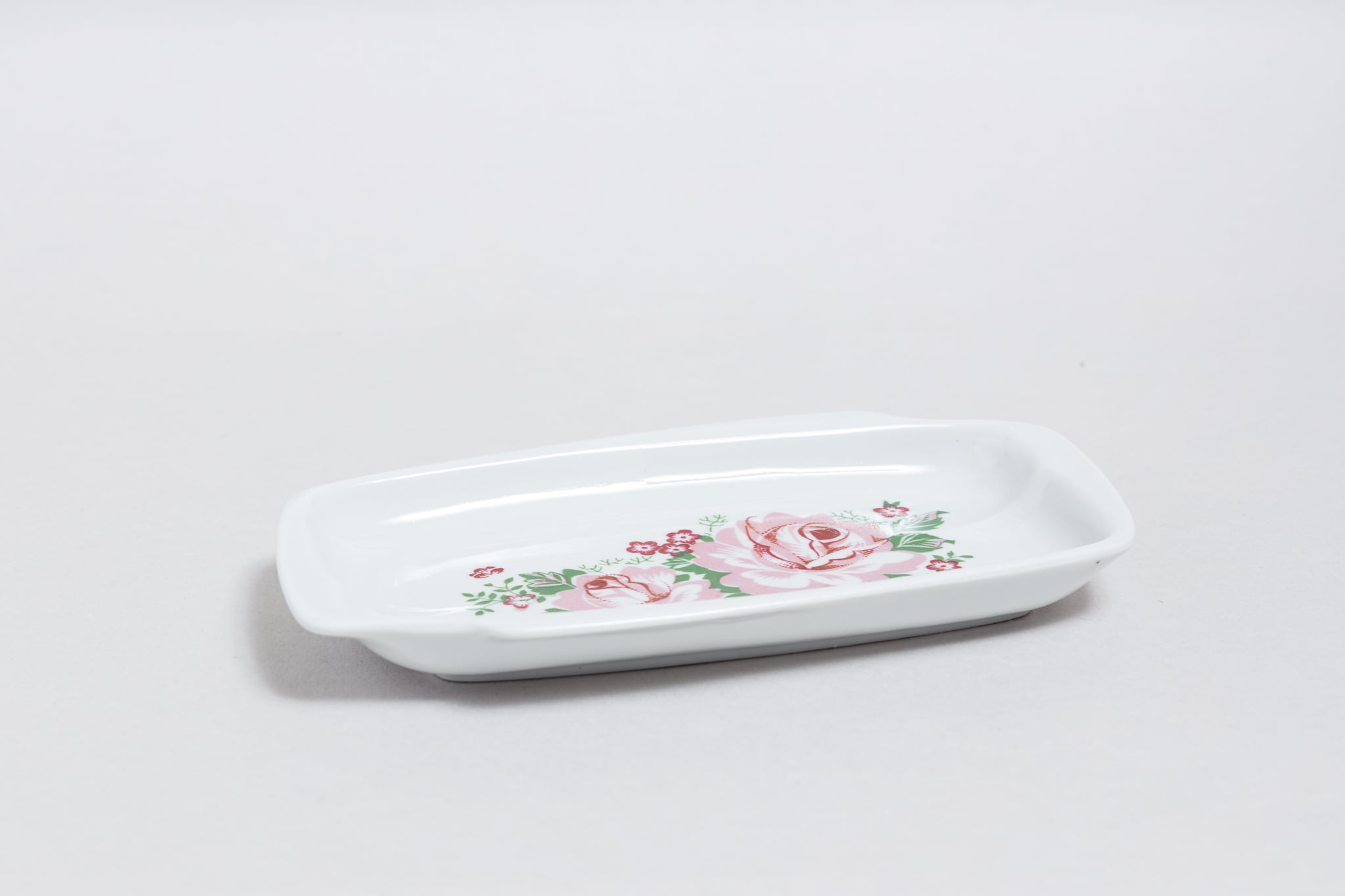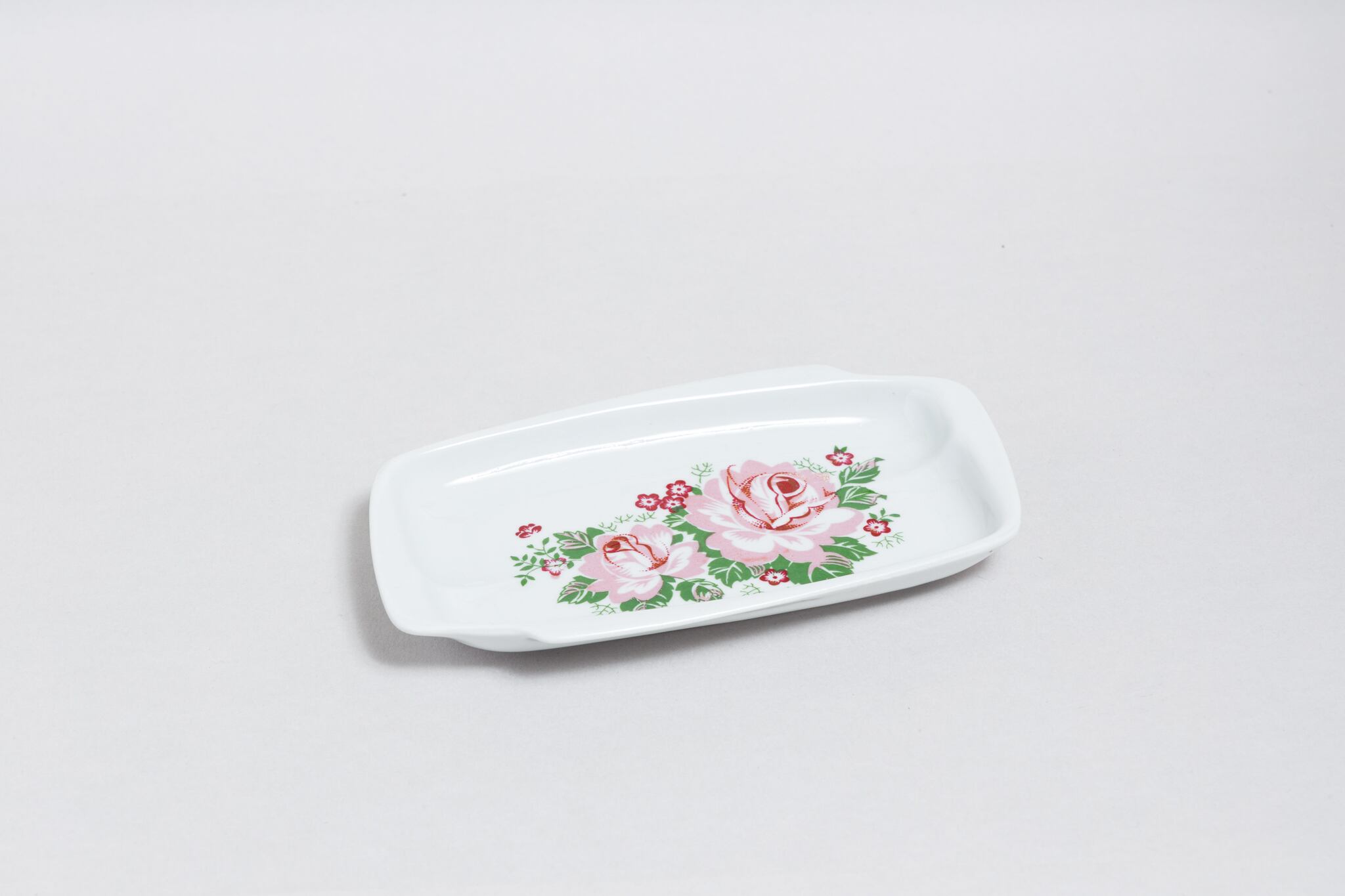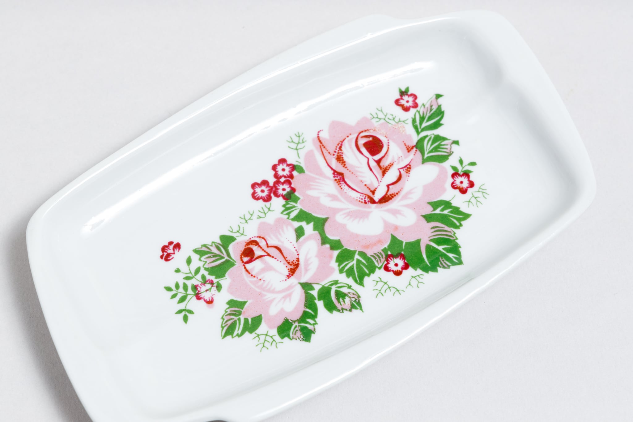ヴィンテージの形の変わったバラ柄のお皿です。旧ソ連時代の1965 -1991年にロシアのドミトロフ磁器工場で生産された皿です。デザートを入れても良いですし、またアクセサリーを置くのにも素敵かなと思います。ピンクのバラの花が描かれていてとても可愛らしいです。