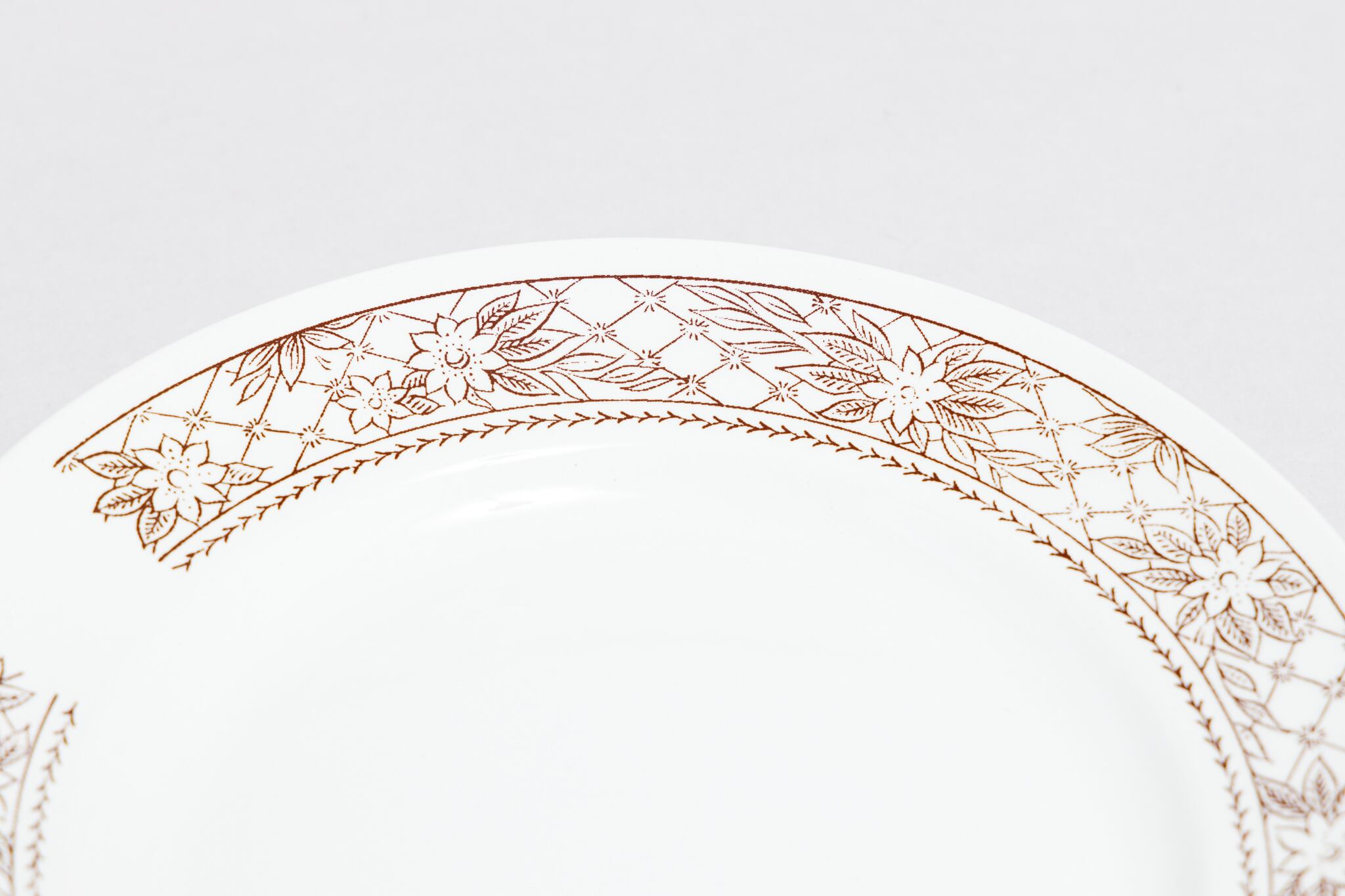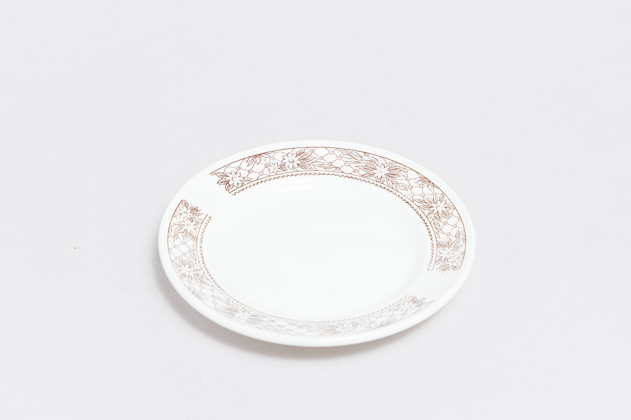 ヴィンテージの幾何学的な茶色の花が描かれた皿です。デザートなどを入れるのにぴったりの大きさです。ロシアのトヴェリ州コナコヴォ陶器工場で1974-1991年に製造されました。コナコヴァらしい優しい色合いと素朴な風合いが素敵です。旧ソ連の市場で購入しました。