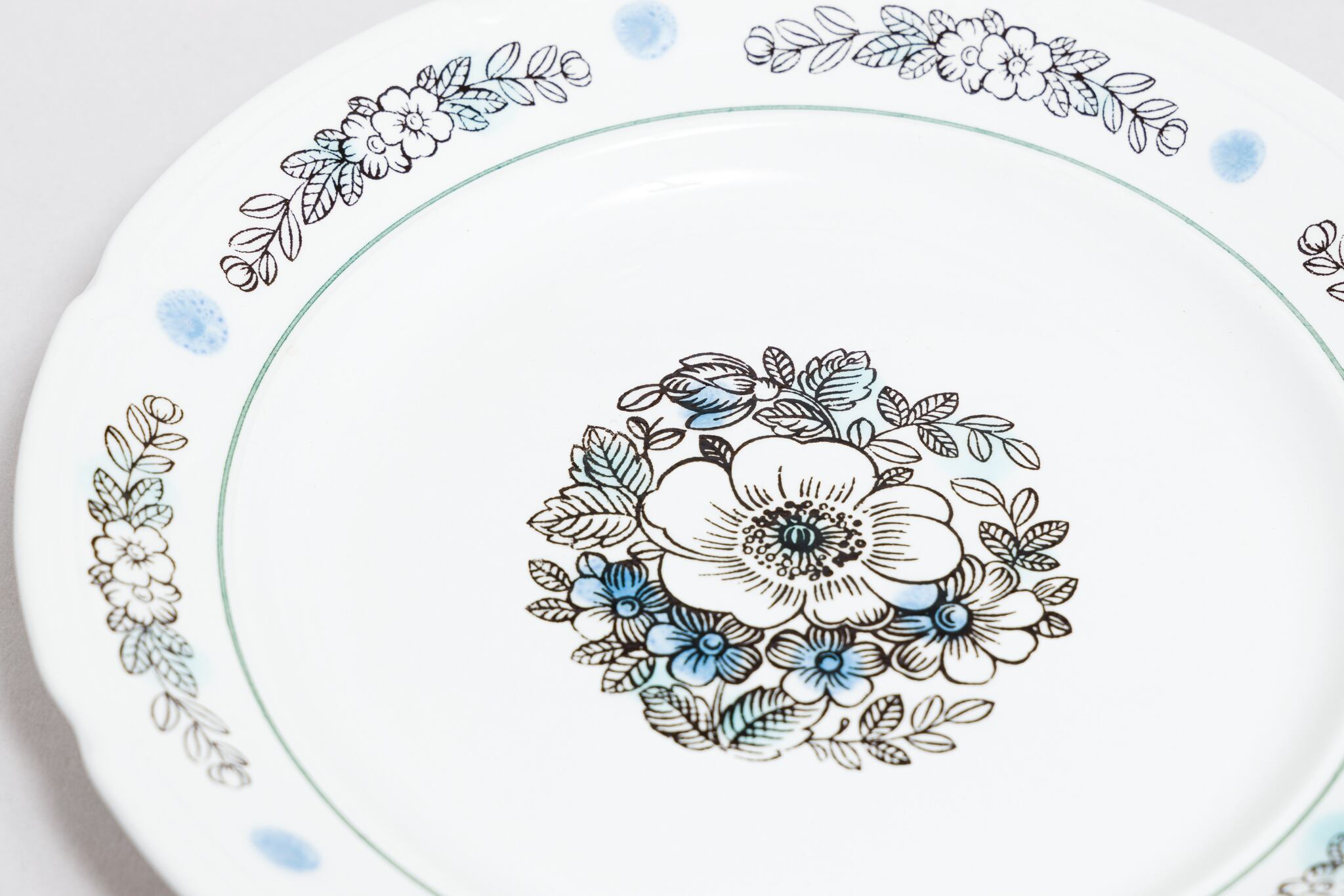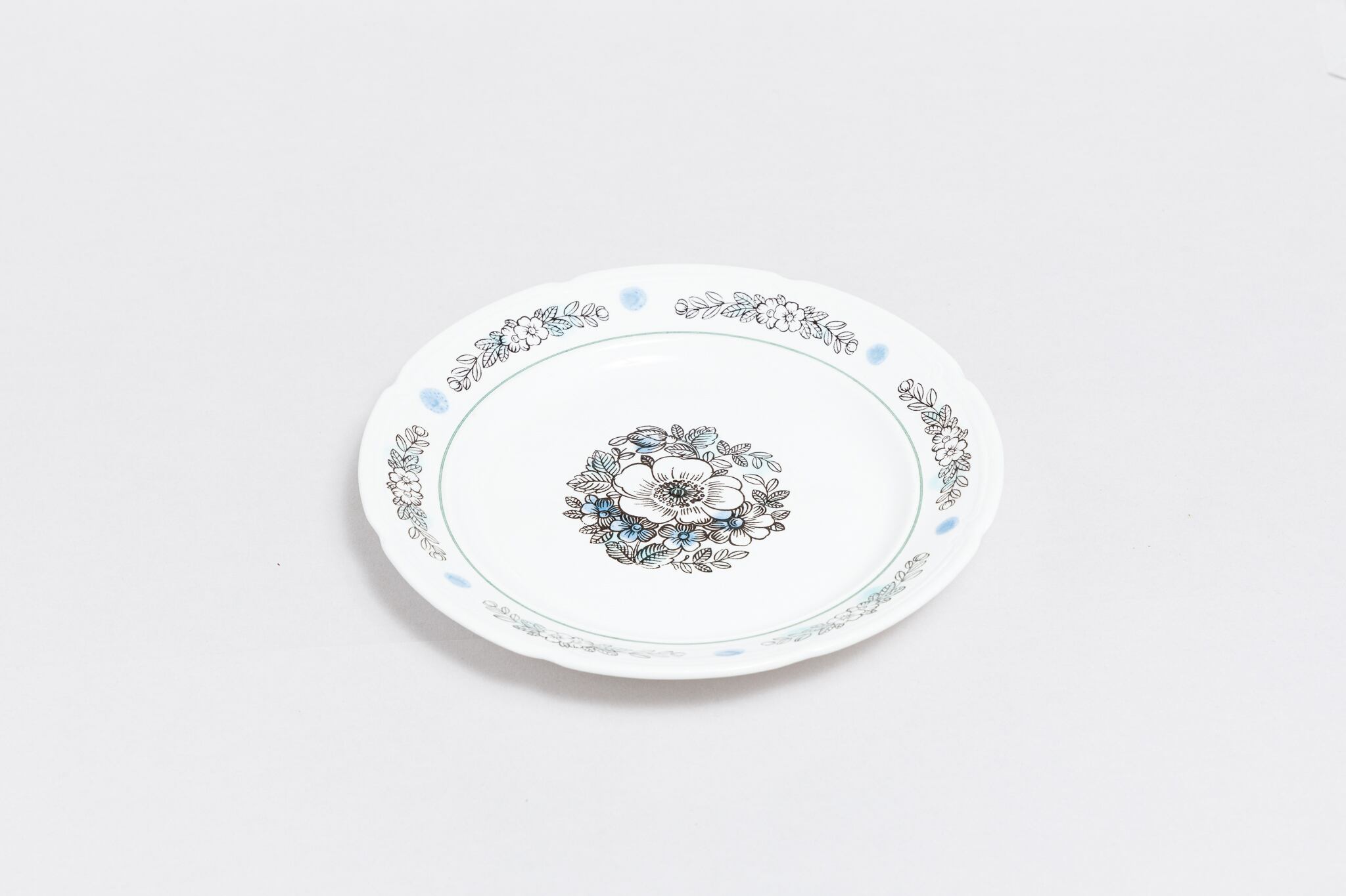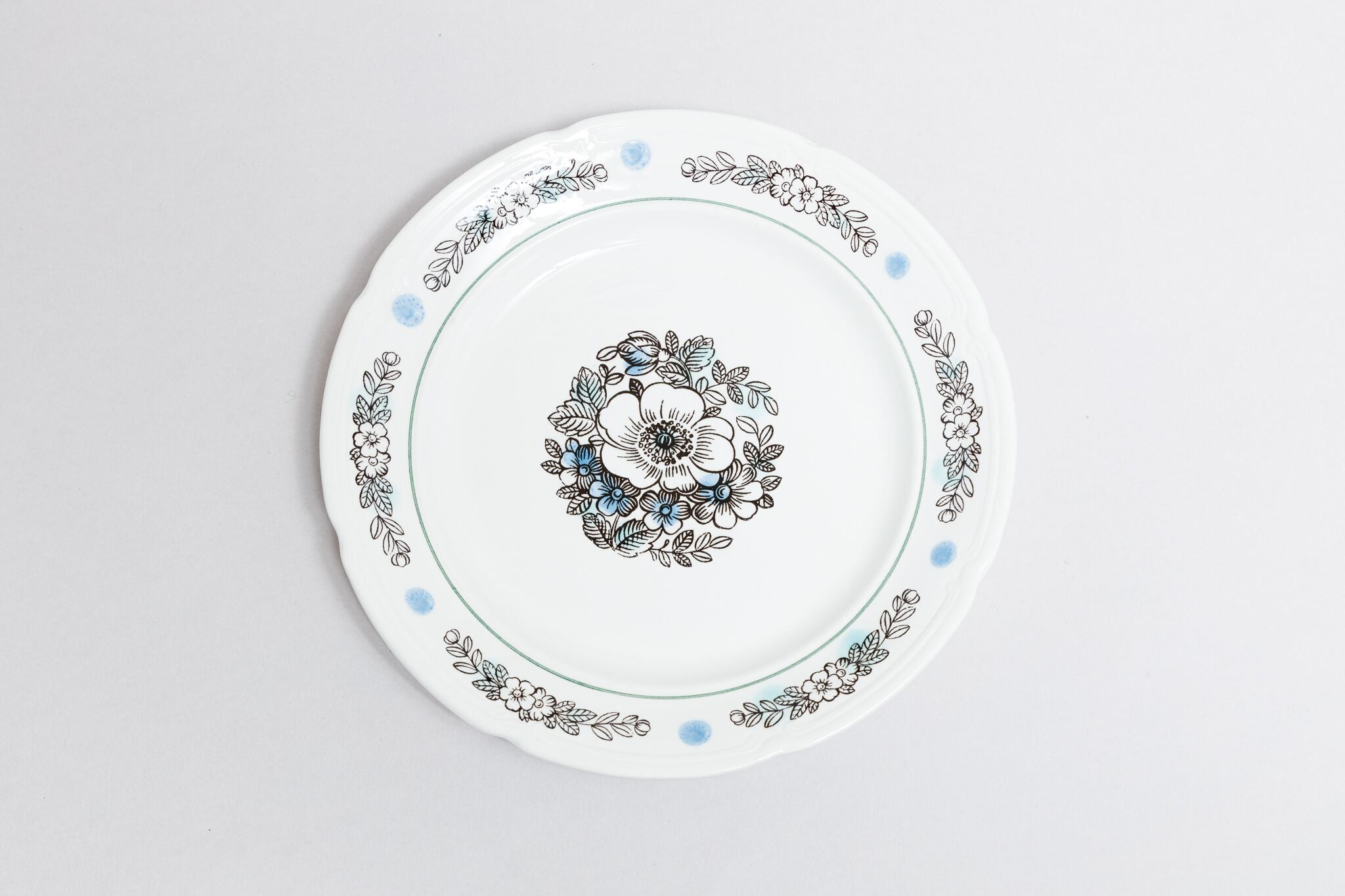 ヴィンテージのお皿です。ロシアのトヴェリ州コナコヴォ陶器工場で1974-1991年に製造されたものです。植物柄で、よく見られるコナコヴァ柄ですが、単色ではなく、ブルーのドットが全体に散らばっていて、爽やかな感じを醸し出しています。