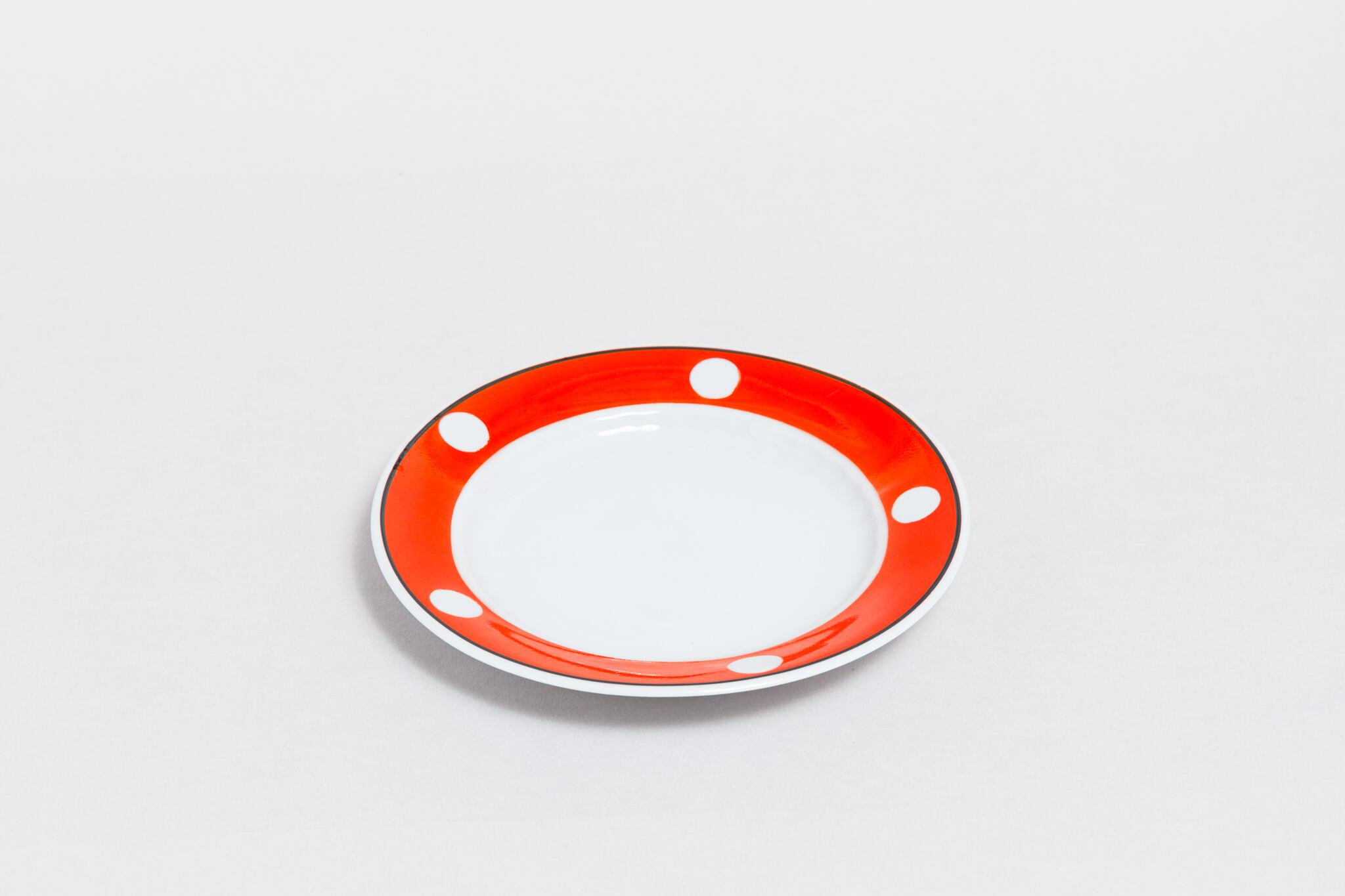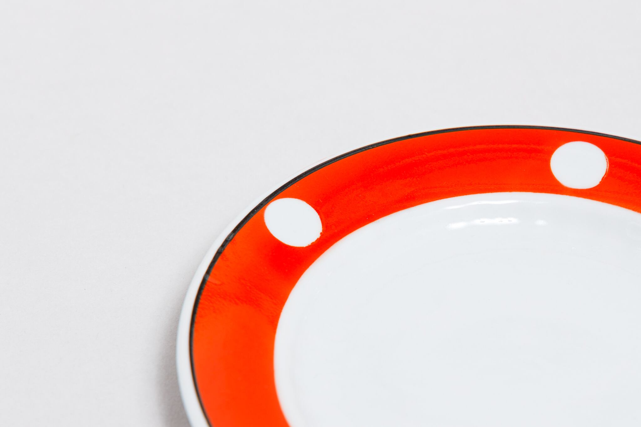 ヴィンテージのお皿です。旧ソ連時代に生産されました。朱色に大きな白の水玉柄が少し変わった配置で描かれています。縁と下に黒の線があり、シャープな感じがします。ウクライナのテルノーピリ磁器工場で1975-1991年に製造されました。0372のカップと同じ柄です。旧ソ連の市場で購入しました。