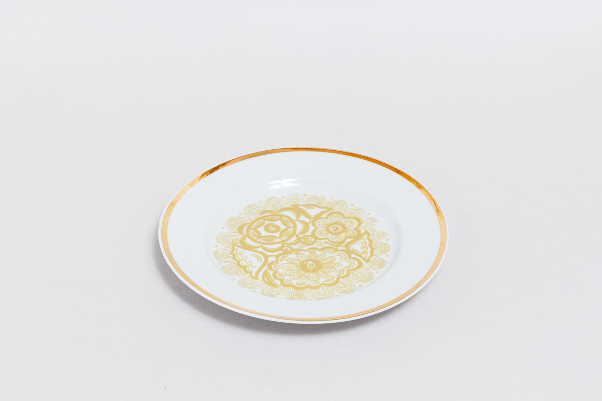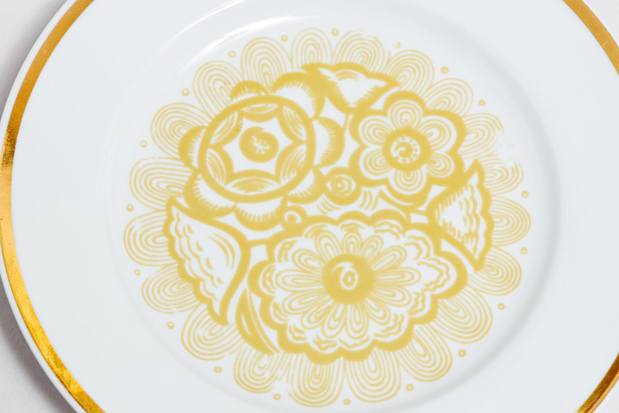旧ソ連時代に生産されたヴィンテージのお皿です。植物等をモチーフとした幾何学模様柄のレトロなプレートです。抽象化された花柄がインパクト抜群の素敵な一枚です。ソ連らしい独特な花柄図案です。黄土色の幾何学的柄がとてもおしゃれです。ロシアのノブゴロドのプロレターリ磁器工場で1967-1975年に製造されました。