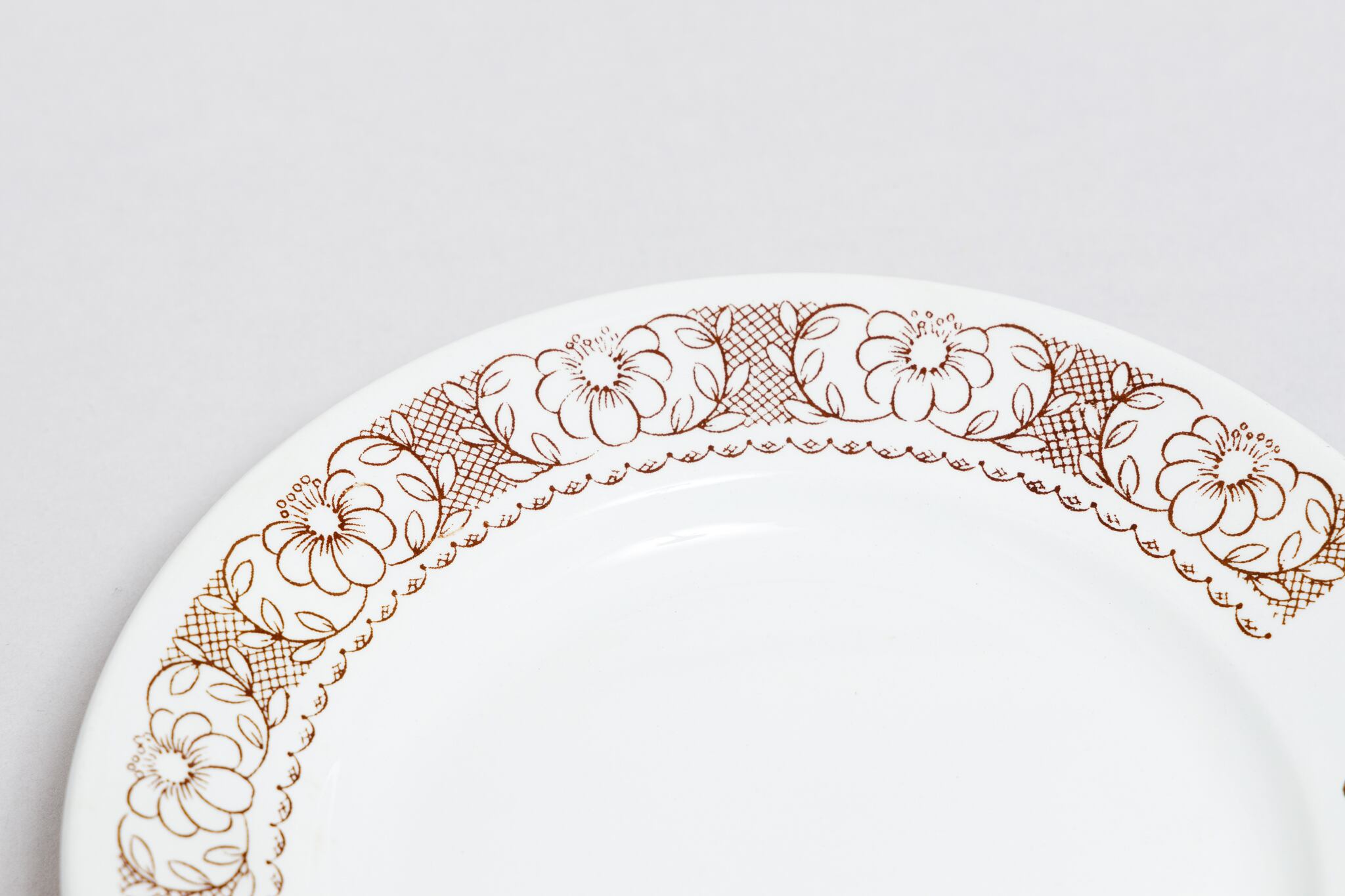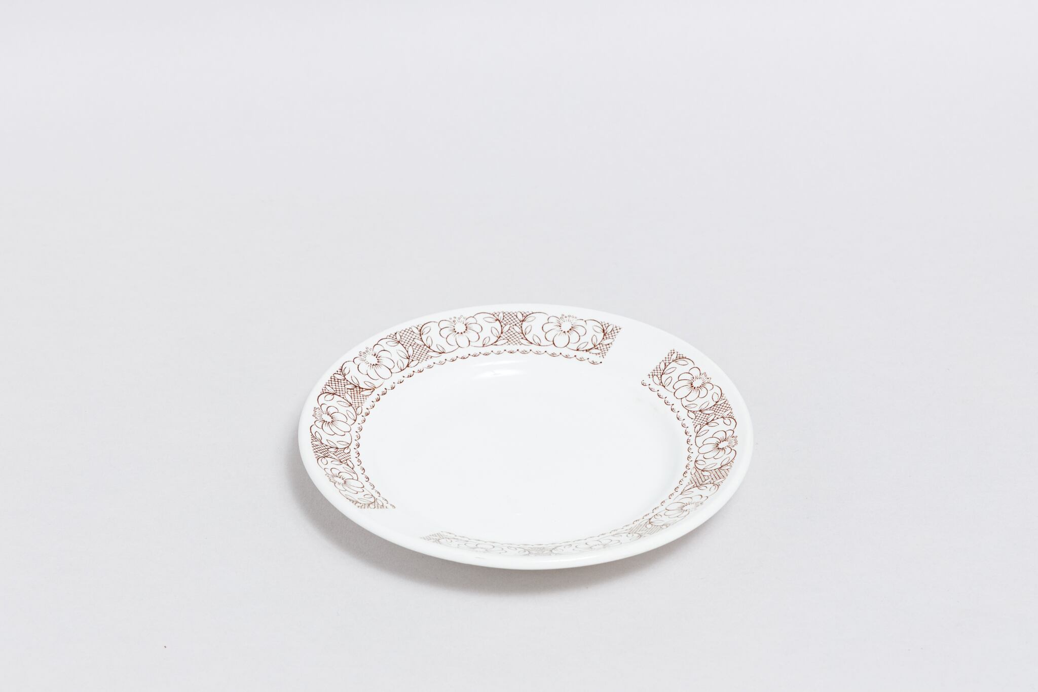 ヴィンテージのネットと花で構成された柄の皿です。デザートなどを入れるのにぴったりの大きさです。ロシアのトヴェリ州コナコヴォ陶器工場で1974-1991年に製造されました。茶色線でネット柄と花柄が描かれていて整然な感じの中にコナコヴァらしい優しい色合いと素朴さが見られます。旧ソ連の市場で購入しました。